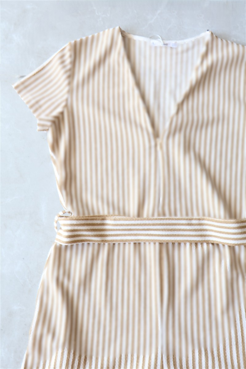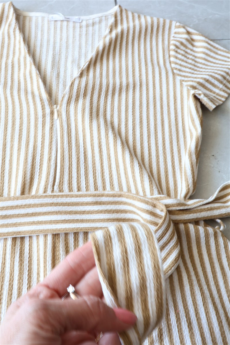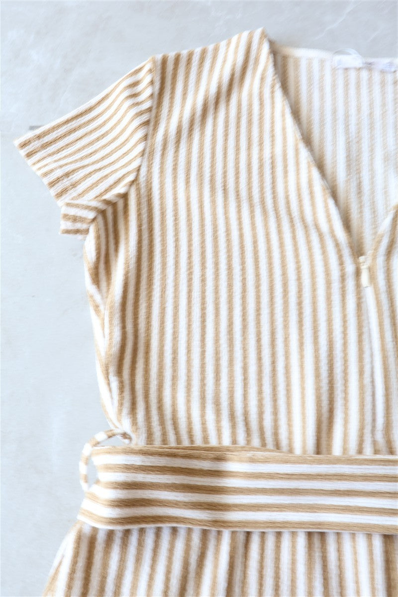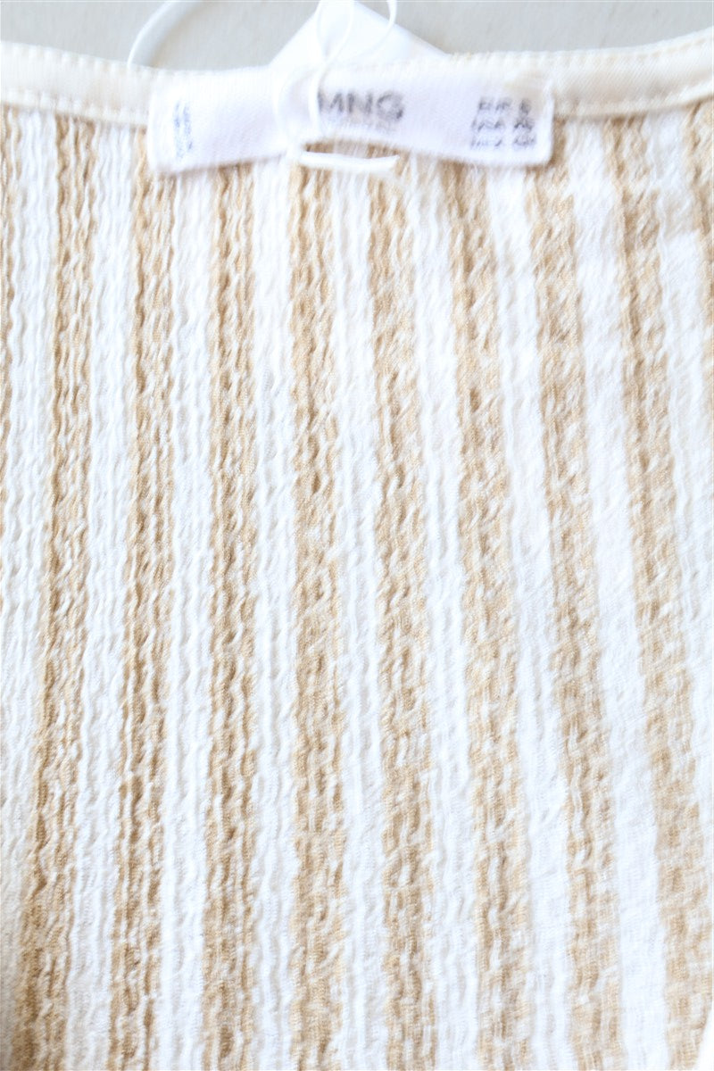 אוברול פסים בשמנת וכאמל של MANGO בגזרה רחבה, עם סגירת רוכסן מקדימה וחגורת קשירה תואמת, מבד מיקס סינטטי במרקם מעט מחוספס.