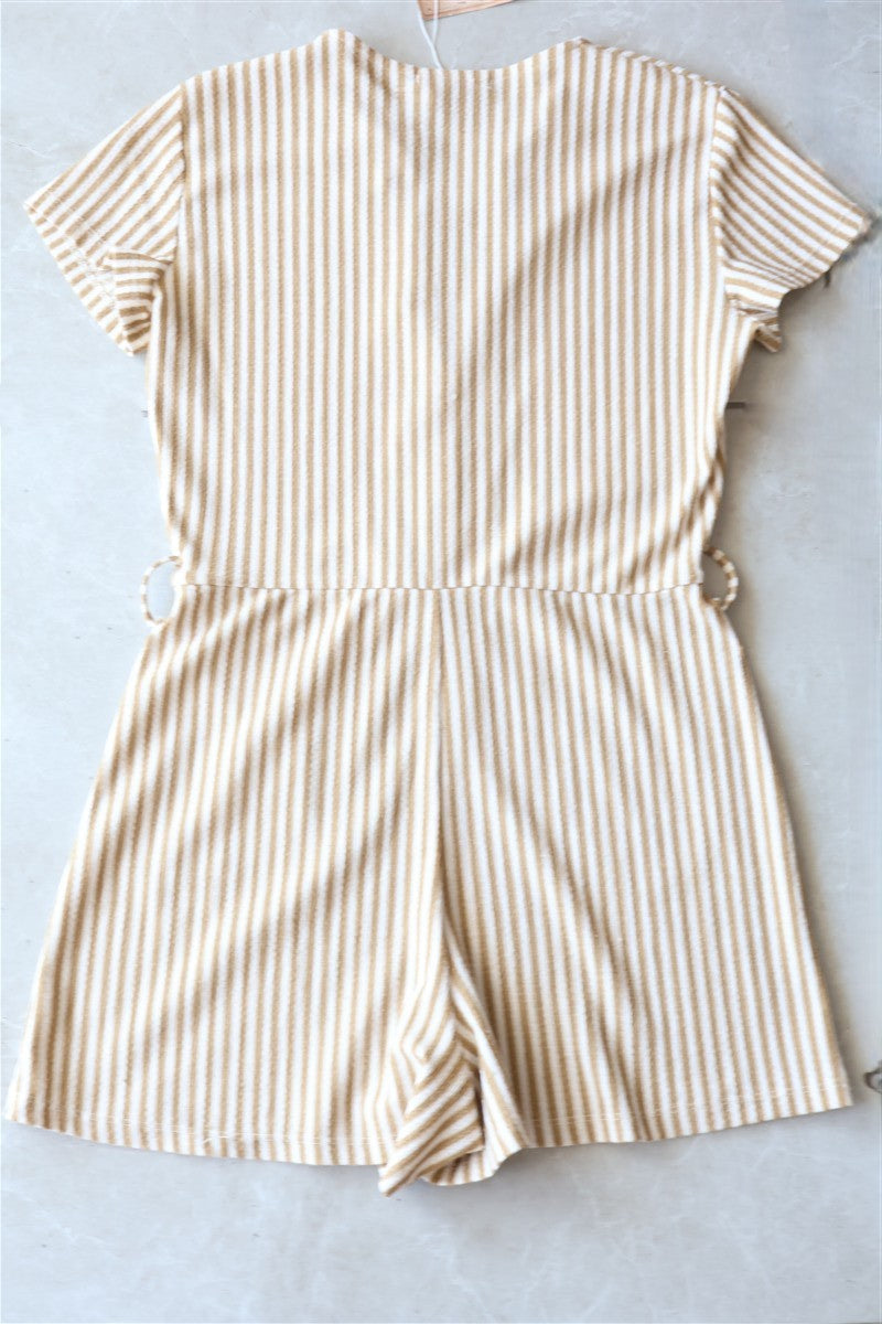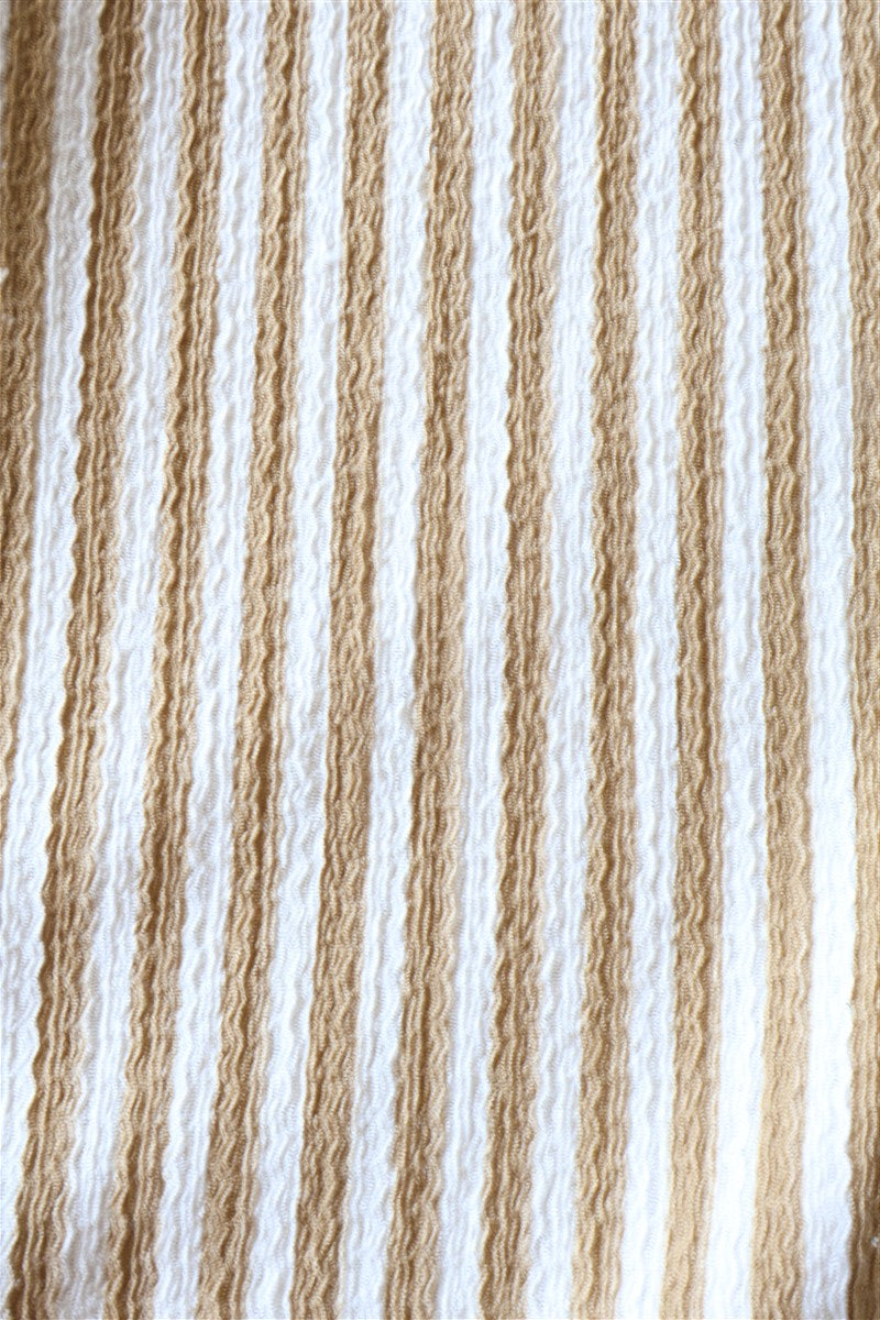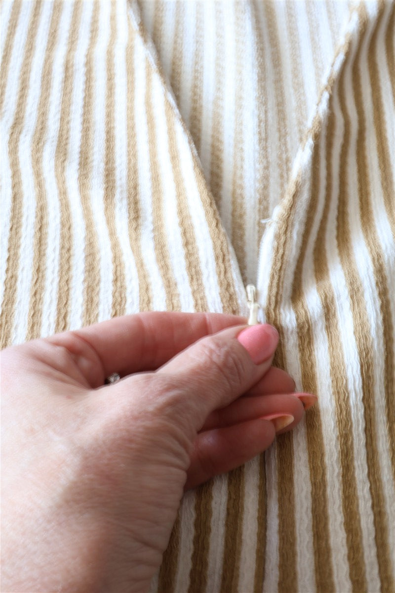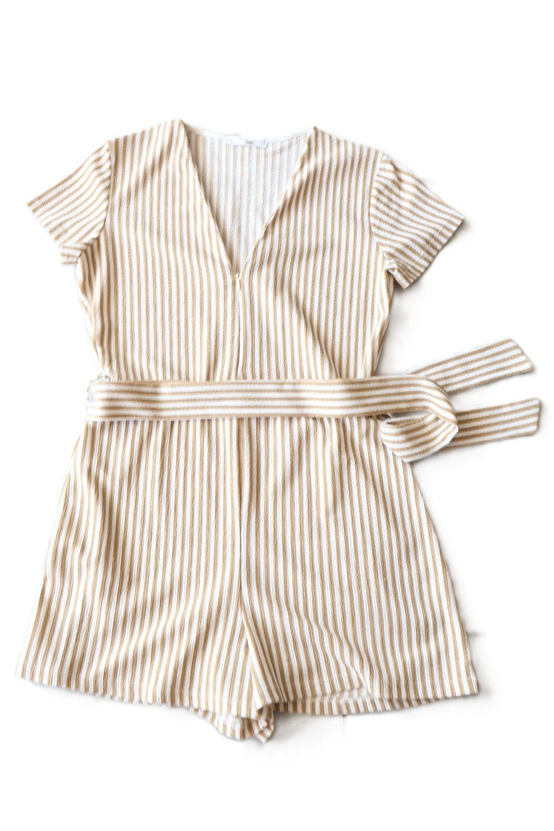אוברול פסים בשמנת וכאמל של MANGO בגזרה רחבה, עם סגירת רוכסן מקדימה וחגורת קשירה תואמת, מבד מיקס סינטטי במרקם מעט מחוספס.