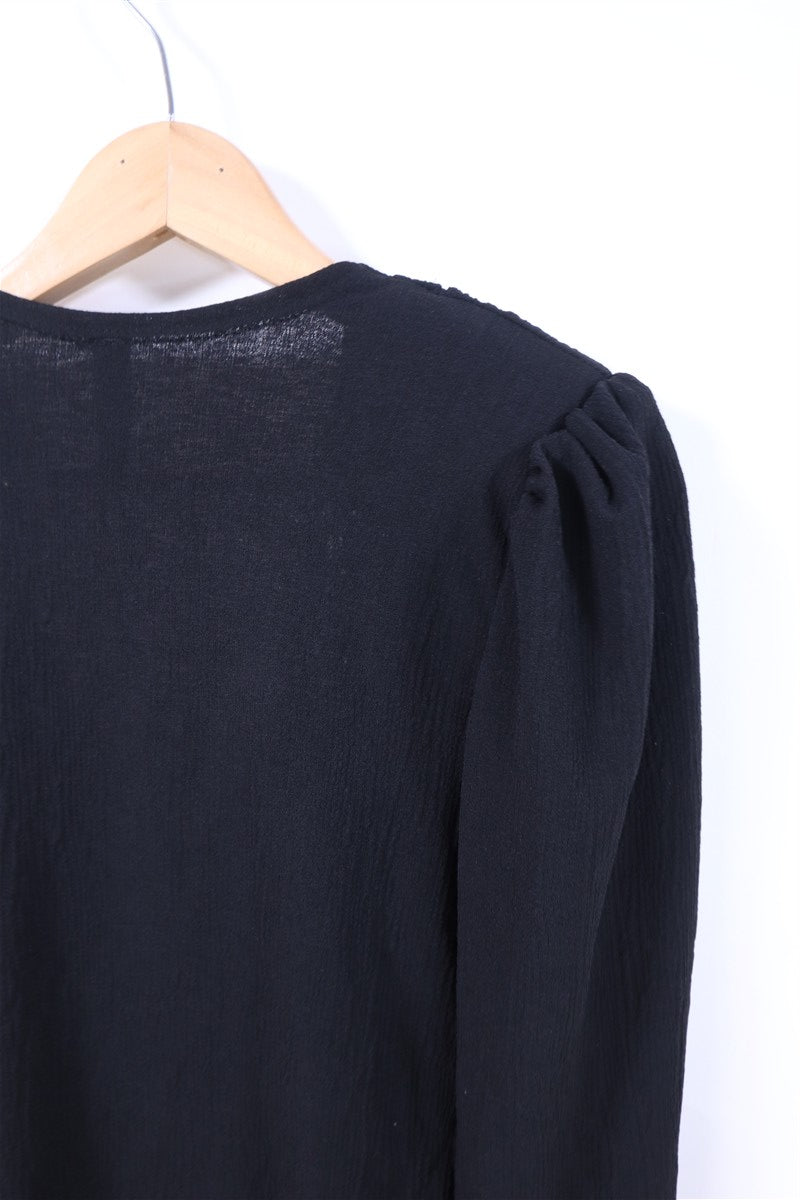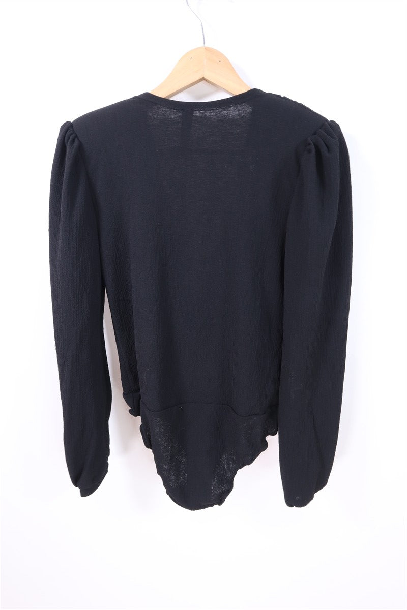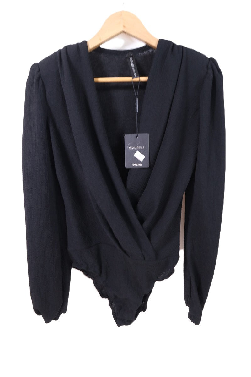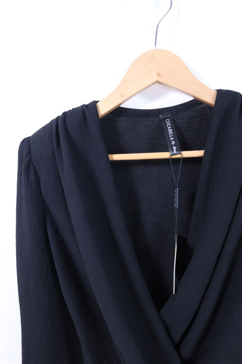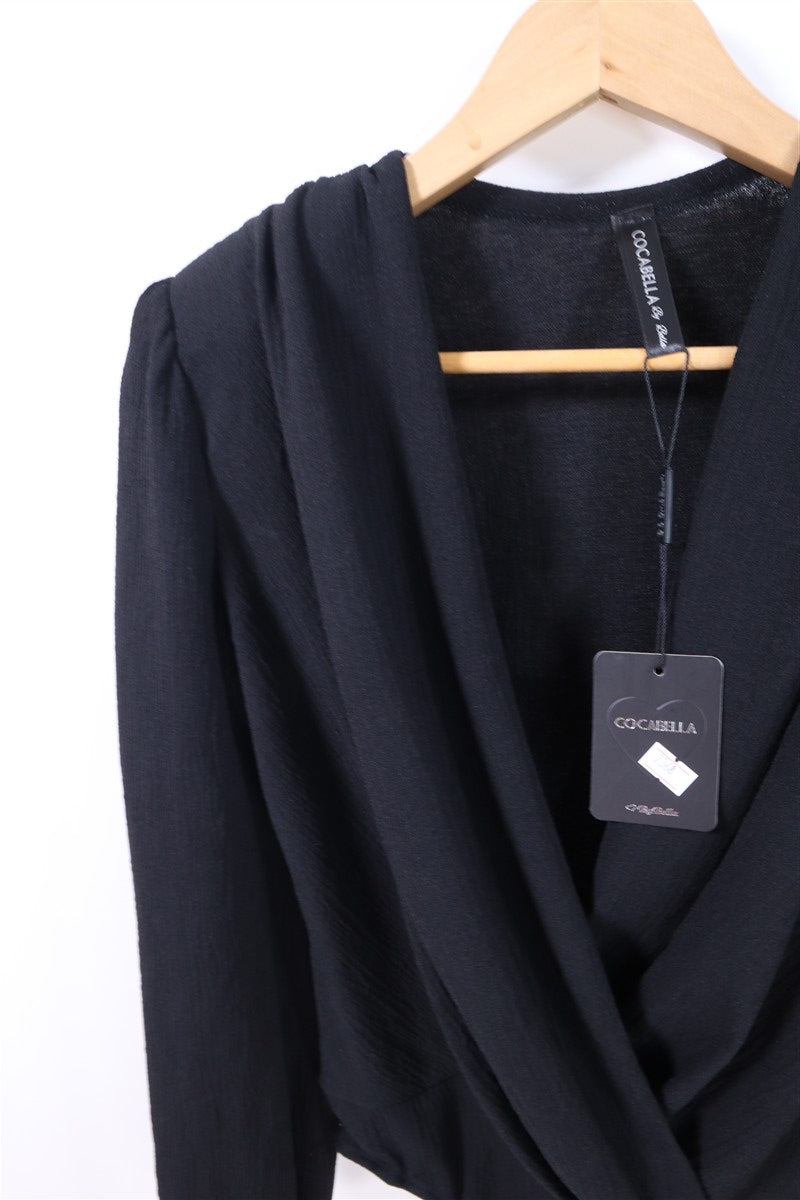 בגד גוף שחור וחדש עם הטיקט בגזרת מעטפת, עם סגירה תחתונה שם המותג COCABELLA מידה מוערכת M נפח בשרוולים וכריות בכתפיים בד במרקם קרפ אורך 72 ס"מ זה עד 105 ס"מ חדש עם הטיקט |