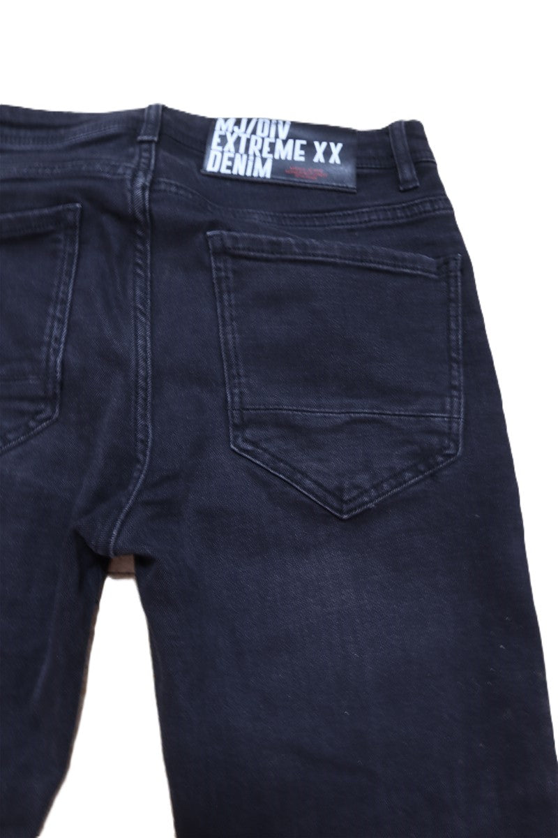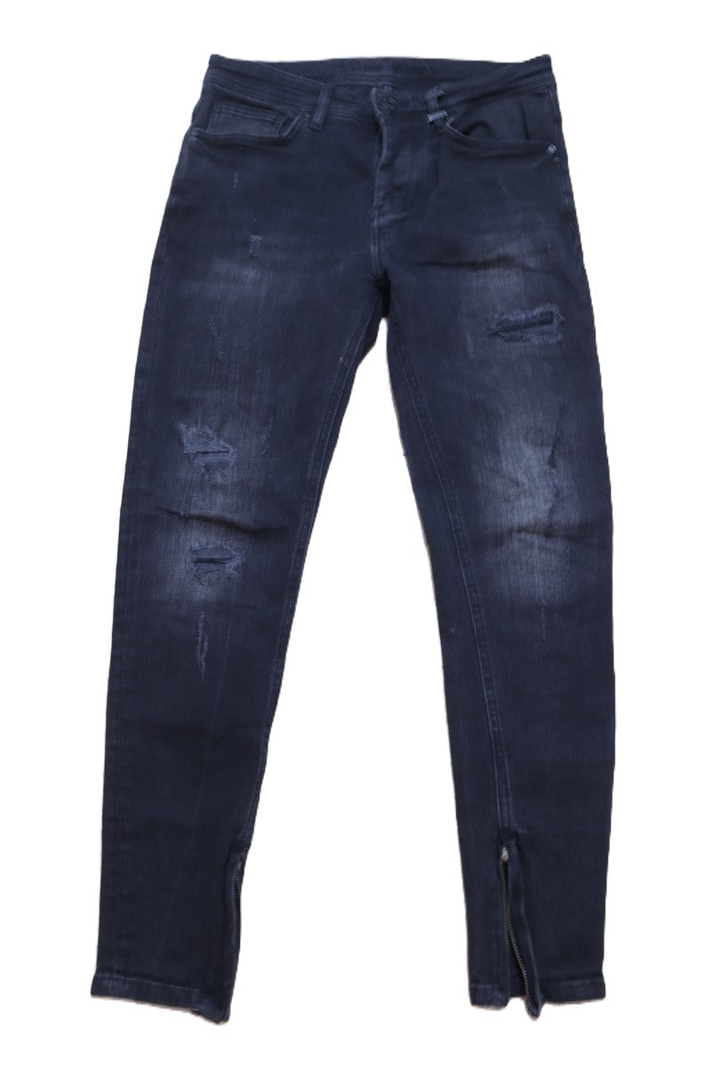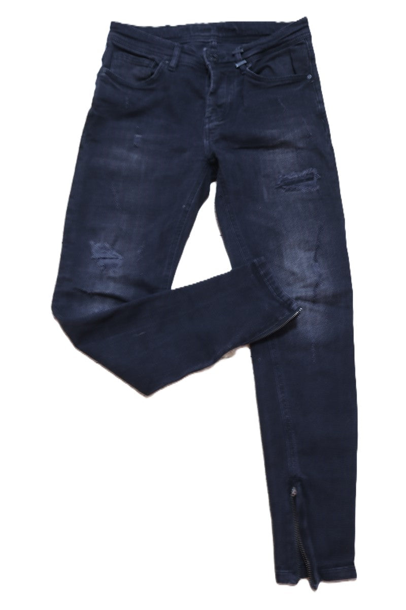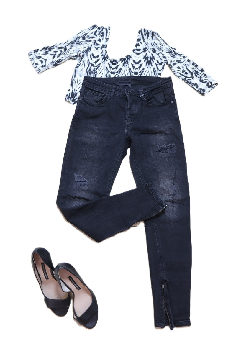 גינס סקיני שחור אפור קרעים ורוכסן בסיומת המכנסיים.