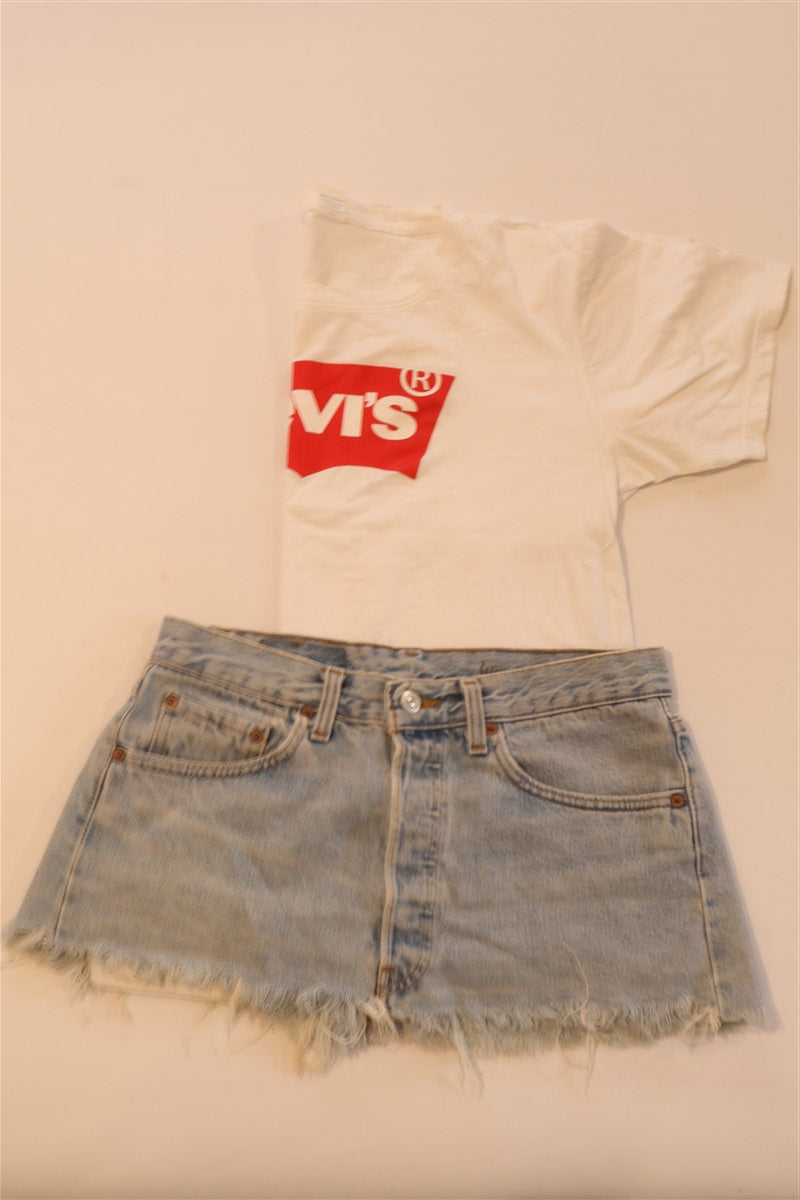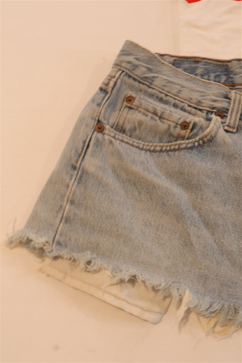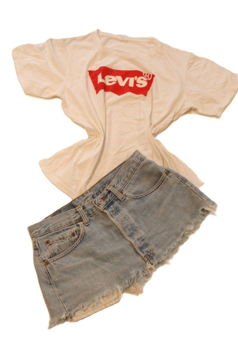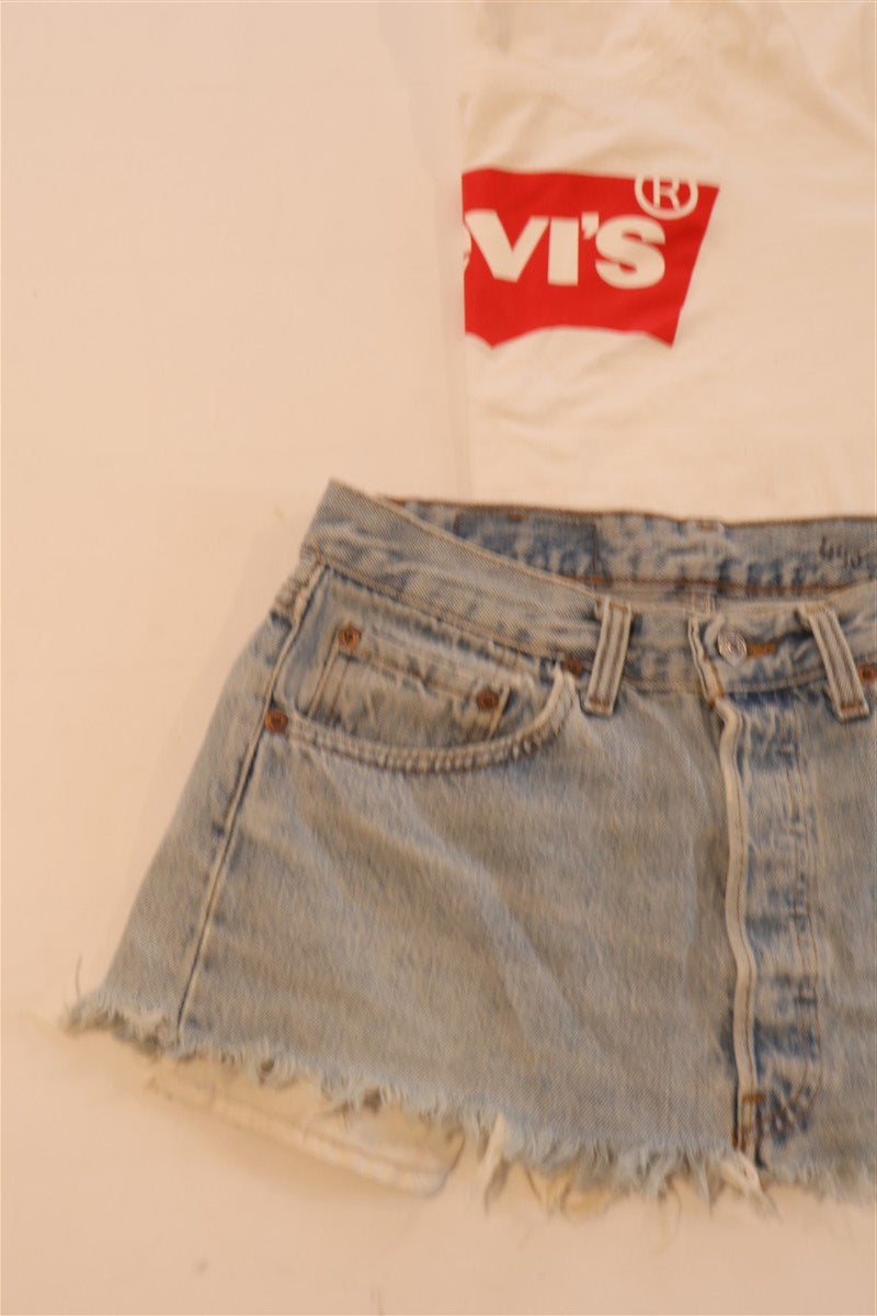חצאית ג'ינס מיני בכחול תכלת של LEVIS, דגם 501, שעוצבה ממכנסי ג'ינס ששודרגו לחצאית בגזרה נמוכה, עם שוליים פרומים בחלק התחתון.