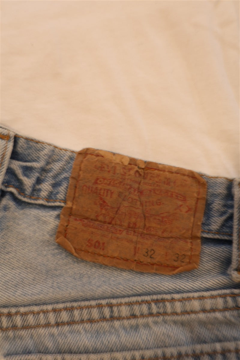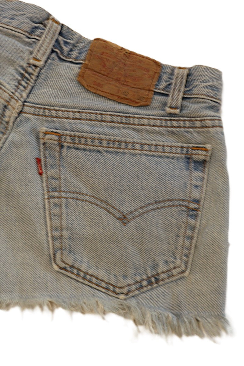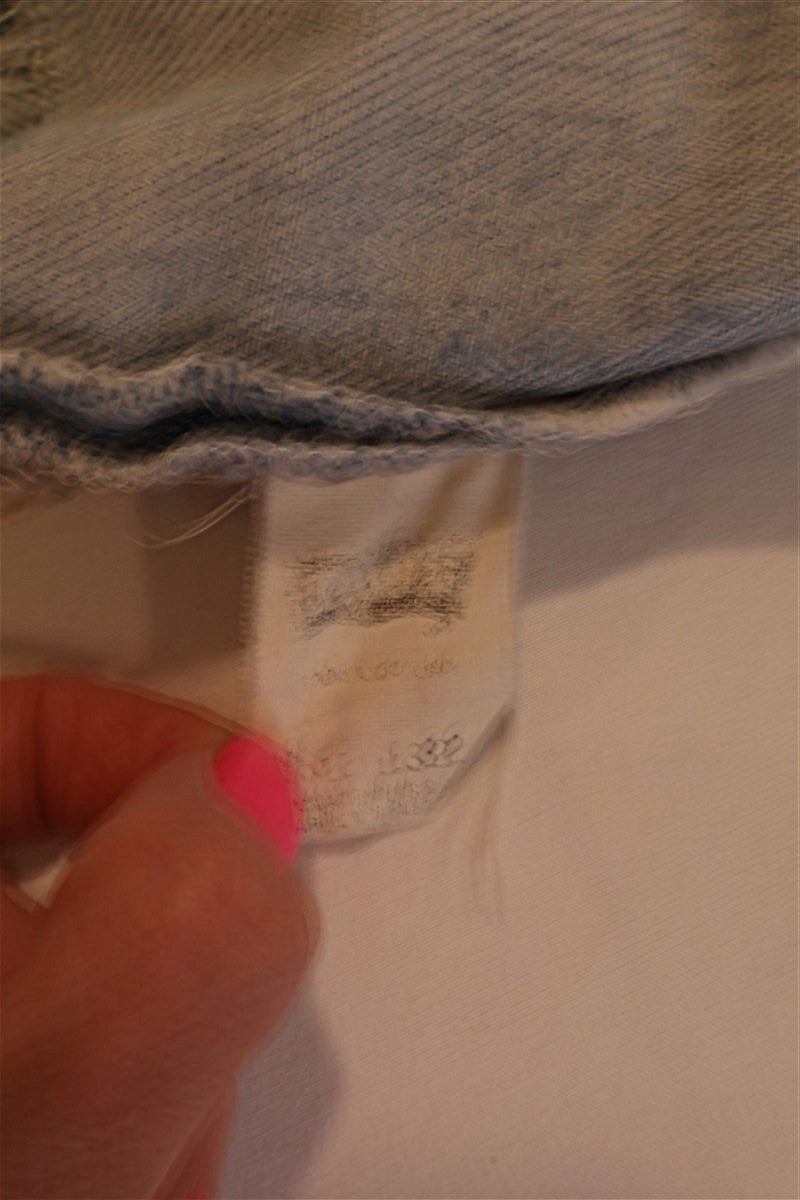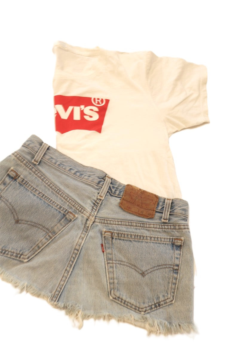 חצאית ג'ינס מיני בכחול תכלת של LEVIS, דגם 501, שעוצבה ממכנסי ג'ינס ששודרגו לחצאית בגזרה נמוכה, עם שוליים פרומים בחלק התחתון.