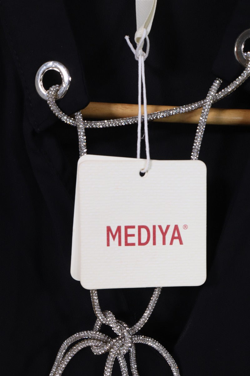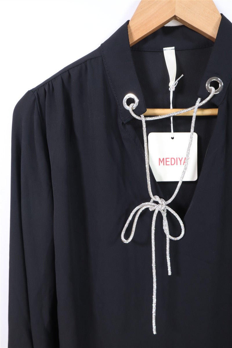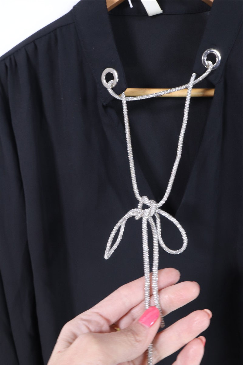 חולצה אלגנטית בסטייל נשפך בצבע שחור עם מפתח מעוצב וחגיגי מעוטר בשרוך ניטים מנצנצים באפור