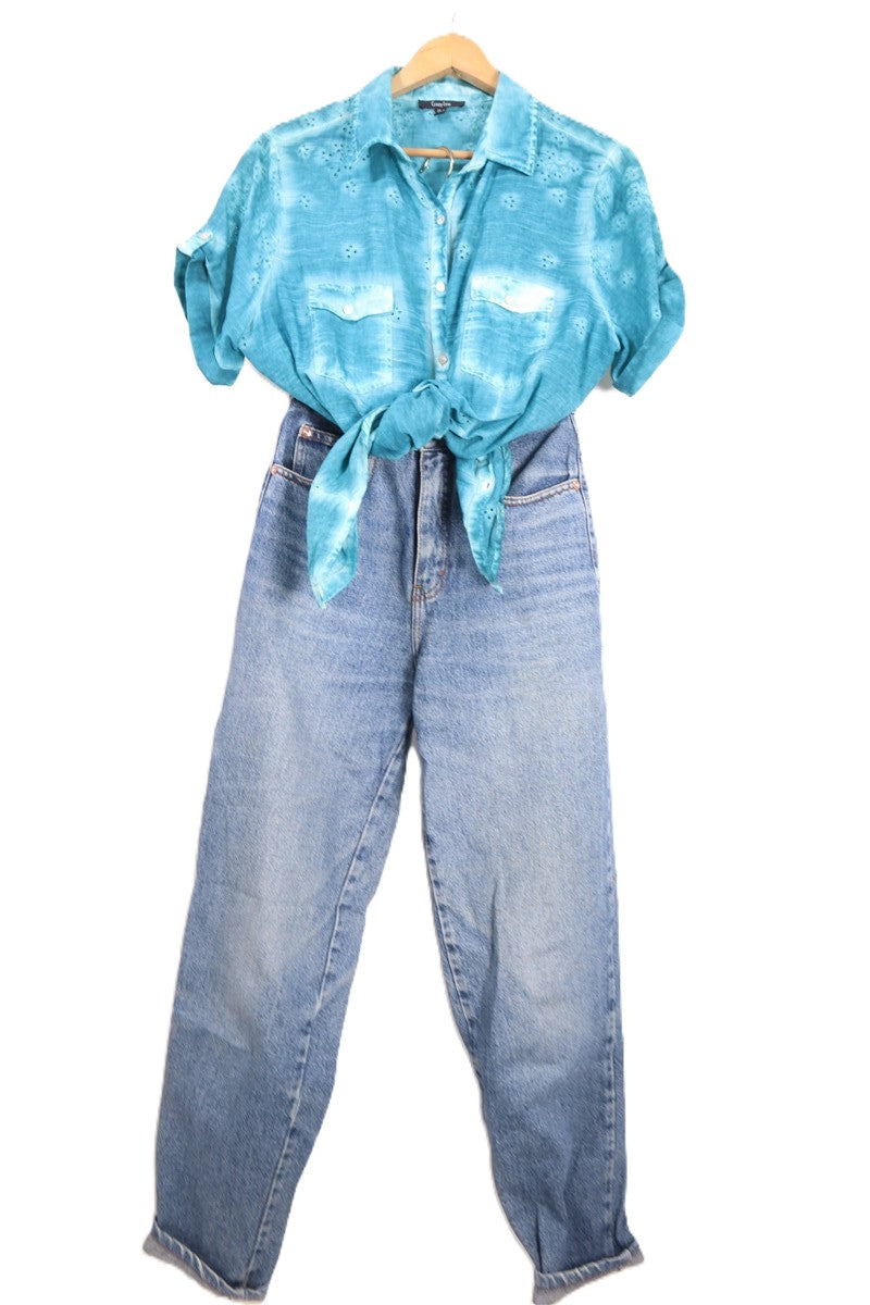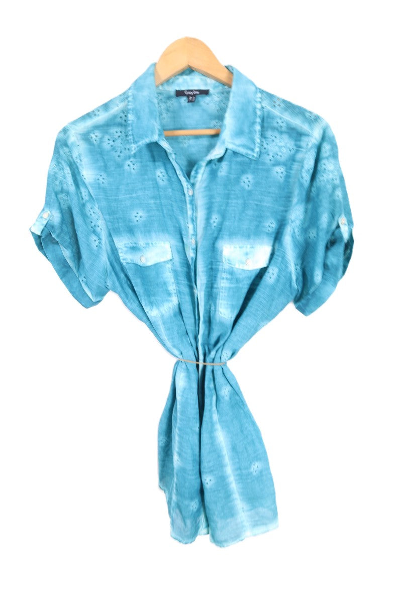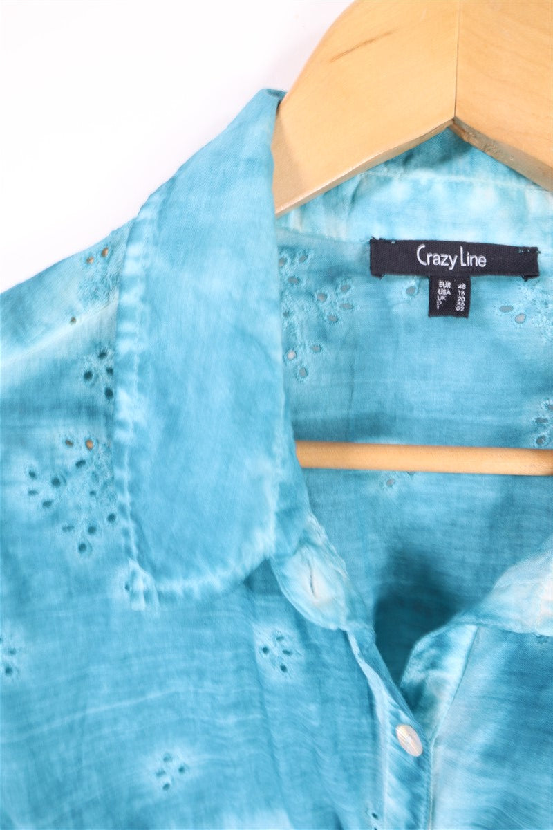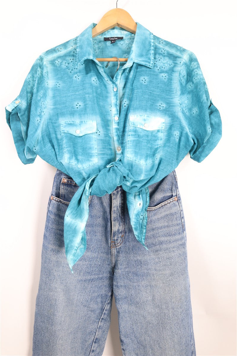 חולצה מכופתרת וקצרה בצבע תכלת טורקיז בסגנון אומברה עם שילוב קרושה וכפתורים עדינים כיס מקדימה. שם המותג CRAZY LINE מידה 48 הרכב בד טבעי במגע אורך 73 ס"מ היקף חזה עד 130 ס"מ |