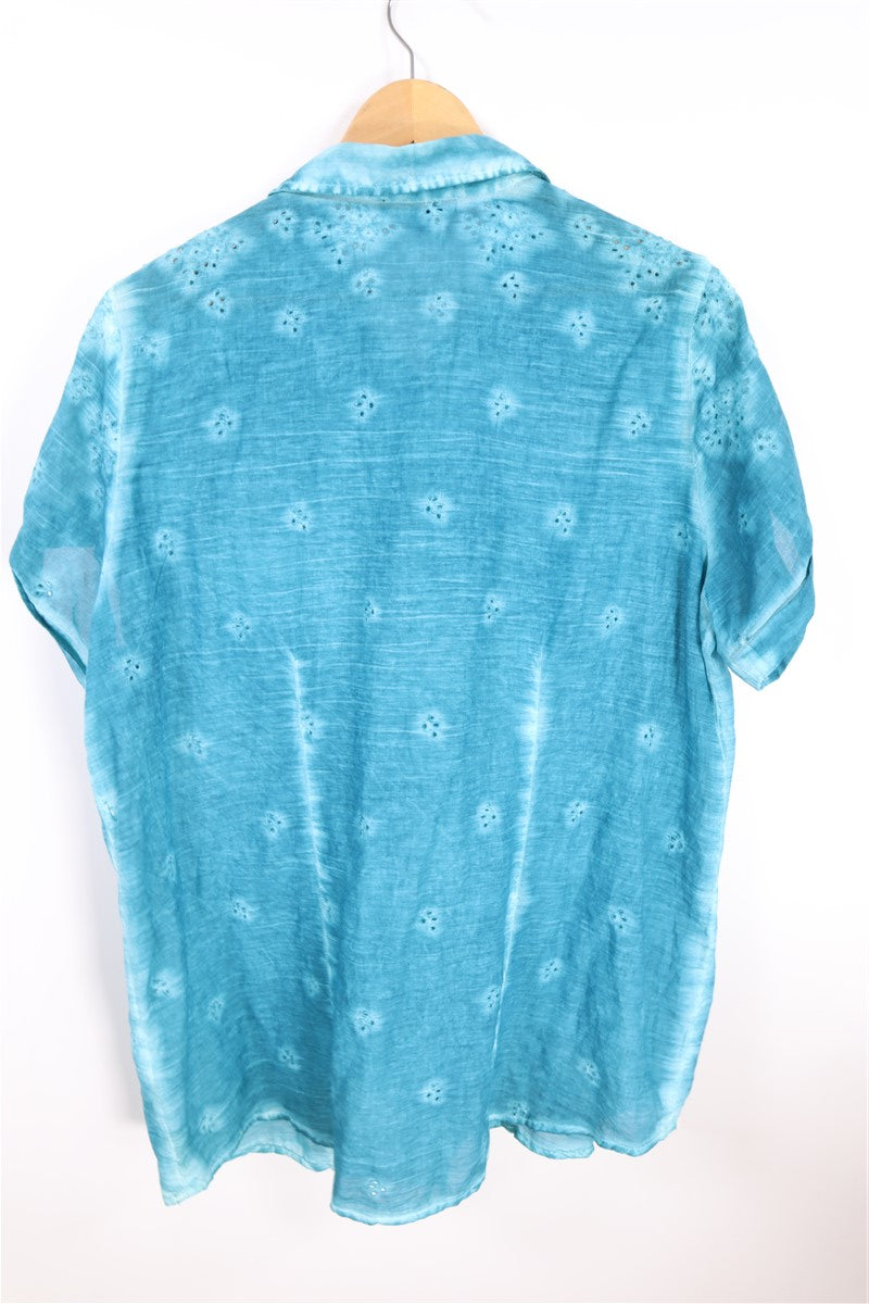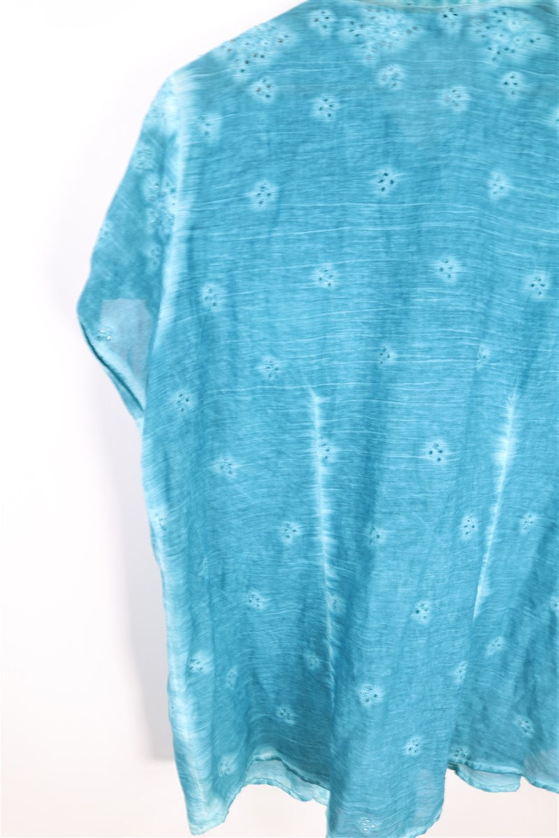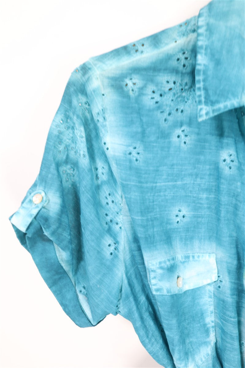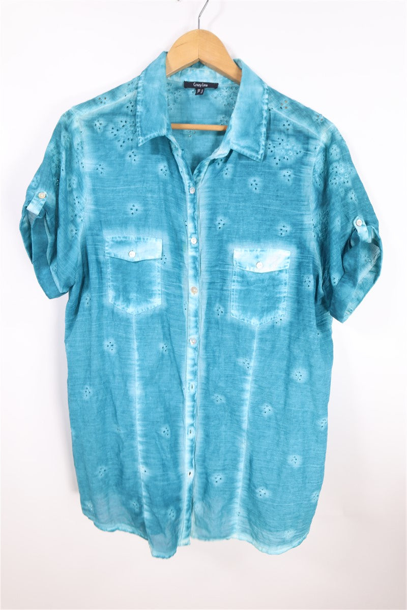 חולצה מכופתרת וקצרה בצבע תכלת טורקיז בסגנון אומברה עם שילוב קרושה וכפתורים עדינים כיס מקדימה. שם המותג CRAZY LINE מידה 48 הרכב בד טבעי במגע אורך 73 ס"מ היקף חזה עד 130 ס"מ |