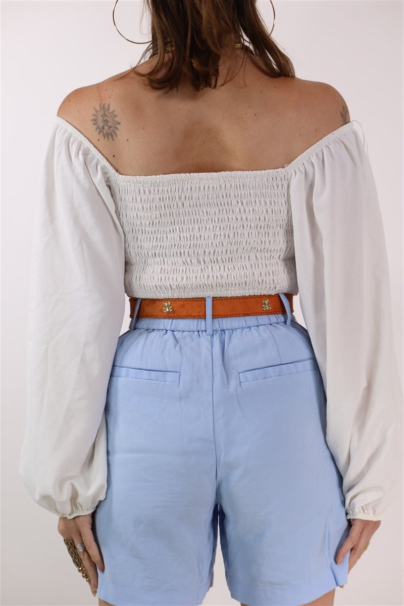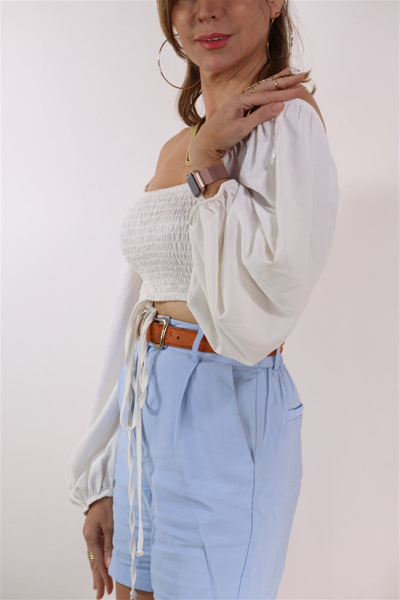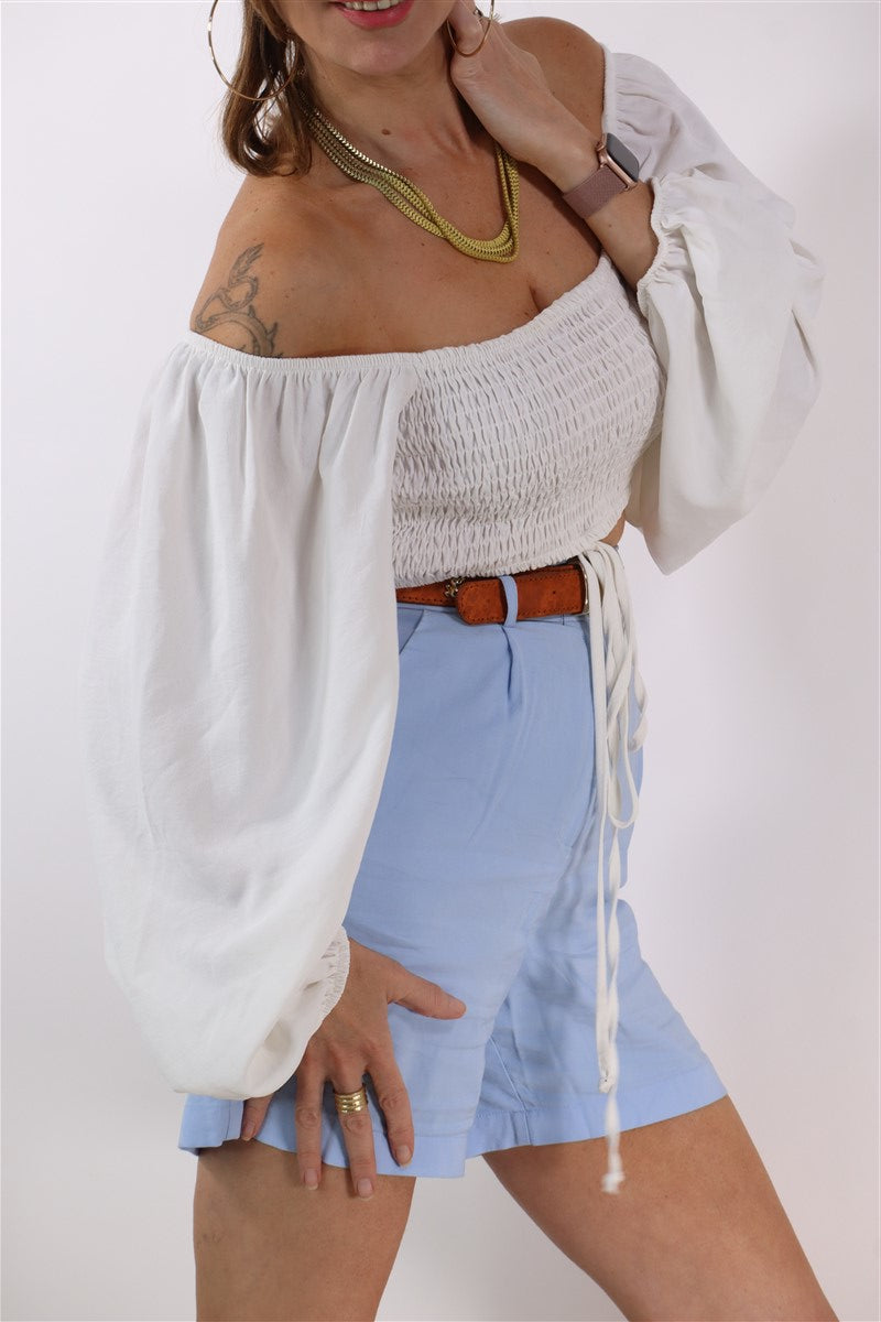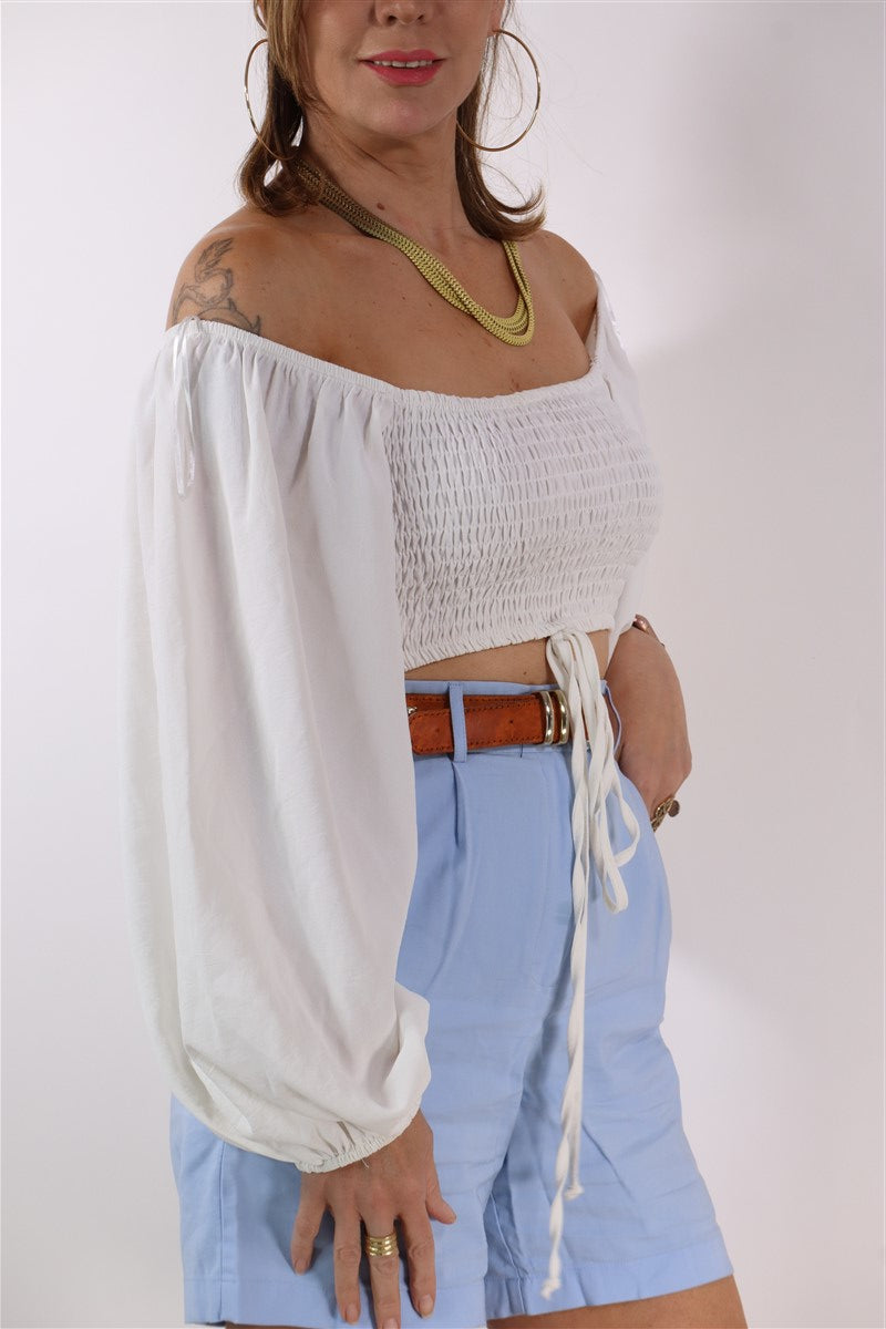 חולצה לבנה מעוצבת עם שרוולים תפוחים ומעט שקופים