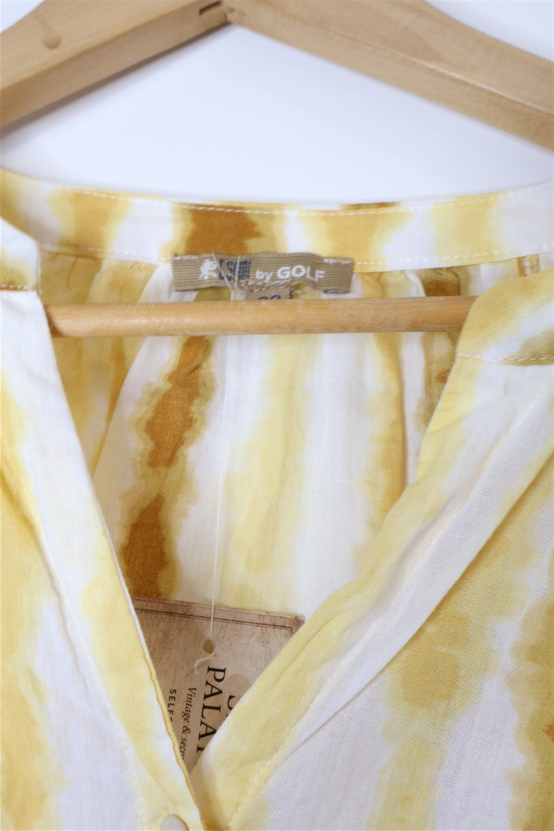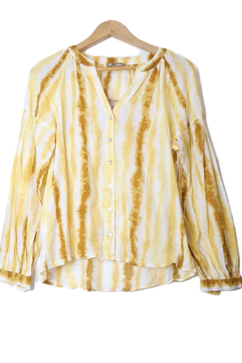 חולצה מכופתרת מבד  טבעי ומעוצבת בצבע צהוב בסטייל כתמי צבע