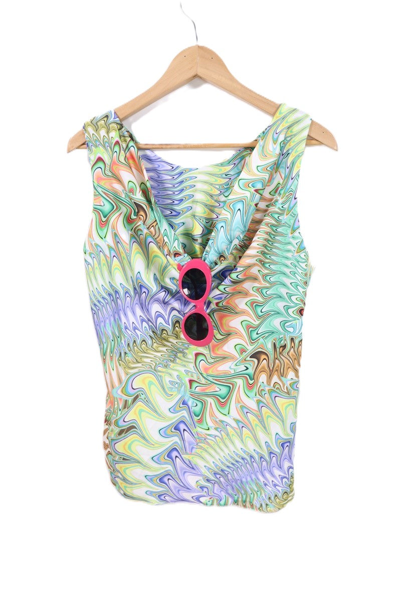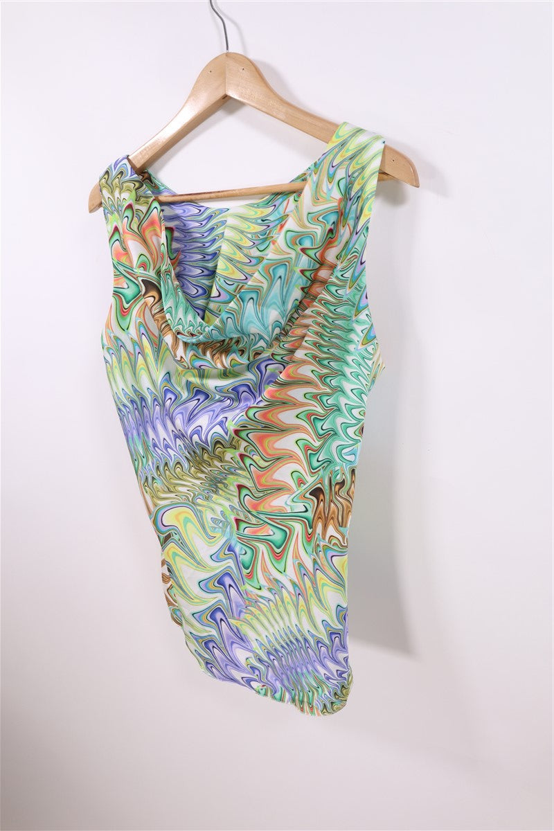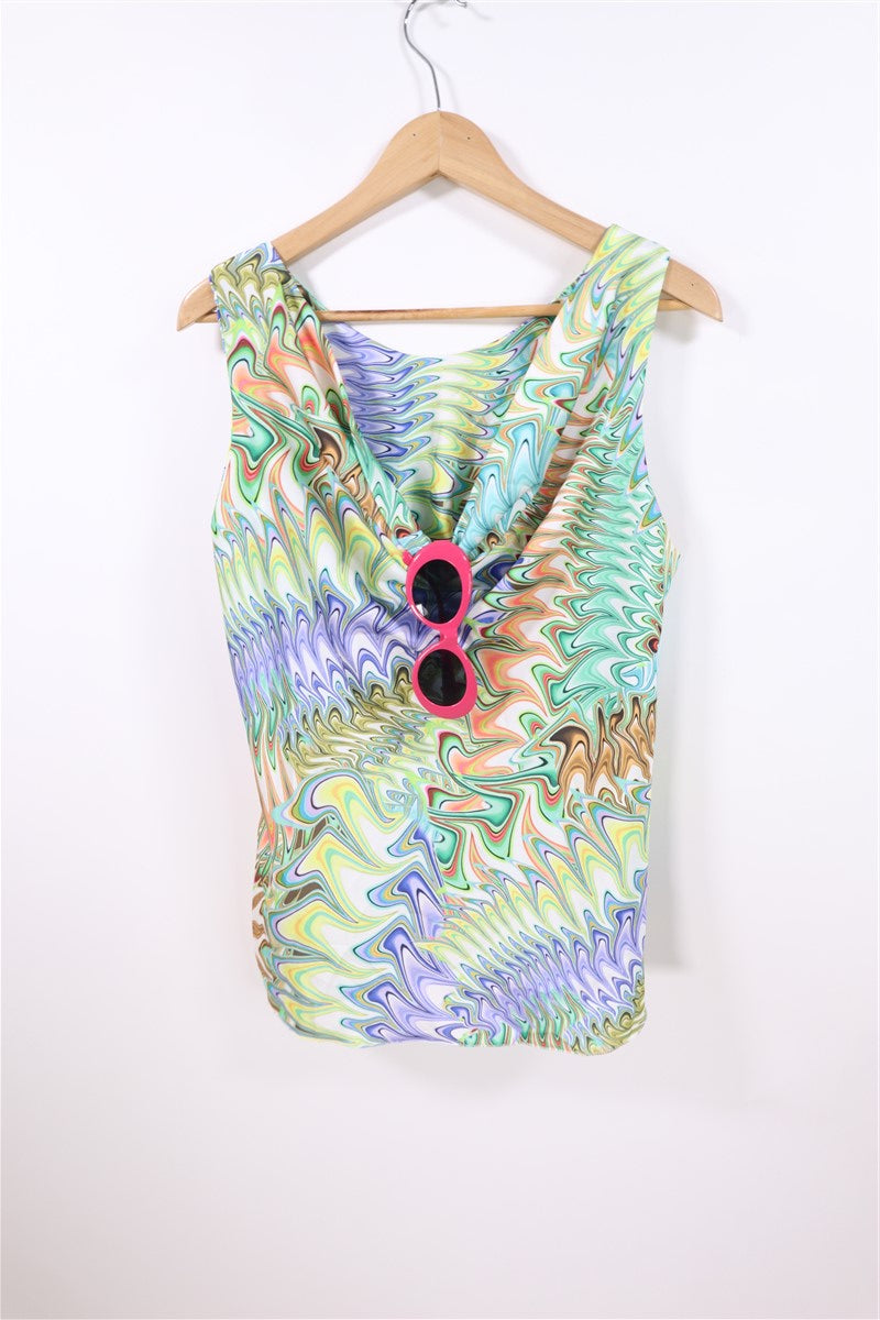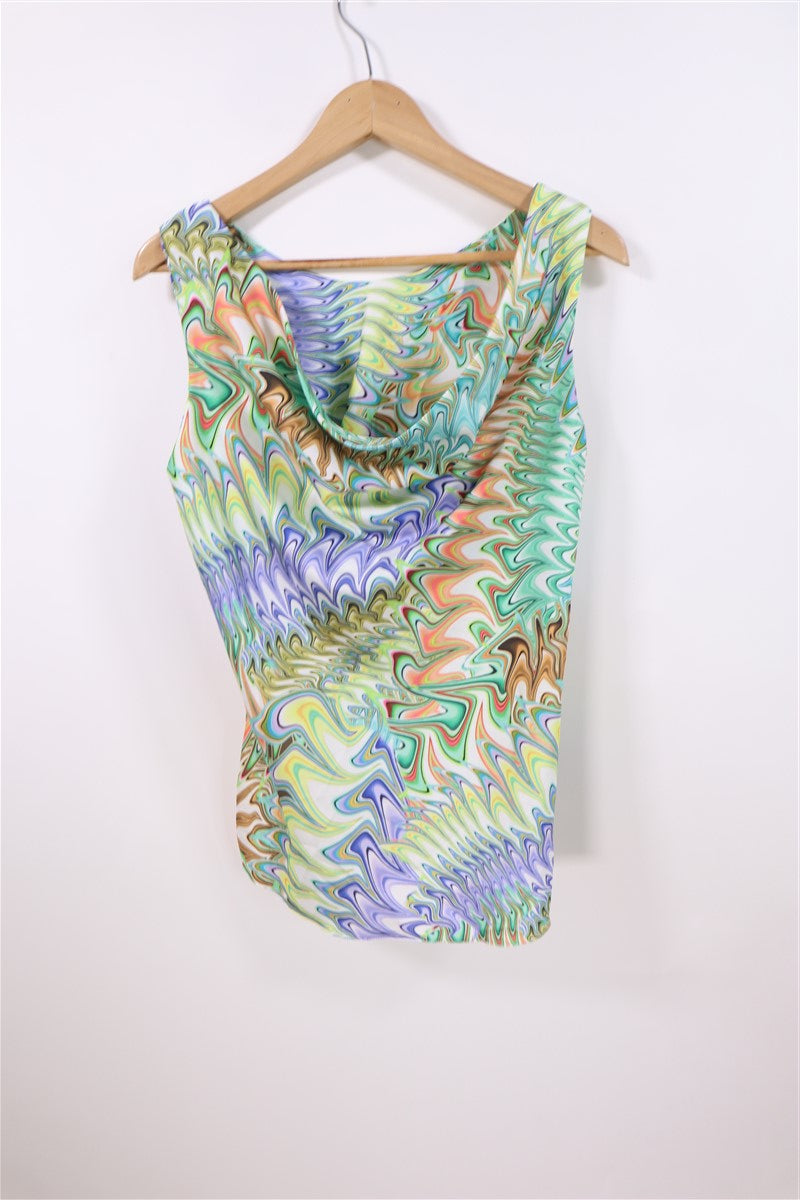 חולצה נשפכת וקצרה בסגנון רטרו בפרינט גאומטרי וצבעוני עם מפתח קדמי נשפך ומעוצב. ללא שם המותג מידה מוערכת M תתאים עד מידה 40 הרכב בד סינטטי במגע אורך 66 ס"מ היקף חזה עד 108 ס"מ |
