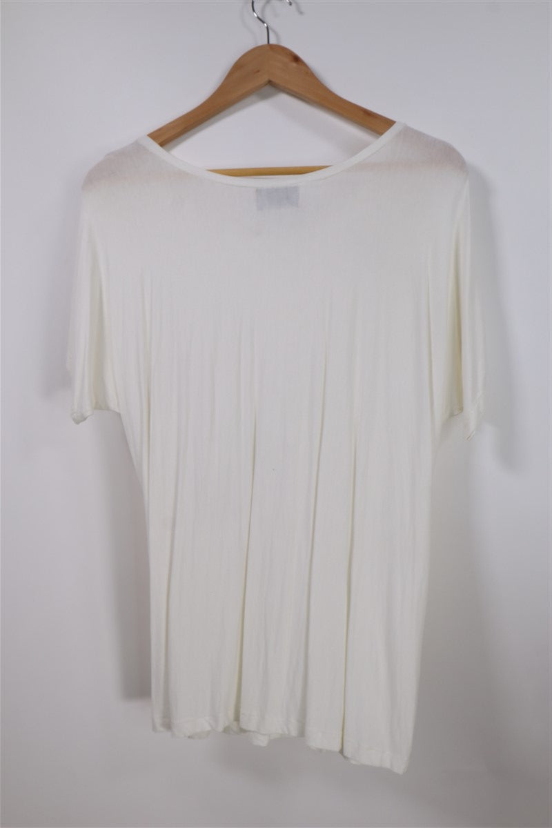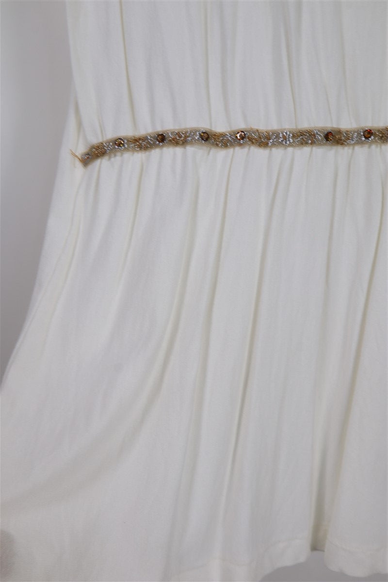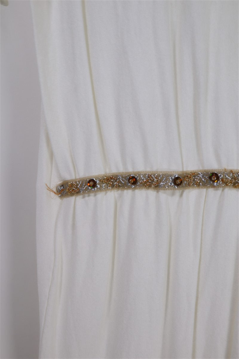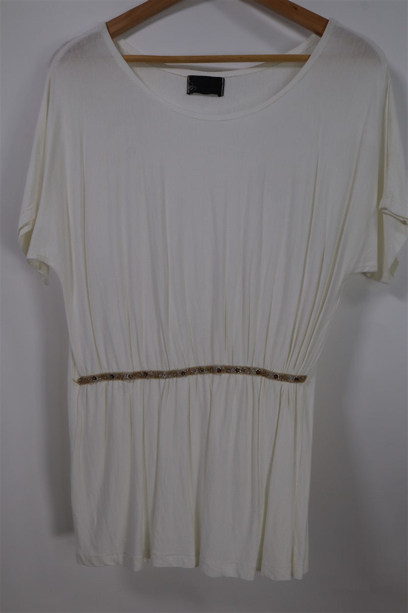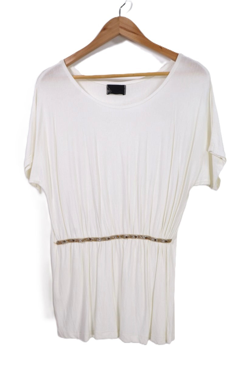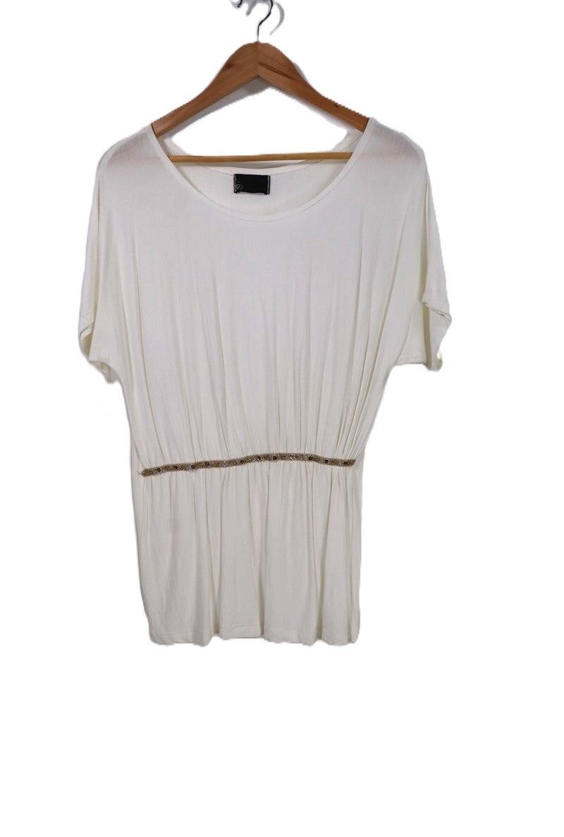 חולצה נשפכת וקצרה בצבע שמנת עם עיטור עדין של פס פייטים וחרוזים בגוון חום זהוב ללא שם המותג מידה או הרכב בד במגע בד טבעי מידה מוערכת עד מדיום אורך 65 ס"מ היקף חזה עד 105 ס"מ |