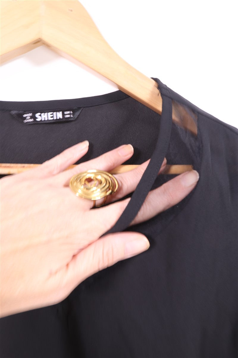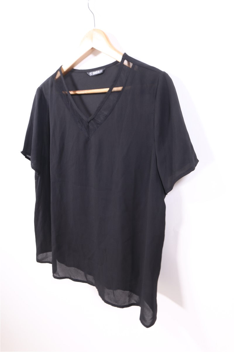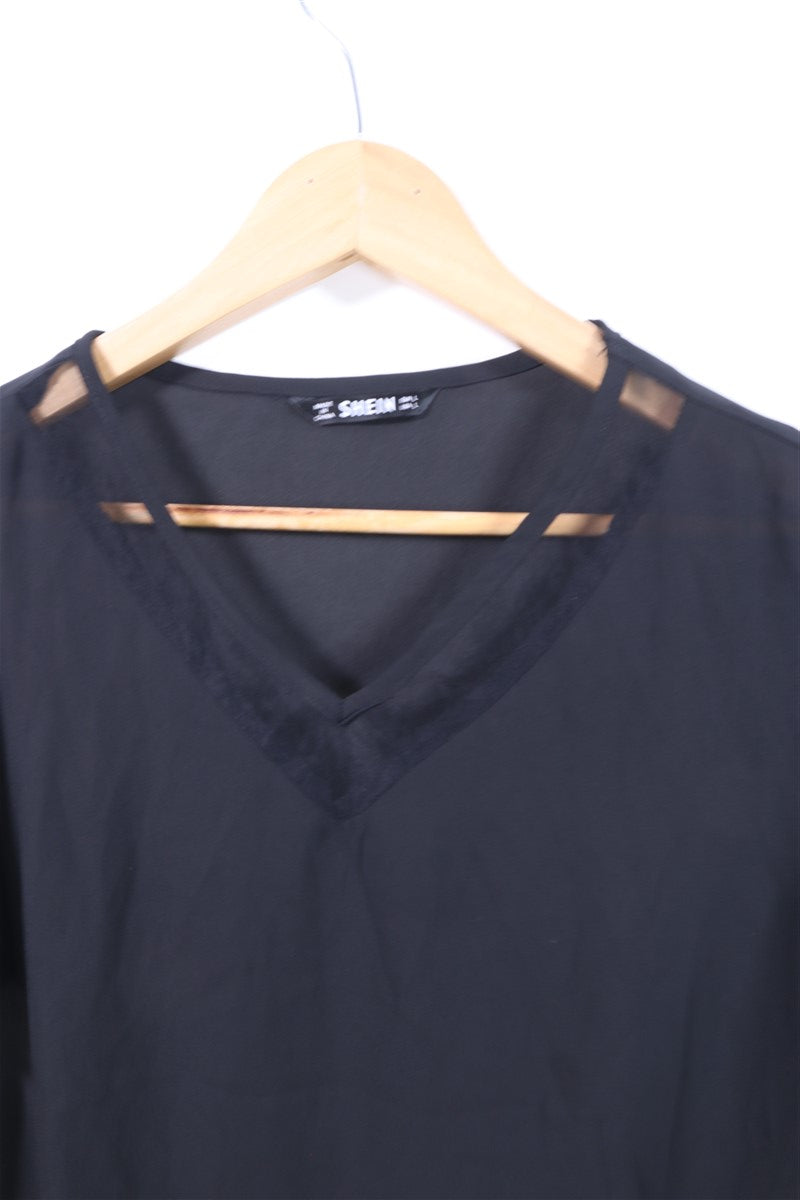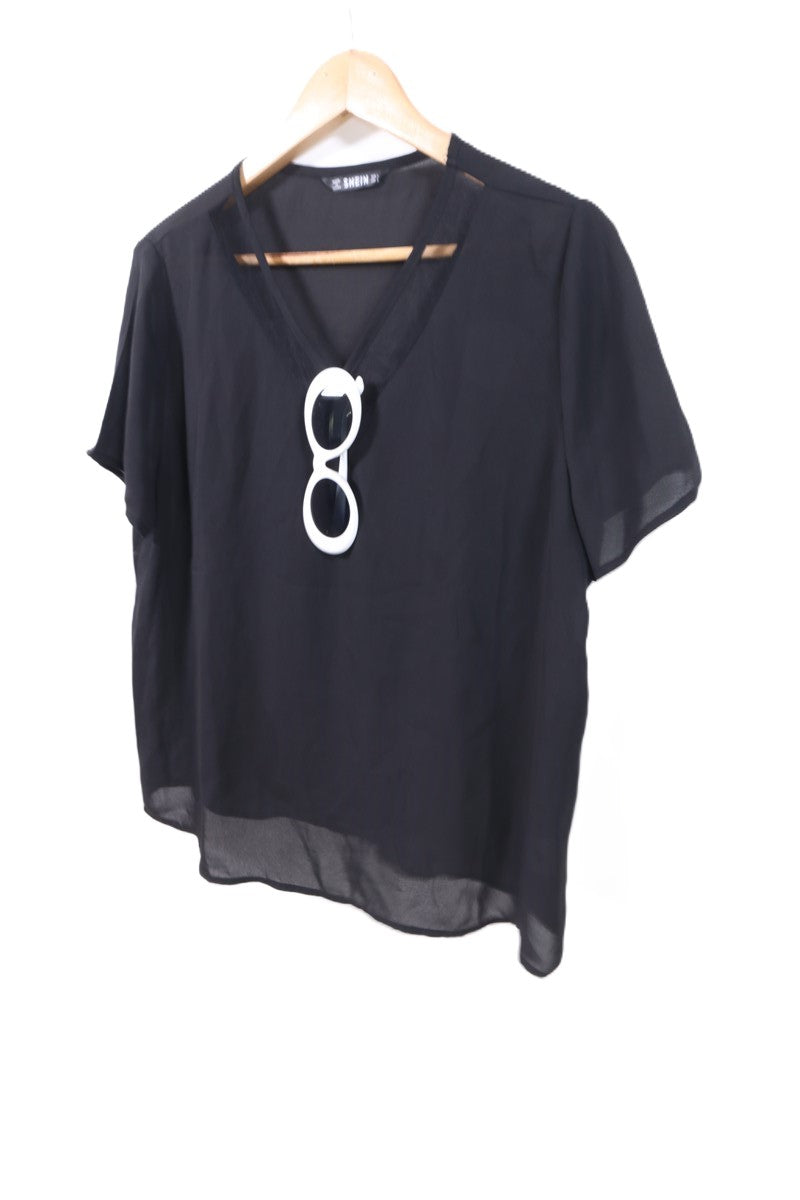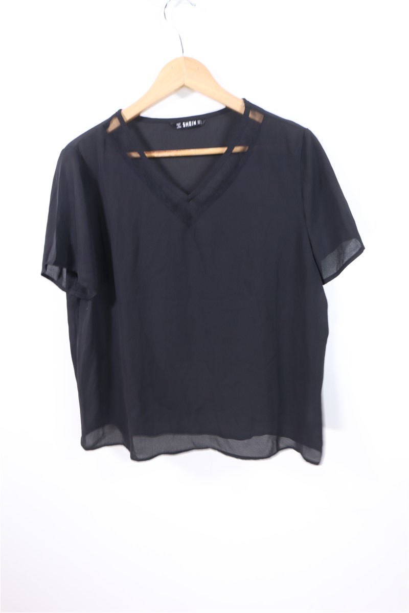 חולצה נשפכת וקצרה בשחור עם צווארון וי מעוצב עם רשת שקופה סביב שם המותג SHEIN מידה רשומה L הרכב בד סינטטי אורך 63 ס"מ היקף חזה עד 110 ס"מ |