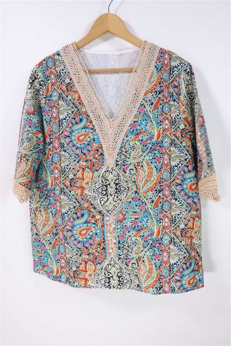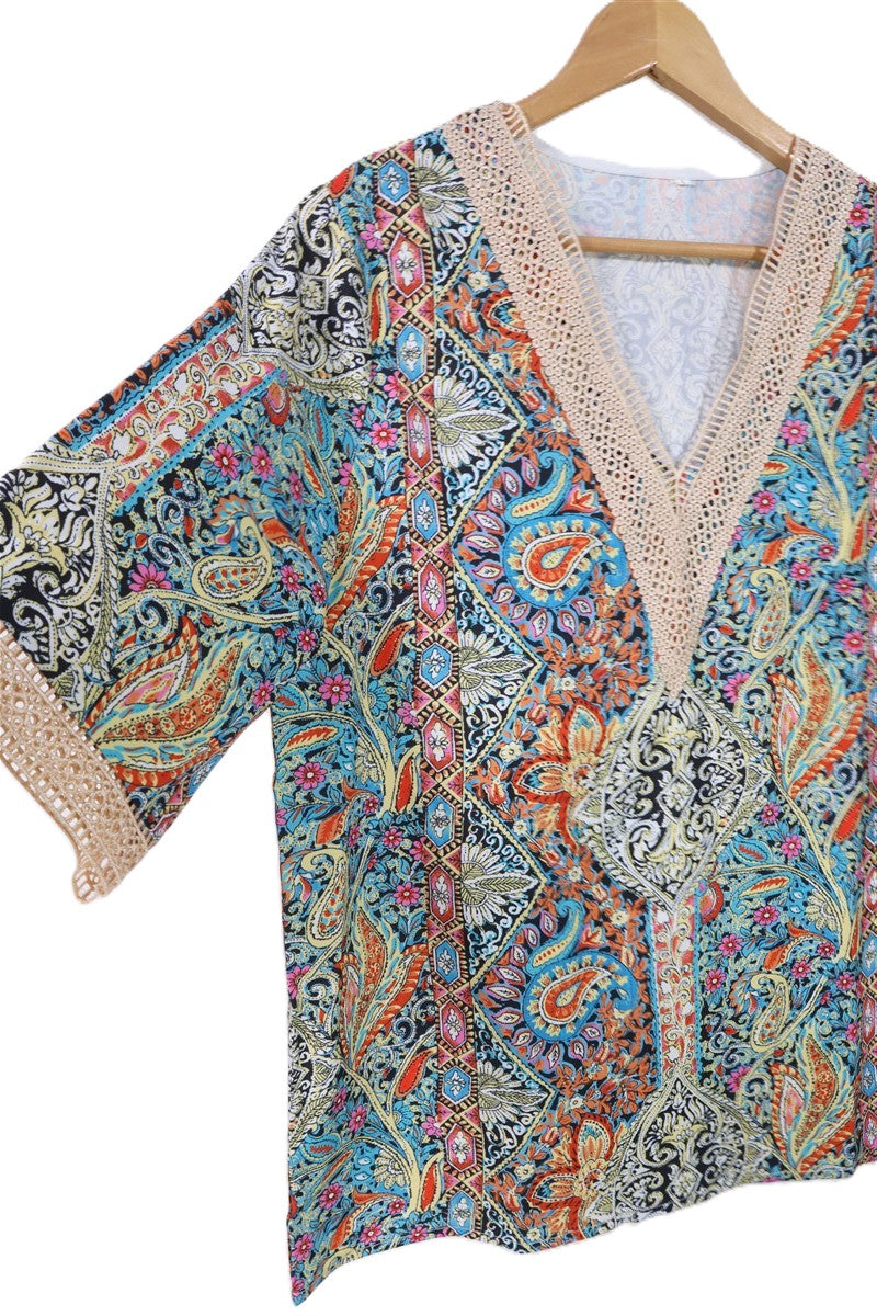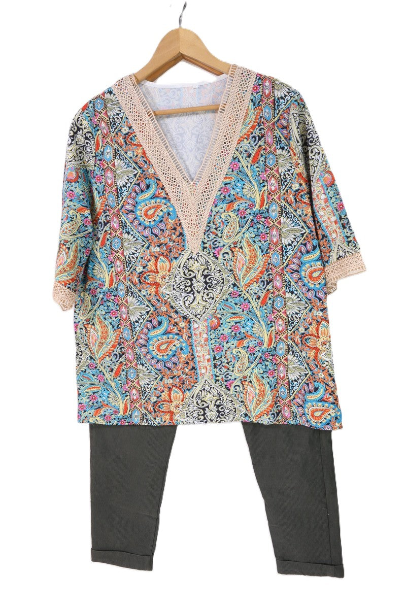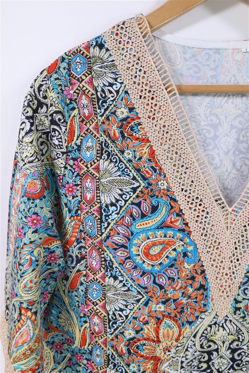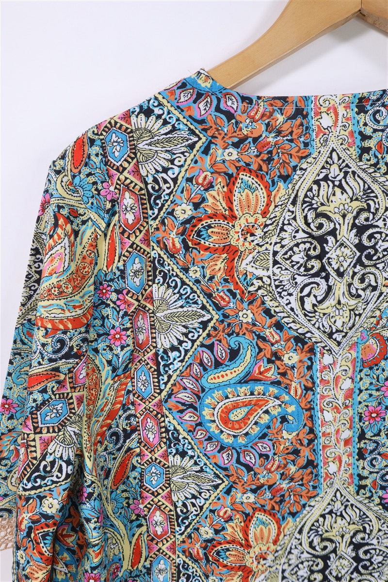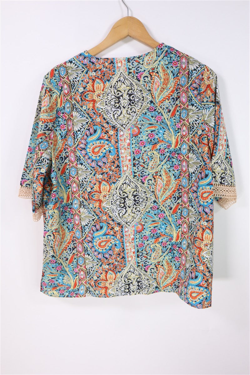חולצה נשפכת וקצרה בפרינט פרחוני אתני צבעוני. בשילוב צווארון קרושה וסיומת שרוולים זהה ללא שם המותג מידה רשומה L הרכב בד סינטטי אורך 65 ס"מ היקף חזה עד 110 ס"מ כחדש |