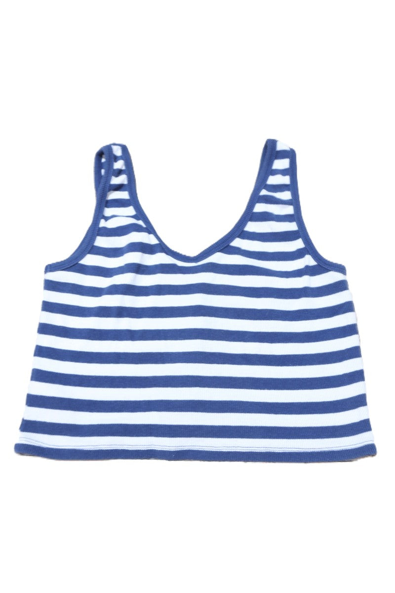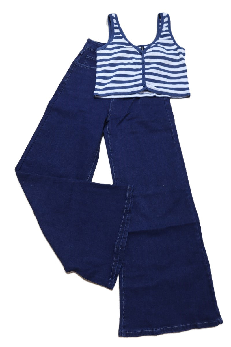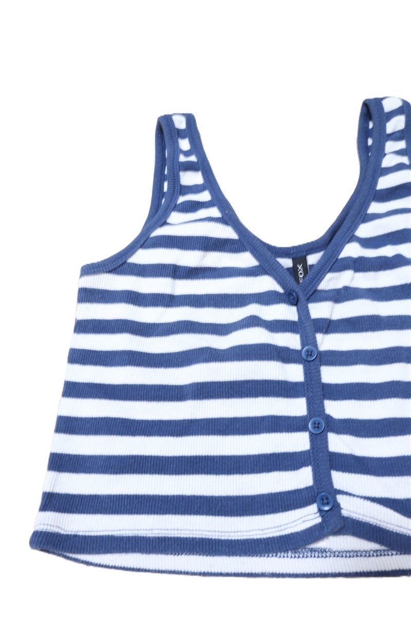 בצבע לבןעם פסים עבים בכחול ודוגמת כפתורים עדינה