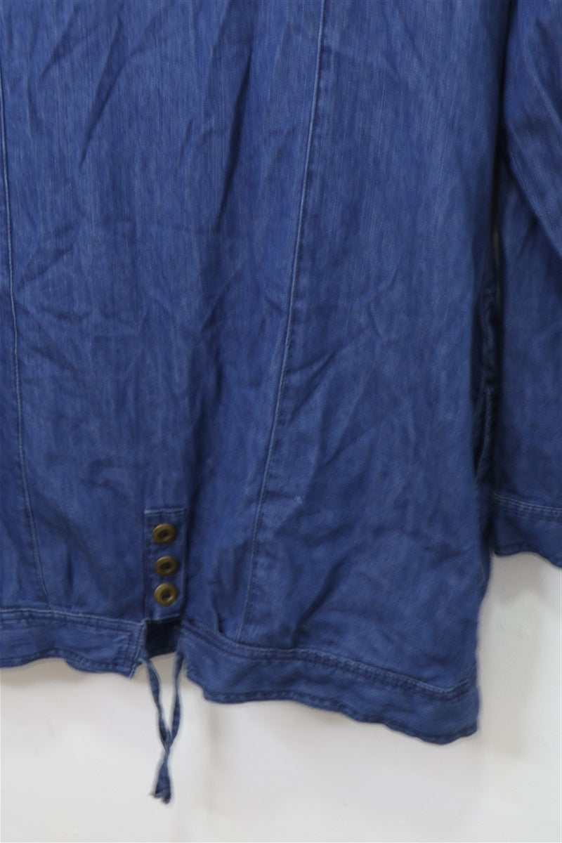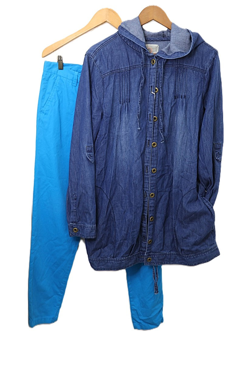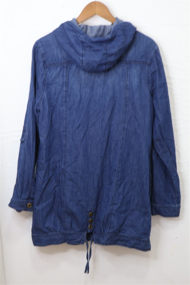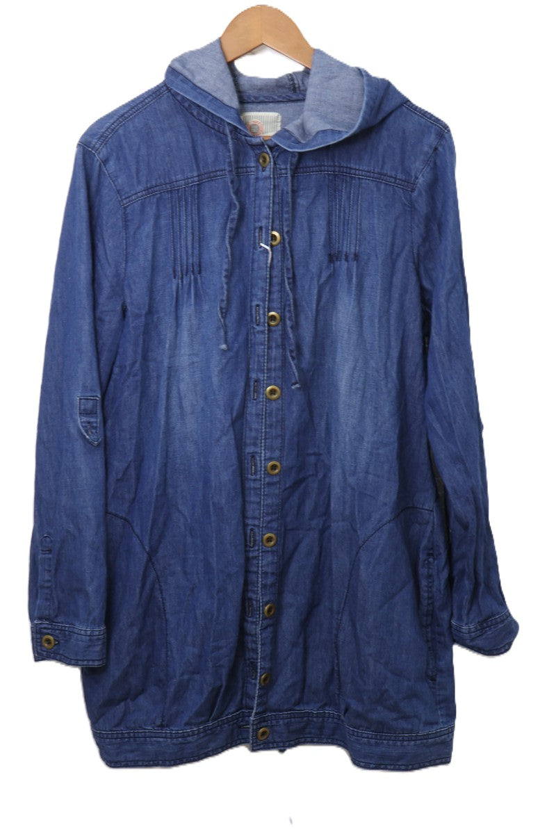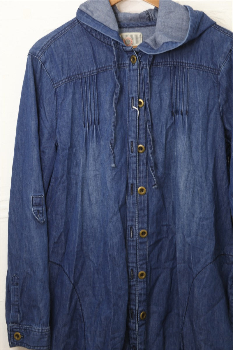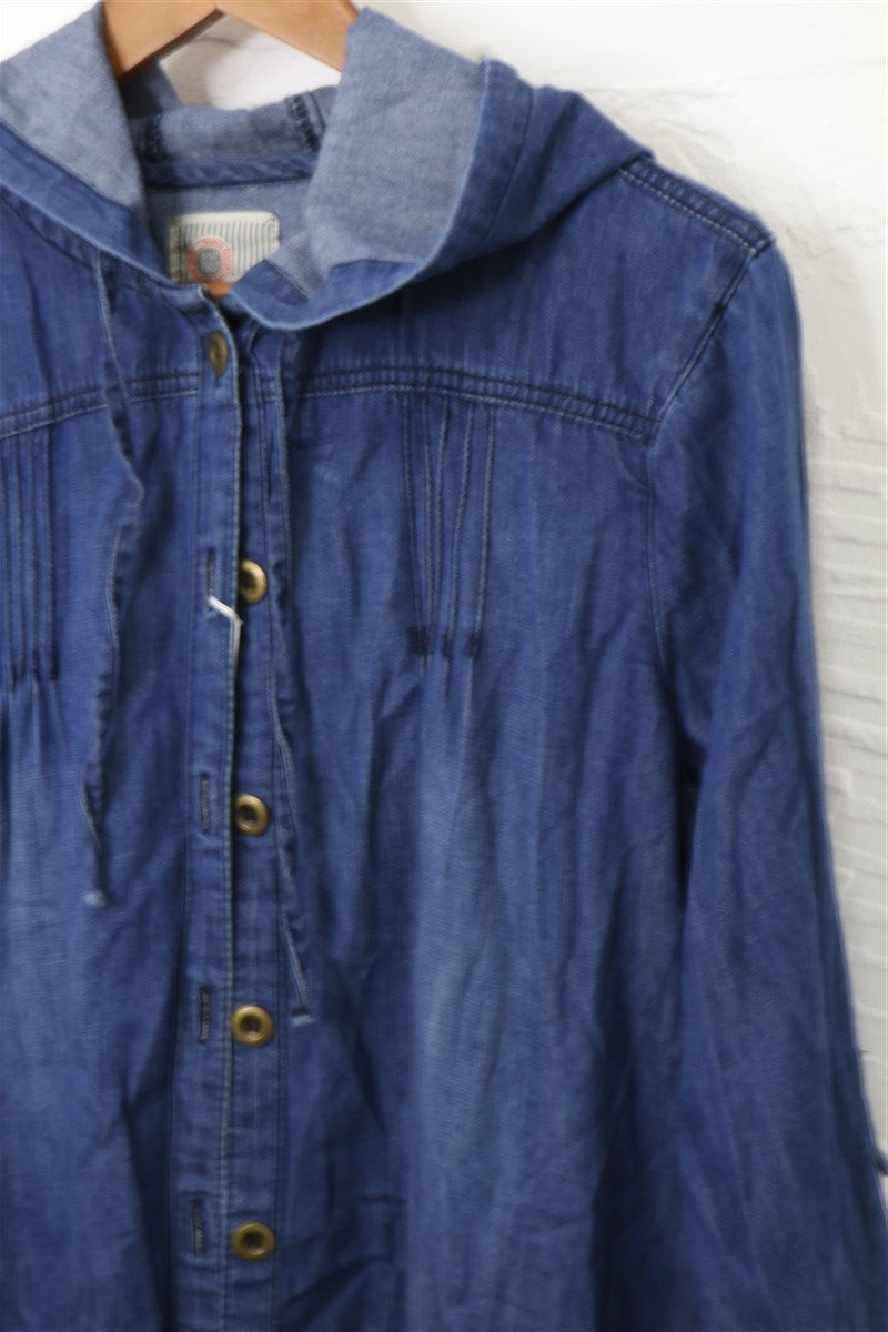 חולצת ז'קט ג'ינס עם קפוצ'ון בצבע ג'ינס כחול, מבד ג'ינס דק וטבעי במגע, עם סגירת כפתורים וכיסים מעוצבים בחזית.