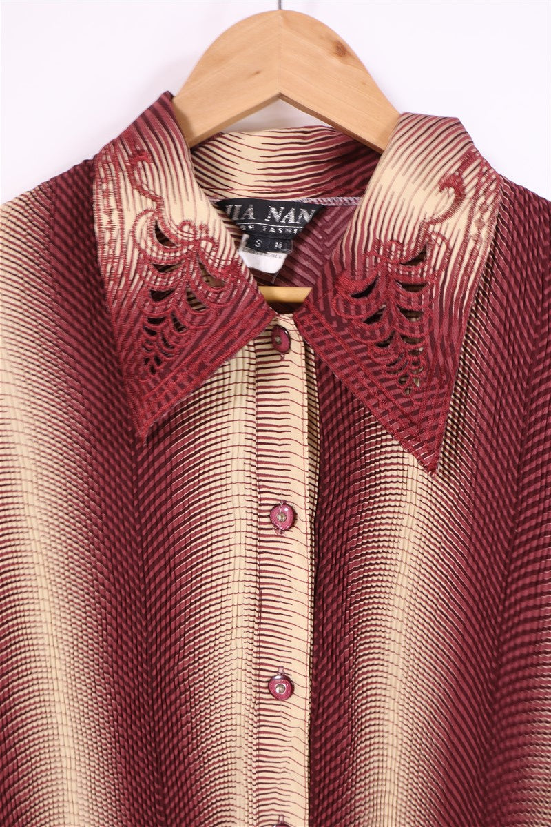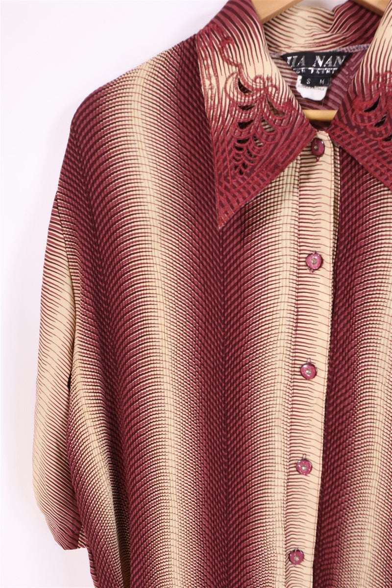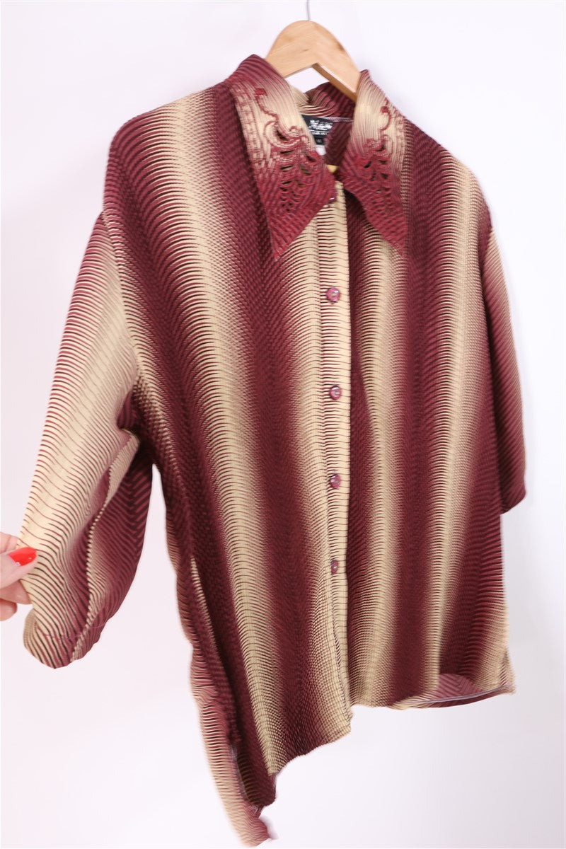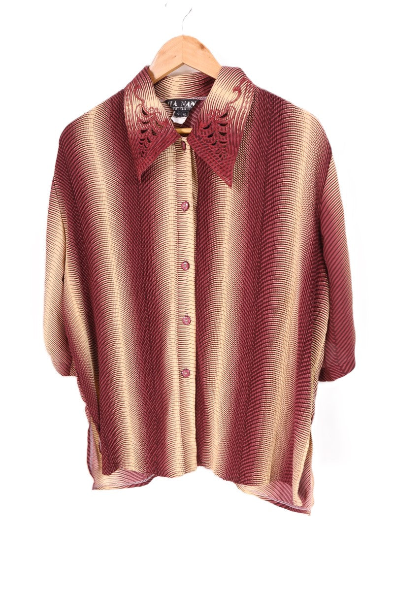 החולצה מכופתרת וקצרה בסטייל נשפך בצבע בורדו בסטייל אומברה ניוד