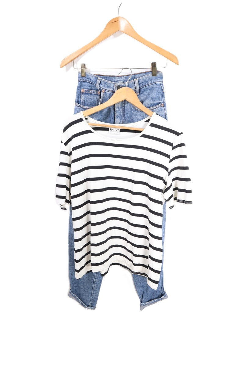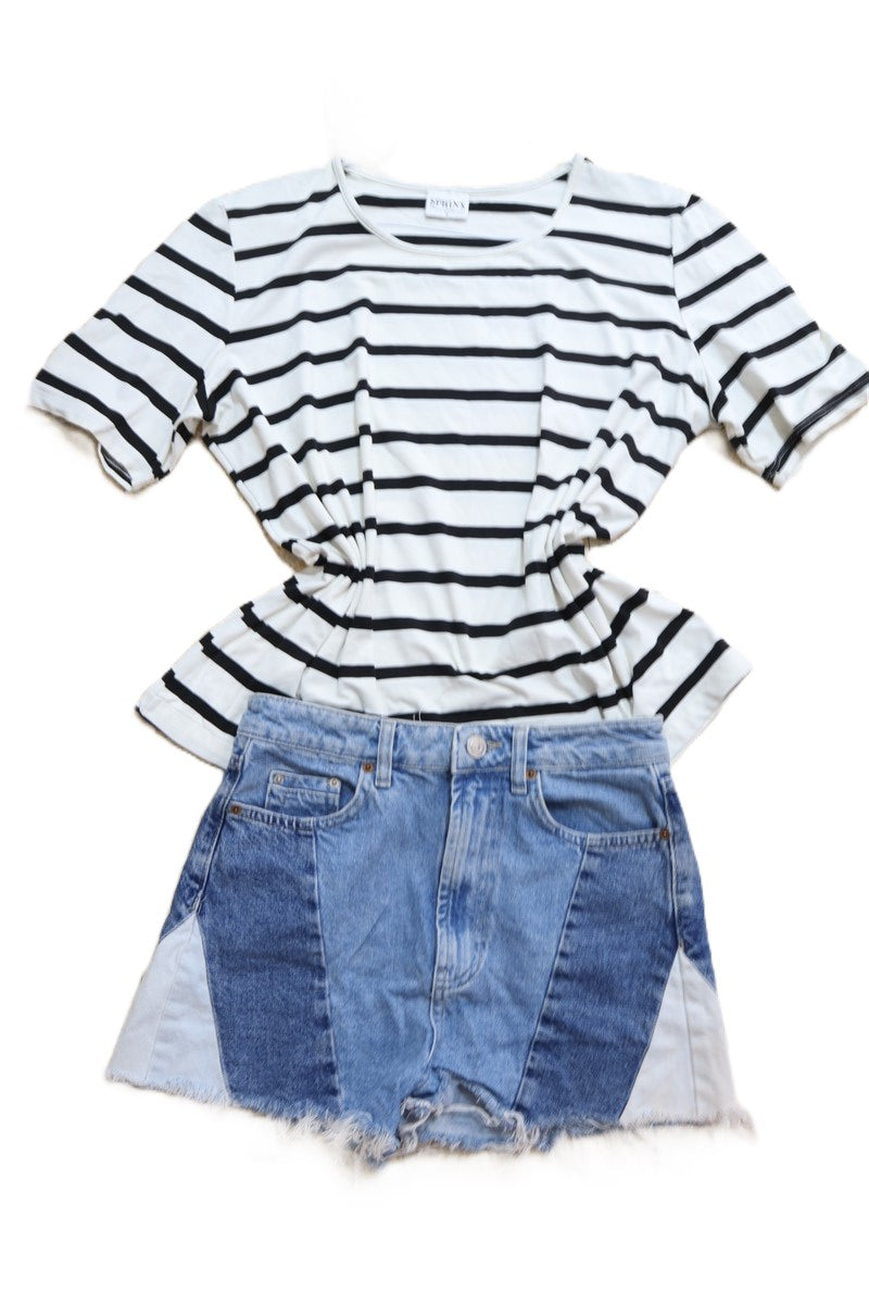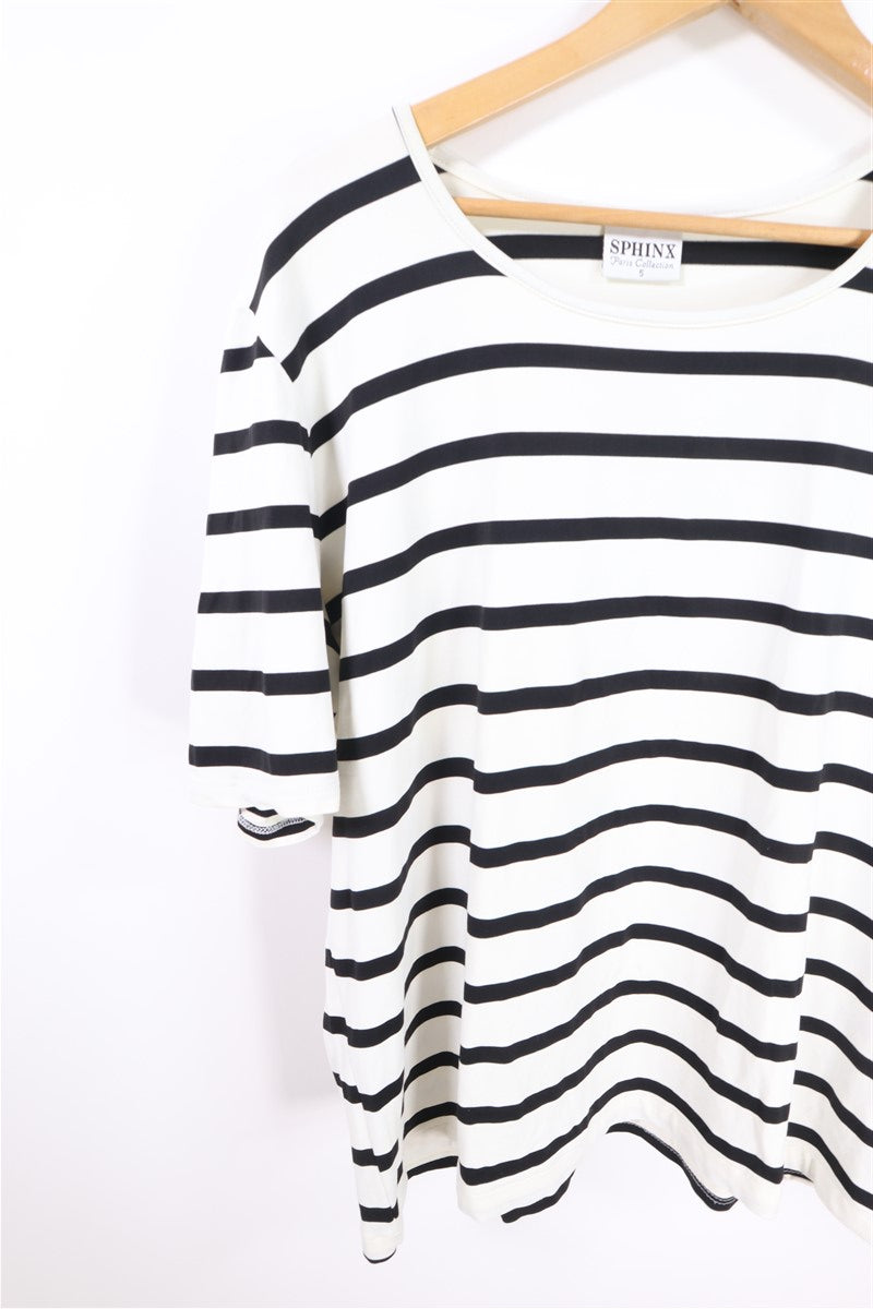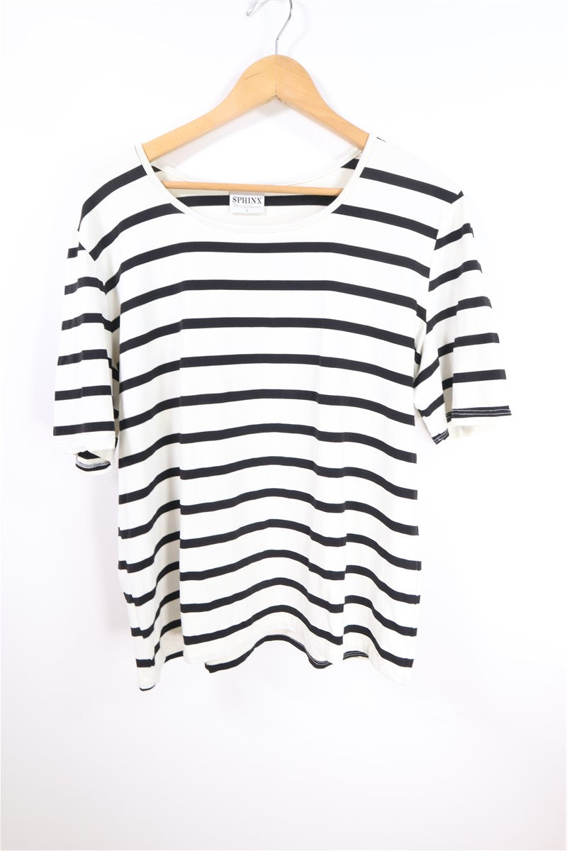 חולצת טי שרט קלילה וסטרצית בצבע בסיס לבן עם פסים בשחור