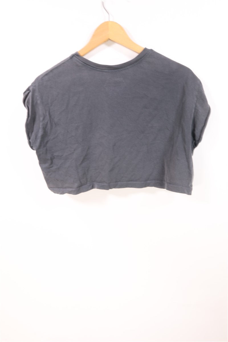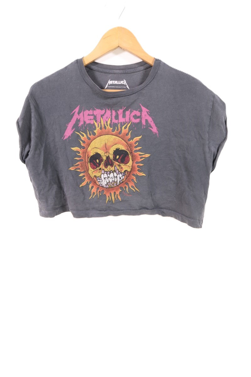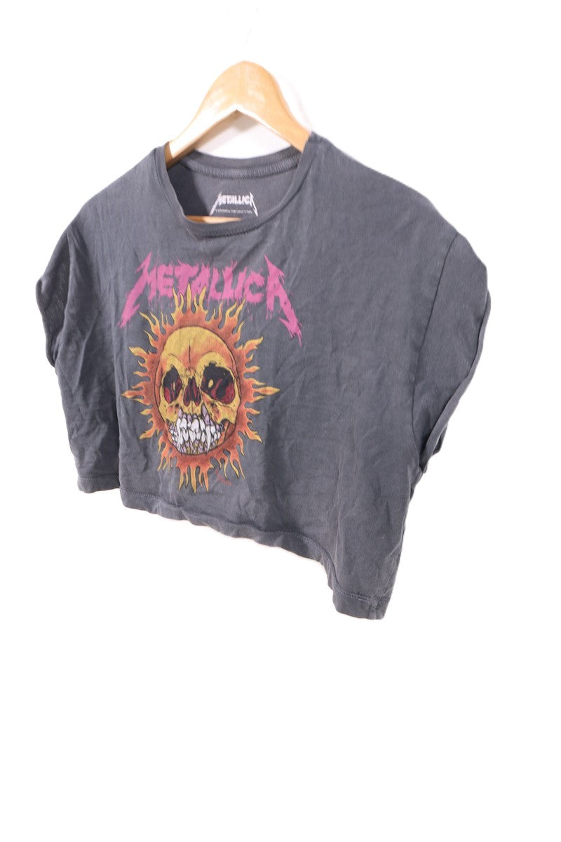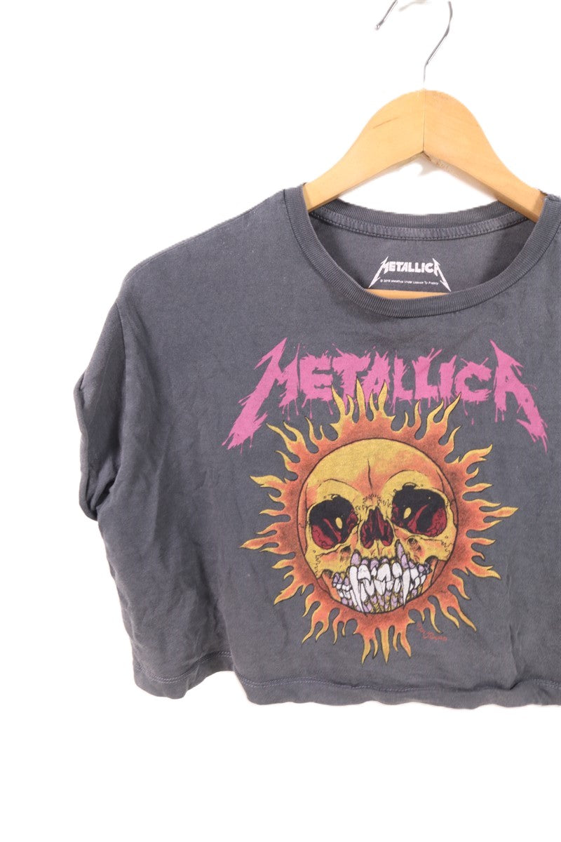 חולצת טי שרט האפור כהה בגזרת קרופ, עם הדפס קדמי של גולגלת צבעונית בסטייל מטליקה