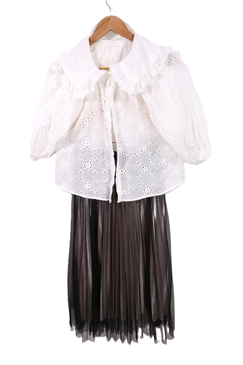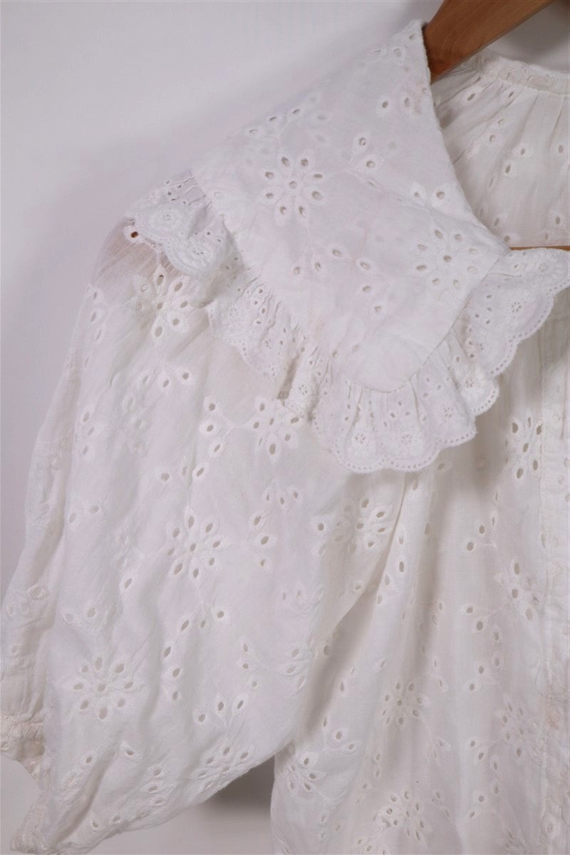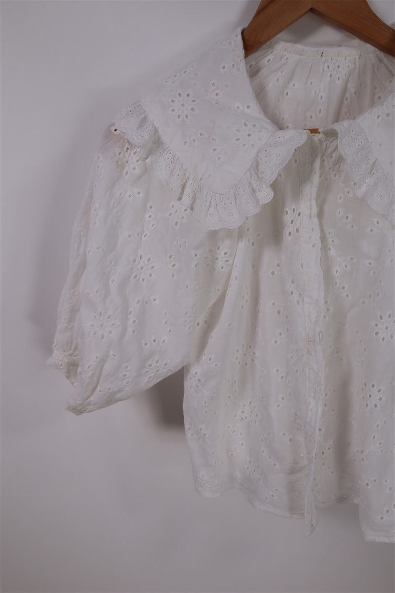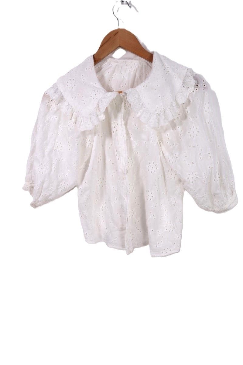 חולצת כפתורים בצבע לבן שמנת עם כפתורים קטנים וצווארון מוגזם בסטייל קרושה
