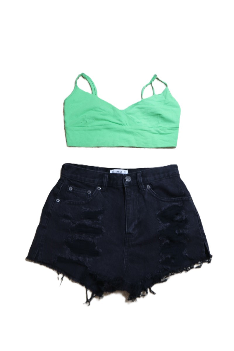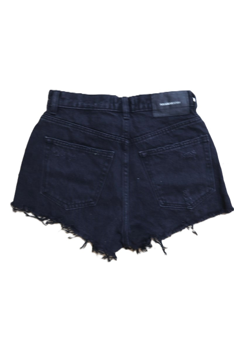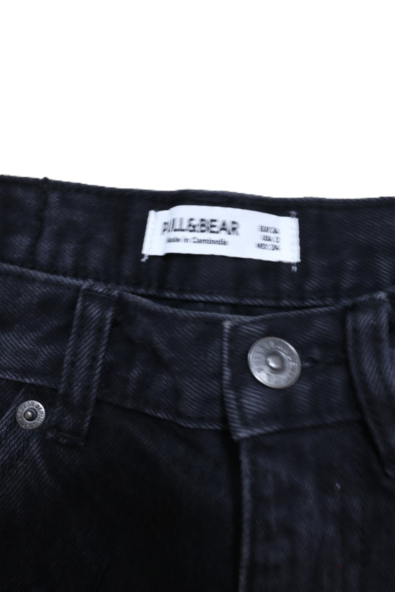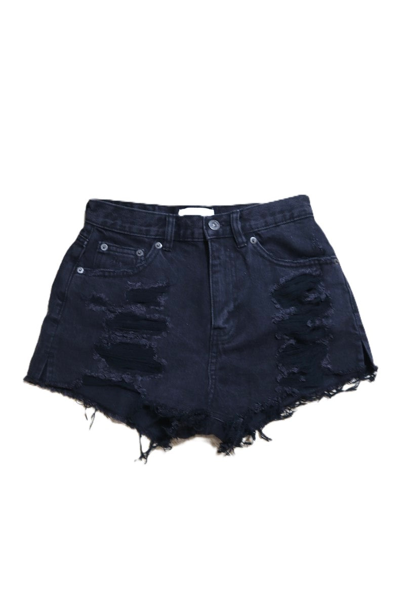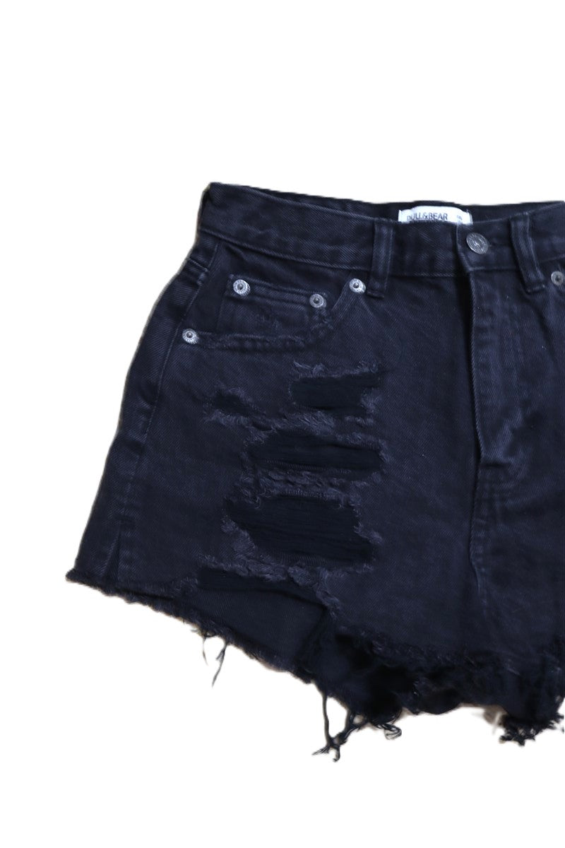 מכנסיים בד גזרת שורט בסטייל גינס בצבע שחור עם קרעים עדינים , בד בסטייל גינס גינס דק .