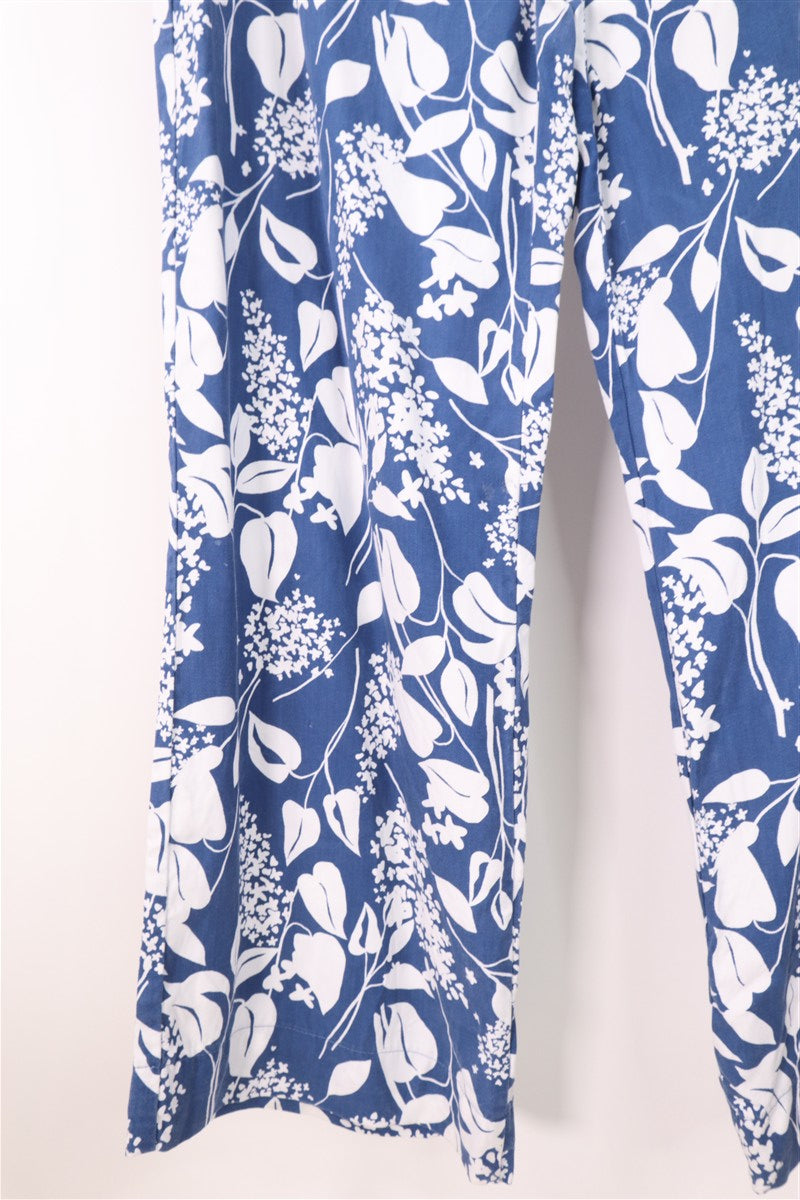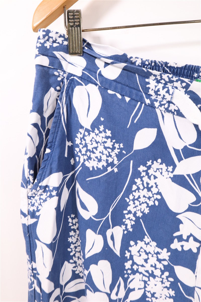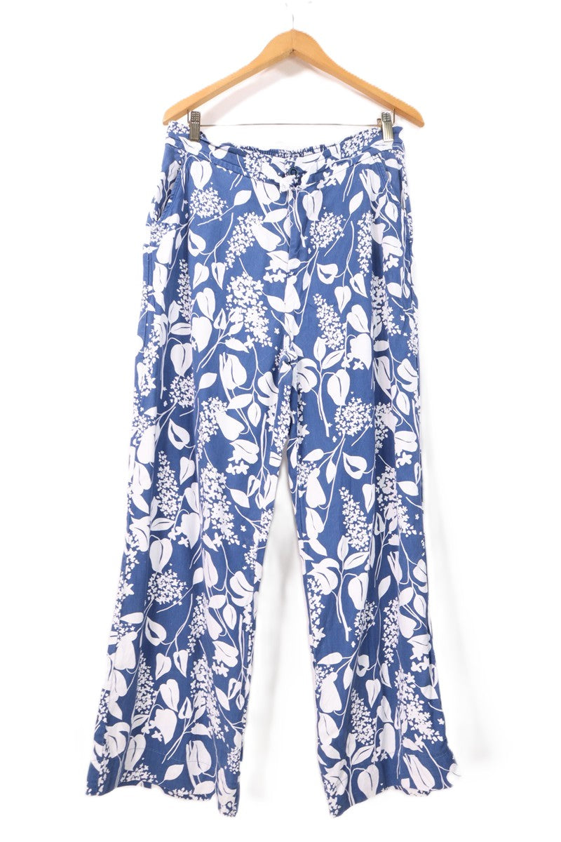 מכנסיים בגזרה גבוהה ומתרחבת בצבע כחול בפרינט פרחים בלבן