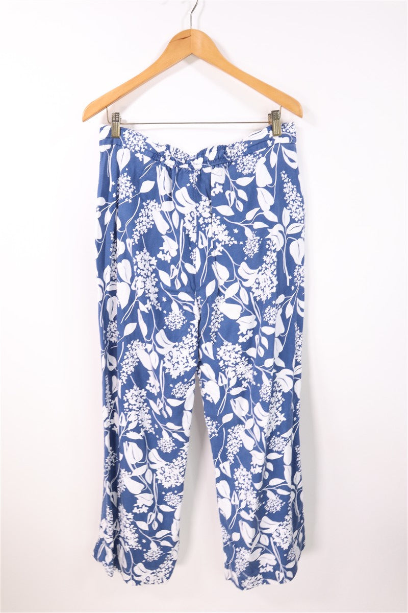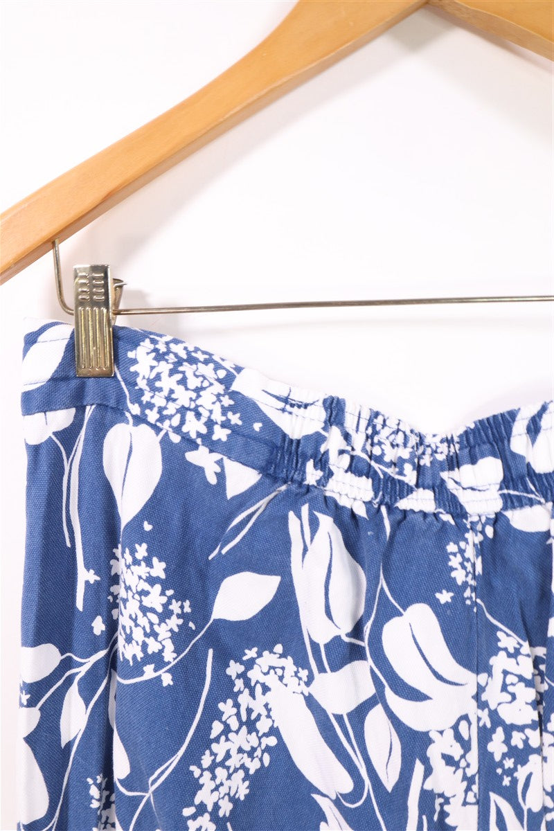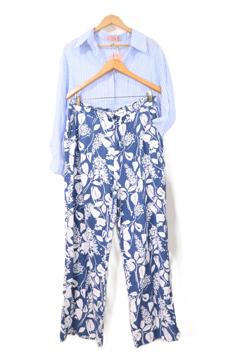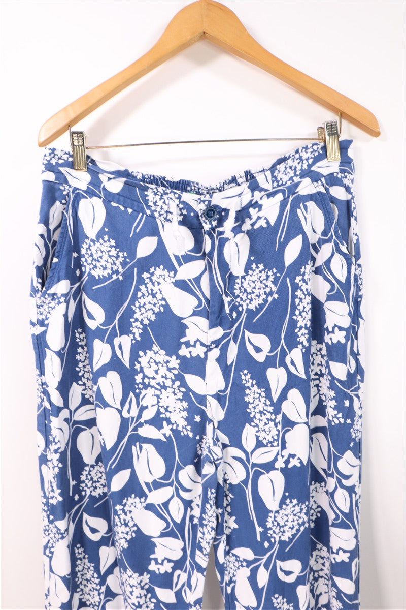 מכנסיים בגזרה גבוהה ומתרחבת בצבע כחול בפרינט פרחים בלבן