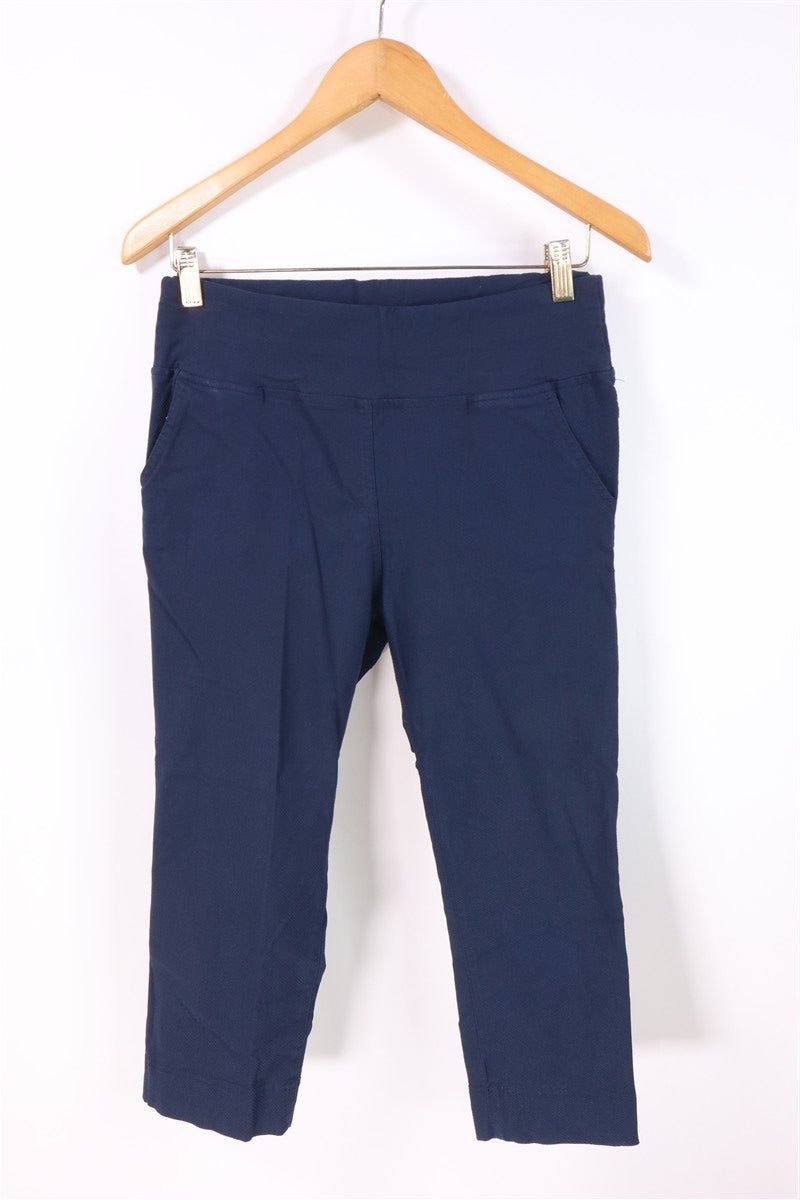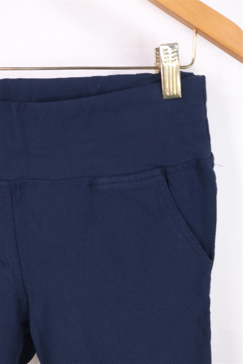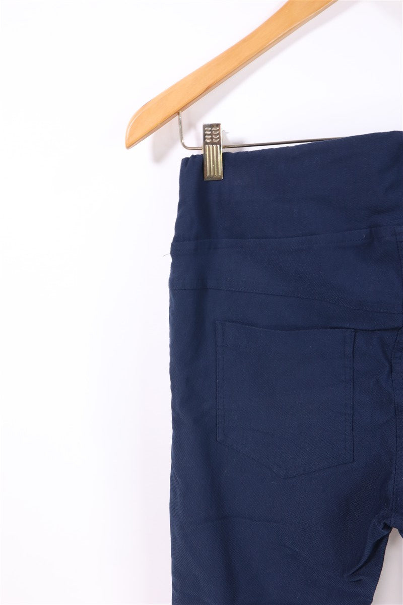 מכנסיים מבד מחוספס וסטרצי בצבע כחול שחור בגזרה מידי של המותג