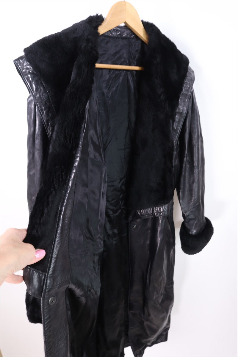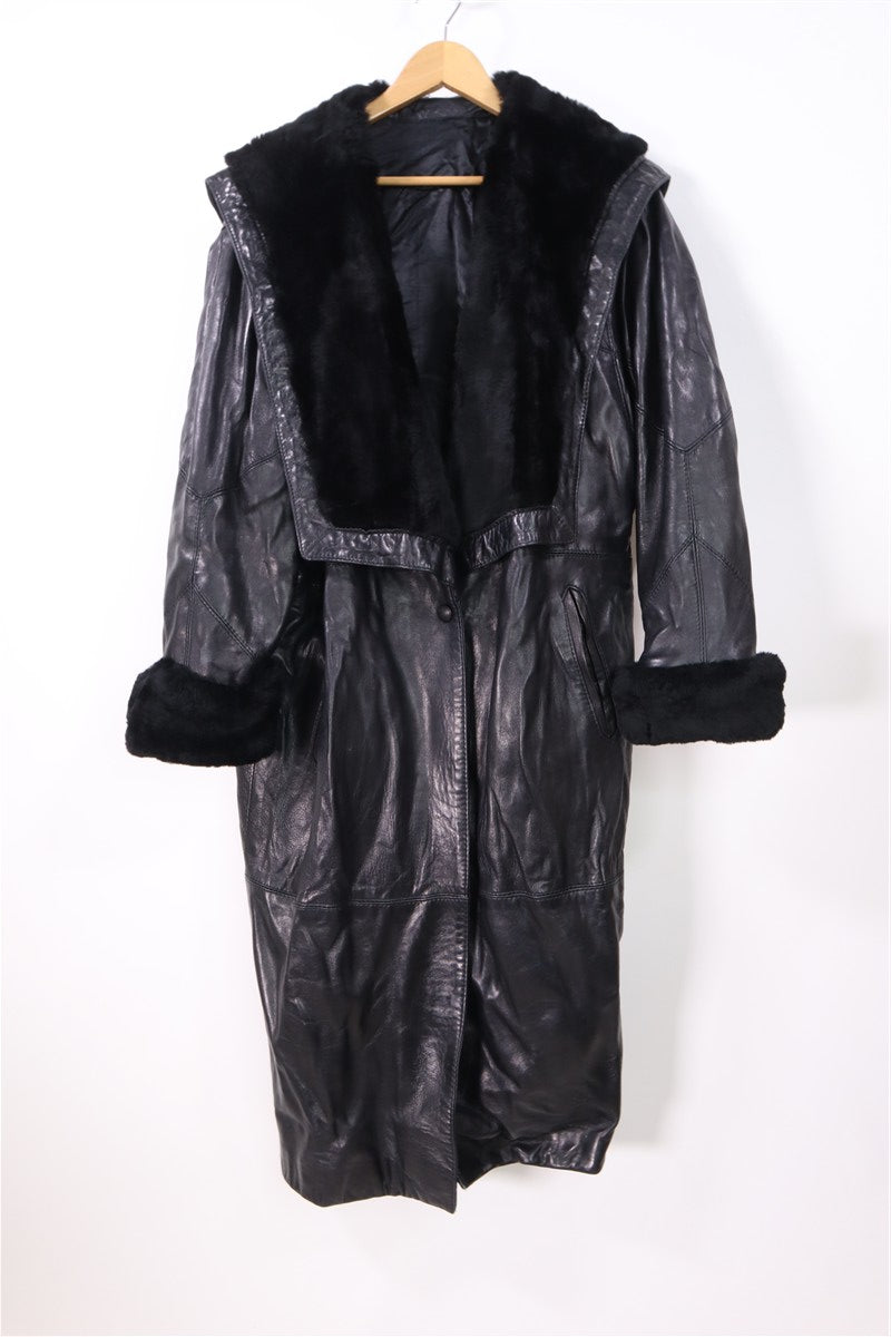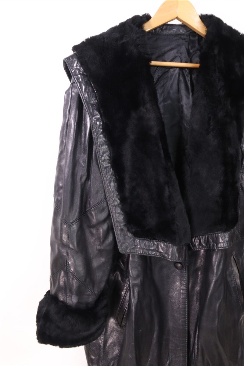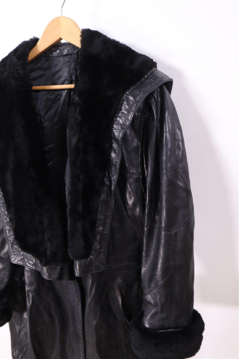 מעיל עור ויניטג שחור ארוך עם צווארון פרווה (סינטטית) מתקפל