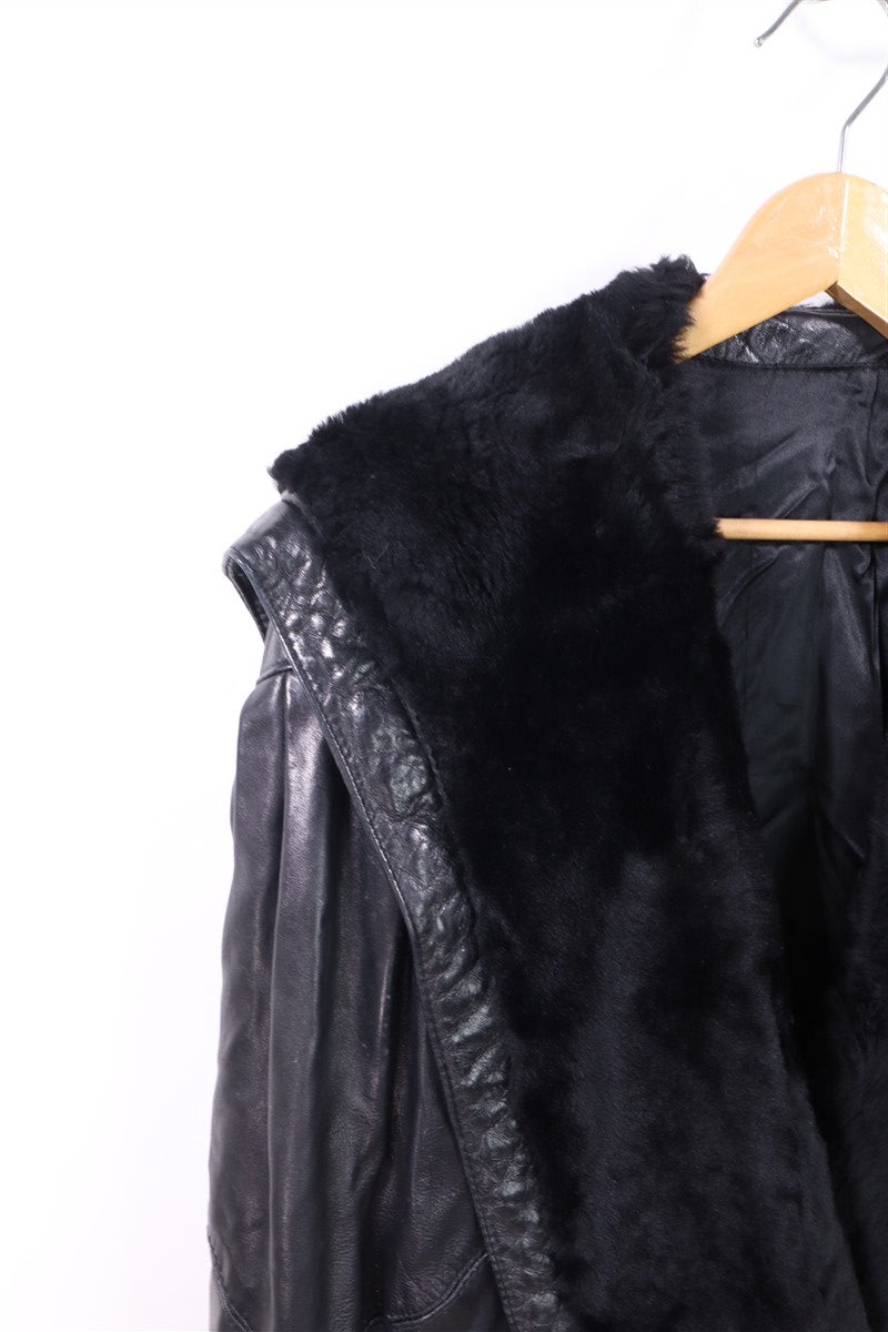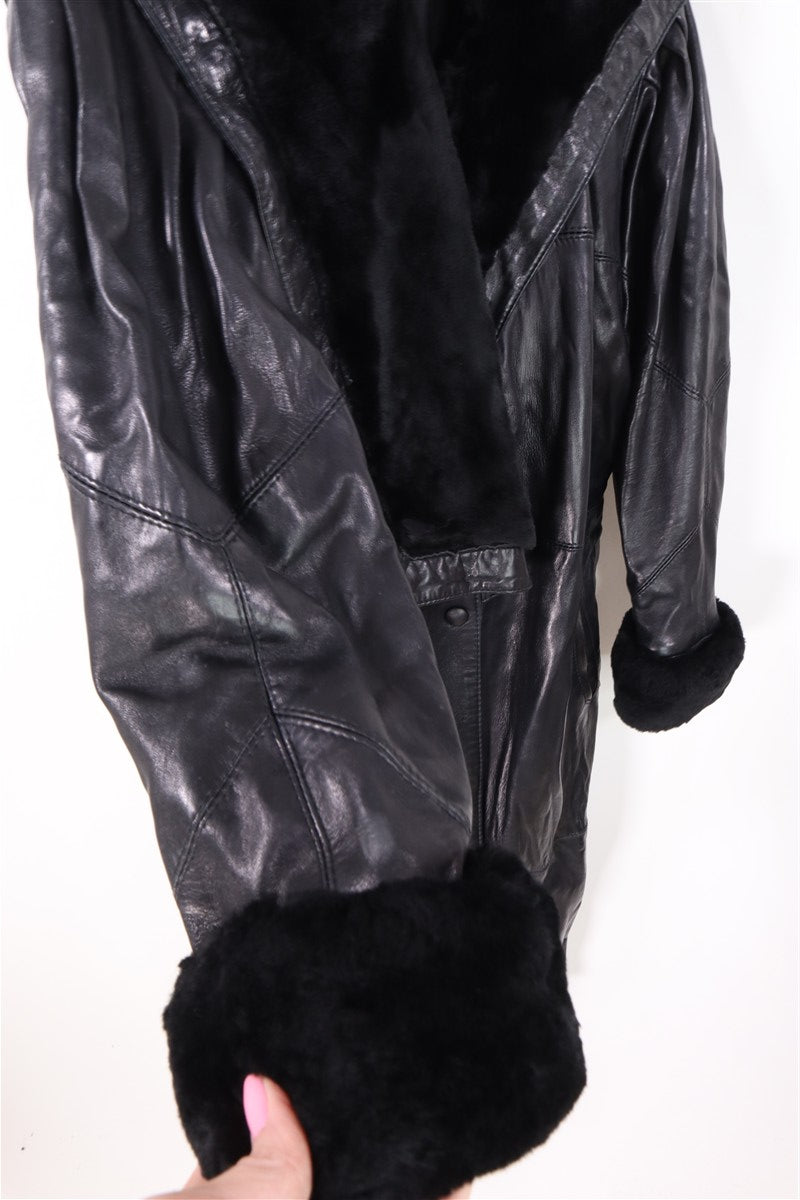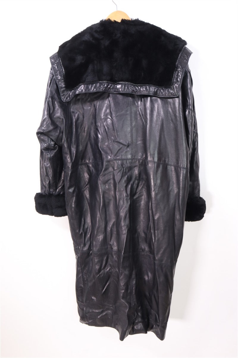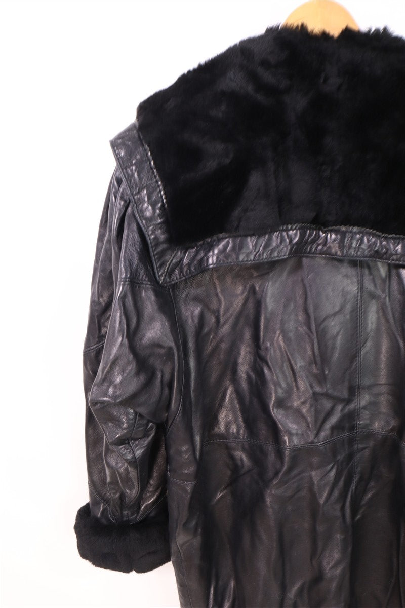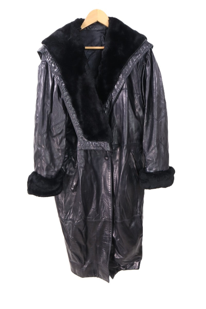 מעיל עור ויניטג שחור ארוך עם צווארון פרווה (סינטטית) מתקפל