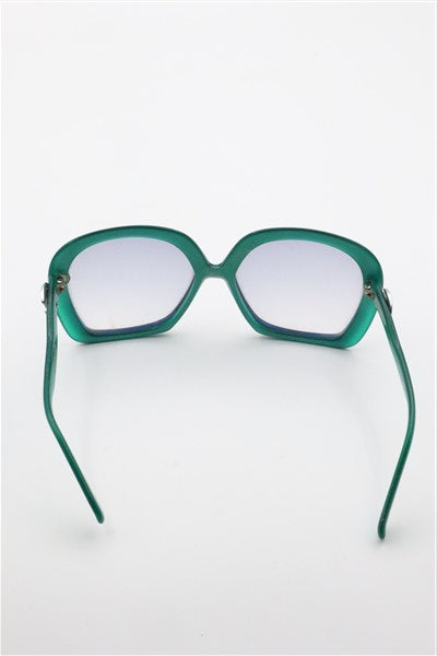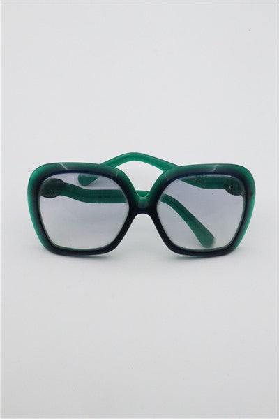 משקפי שמש ויניטג עם מסגרת ירוקה-כחולה מעוצבת ועדשה אפורה שחורה, יש נקודה של שינוי גוון קל בעדשה. המסגרת פלסטיק.