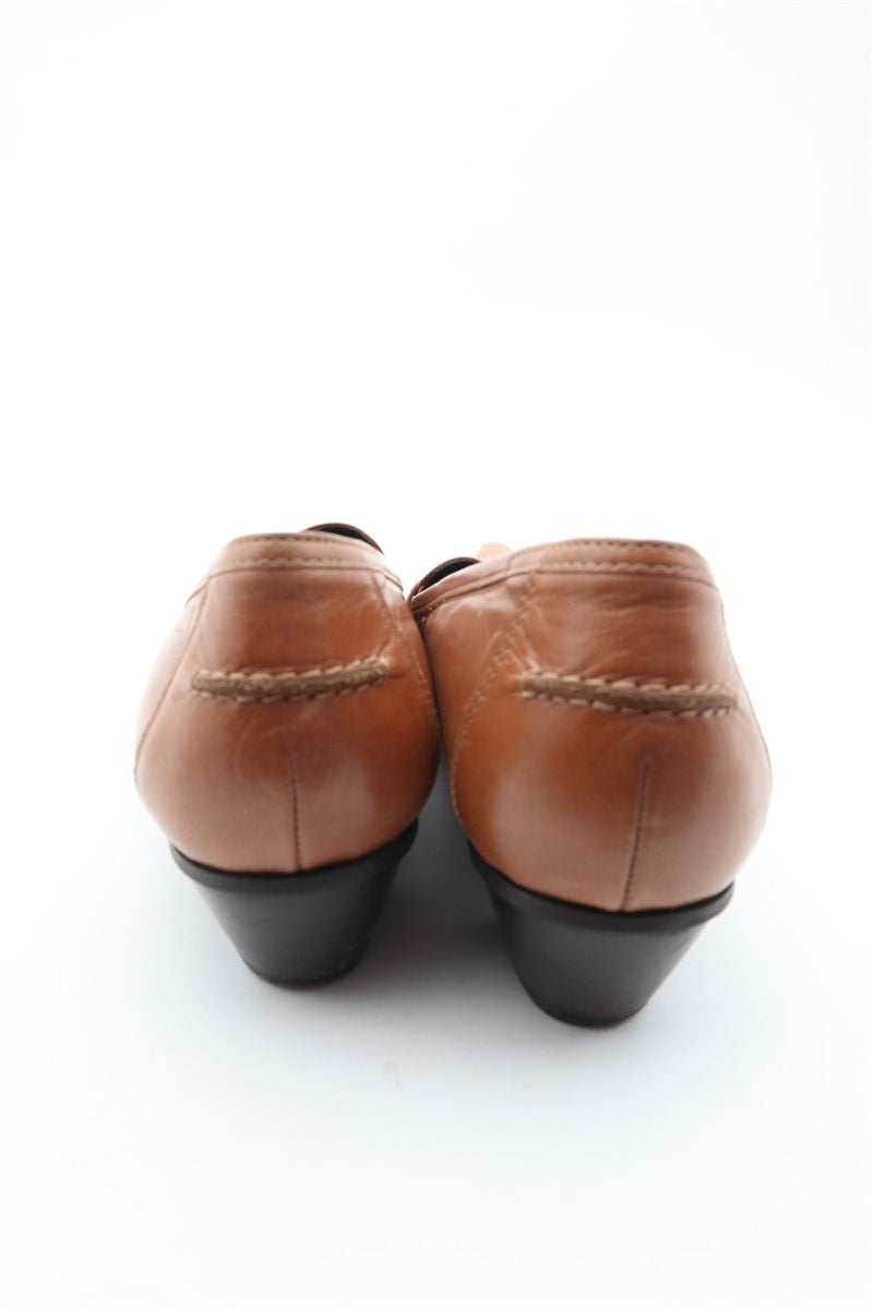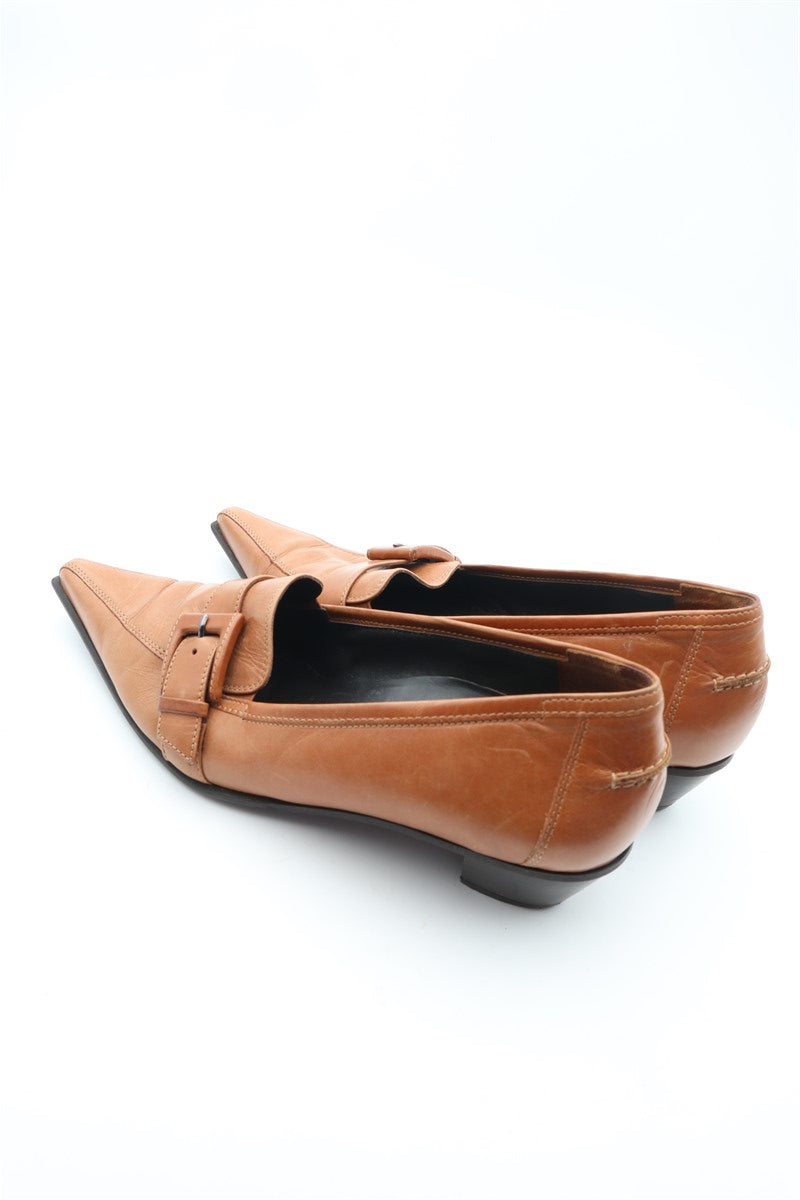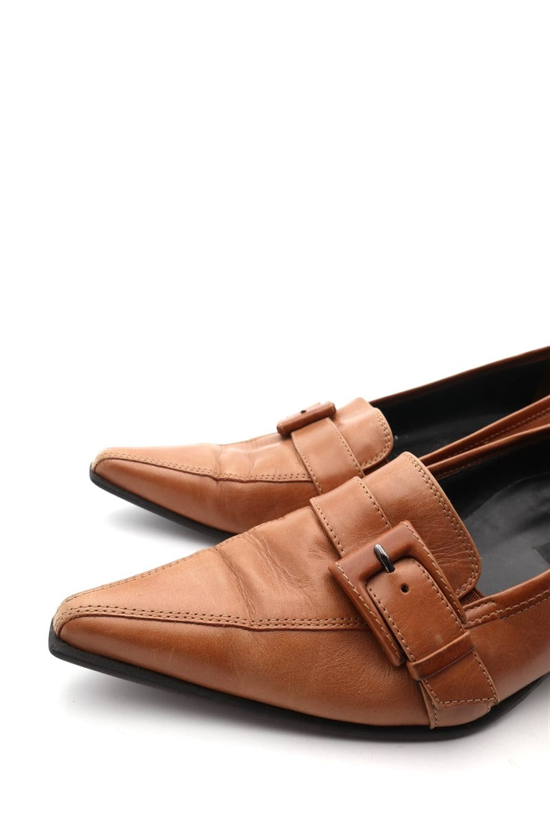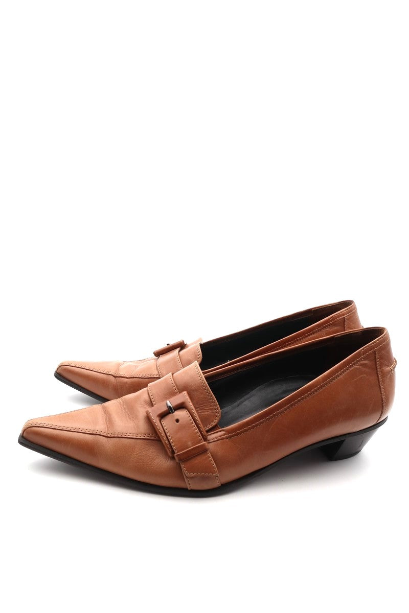 הנעל עם עקב קטן בסגנון מוקסין מחודד עם אבזם קדמי בצבע חום כאמל