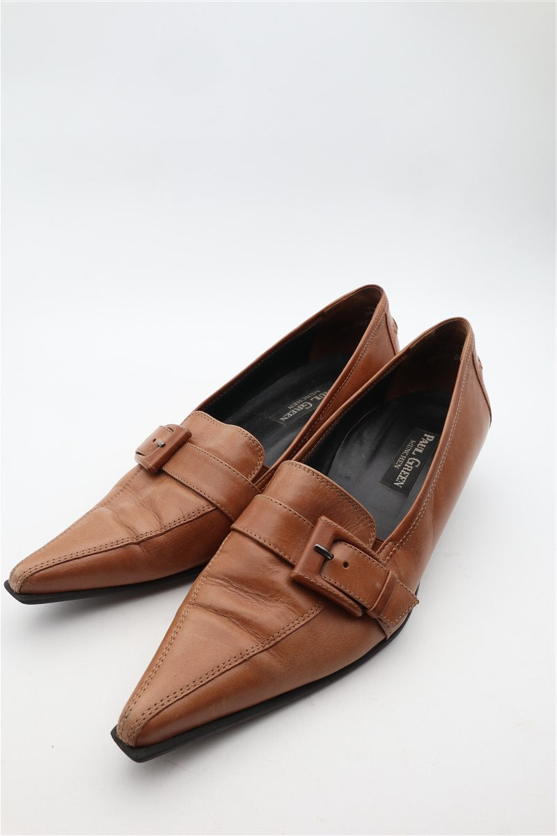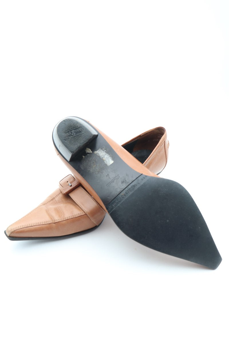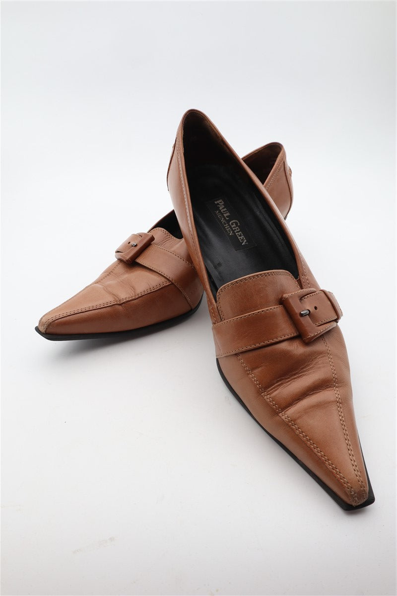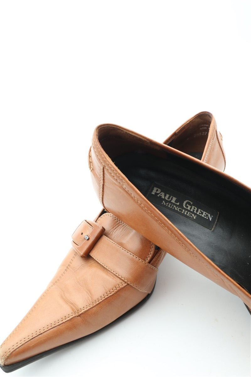 הנעל עם עקב קטן בסגנון מוקסין מחודד עם אבזם קדמי בצבע חום כאמל