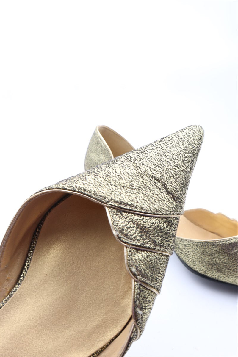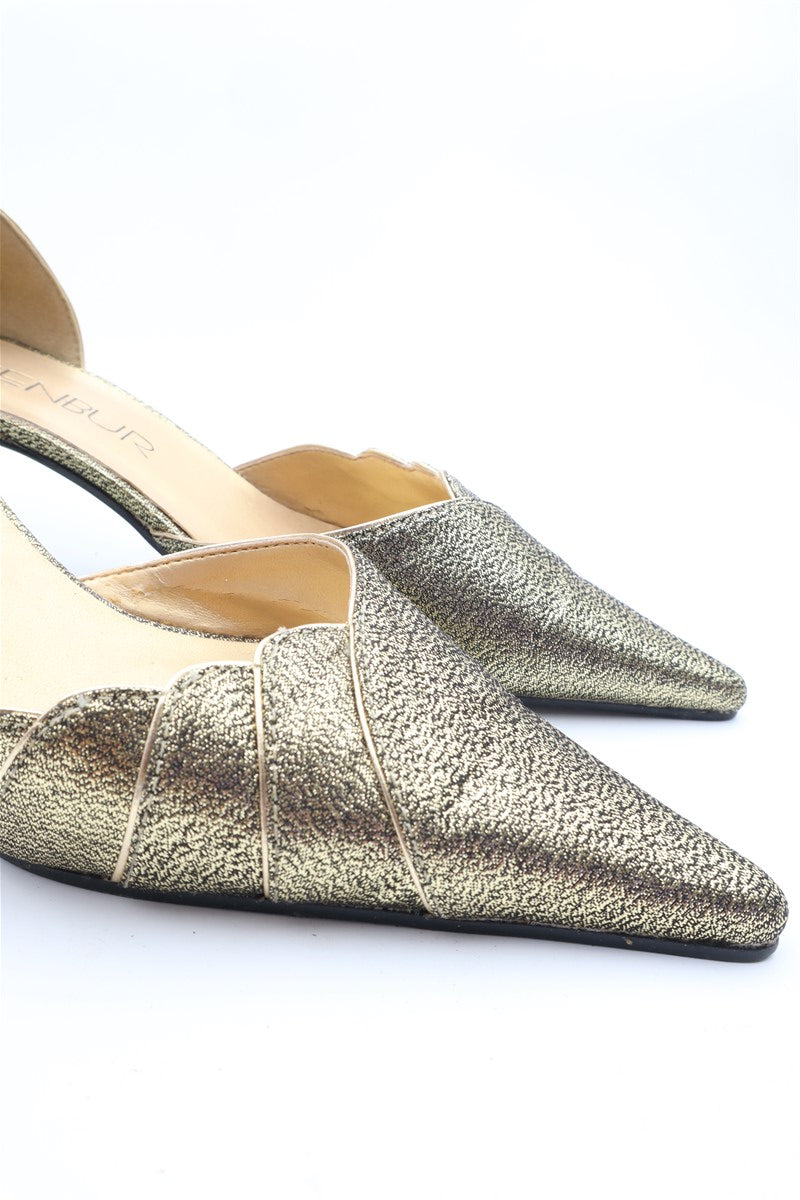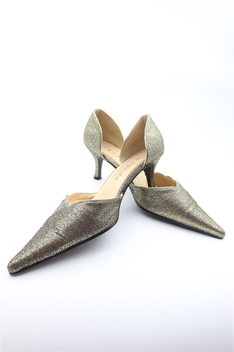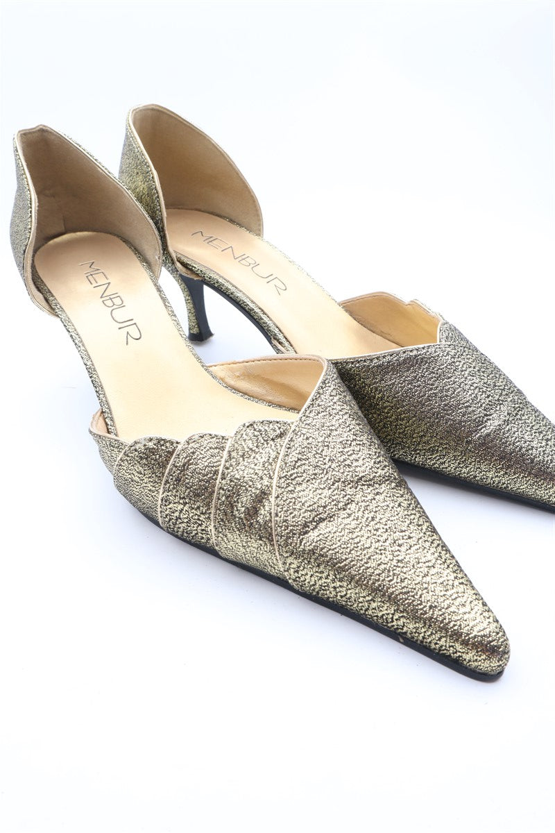 נעלי עקב מעוצבות בצבע זהב בגימור מנצנץ