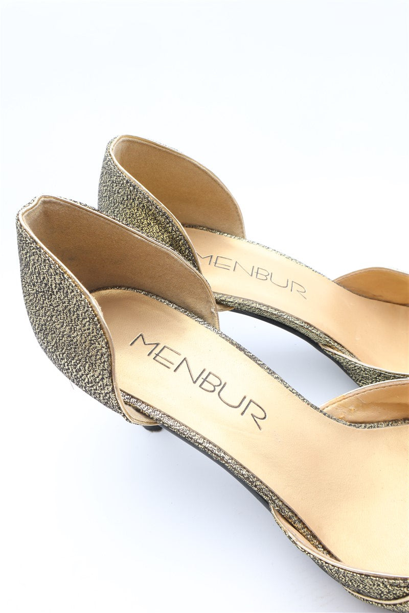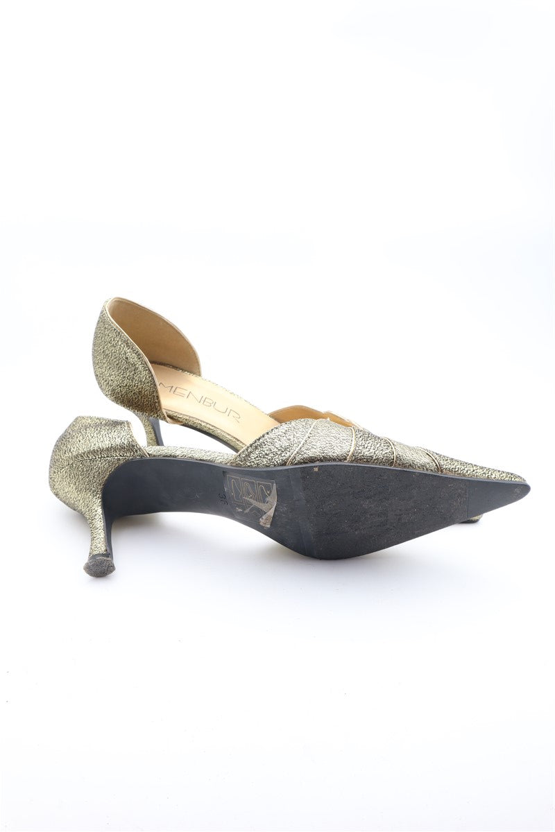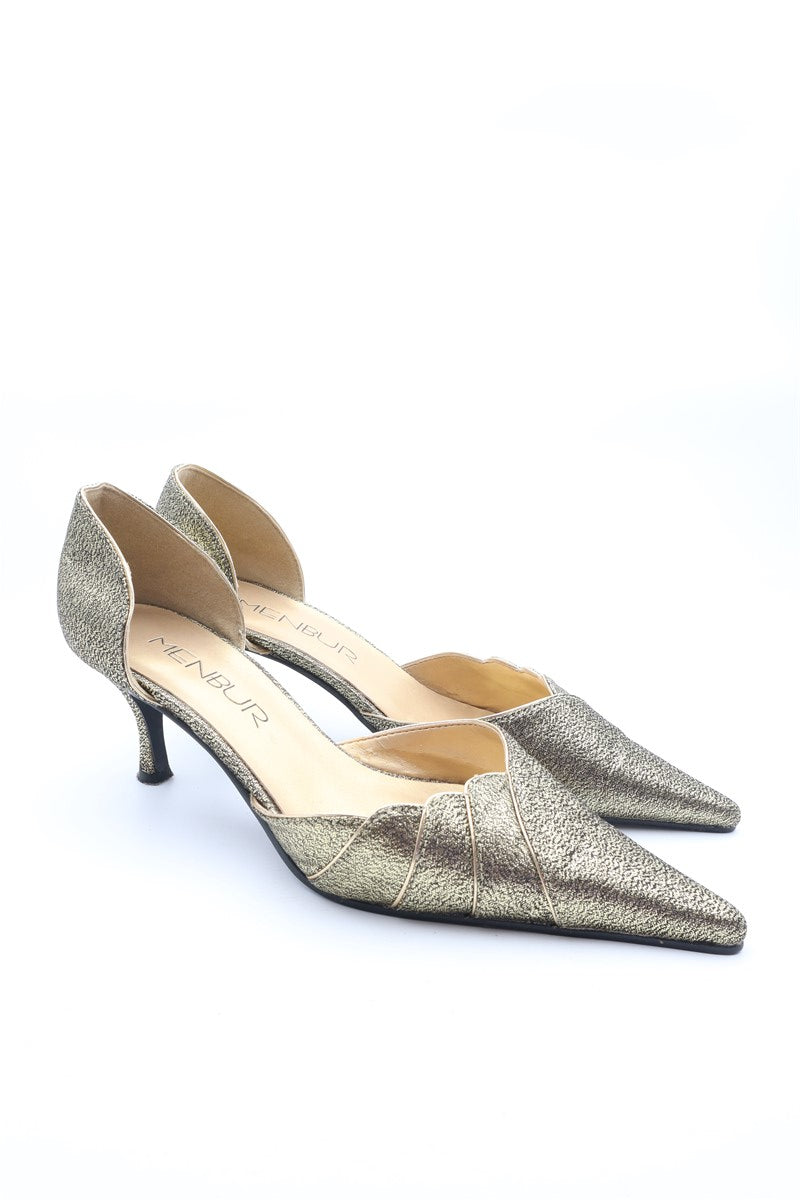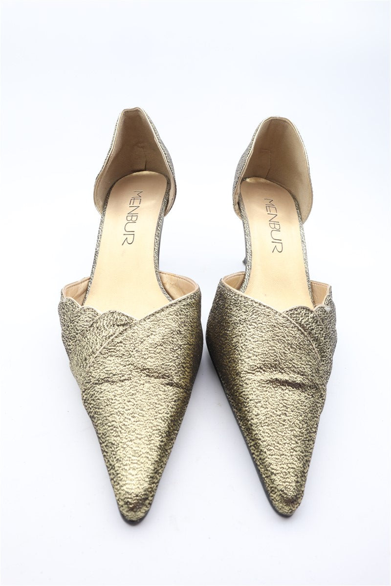 נעלי עקב מעוצבות בצבע זהב בגימור מנצנץ