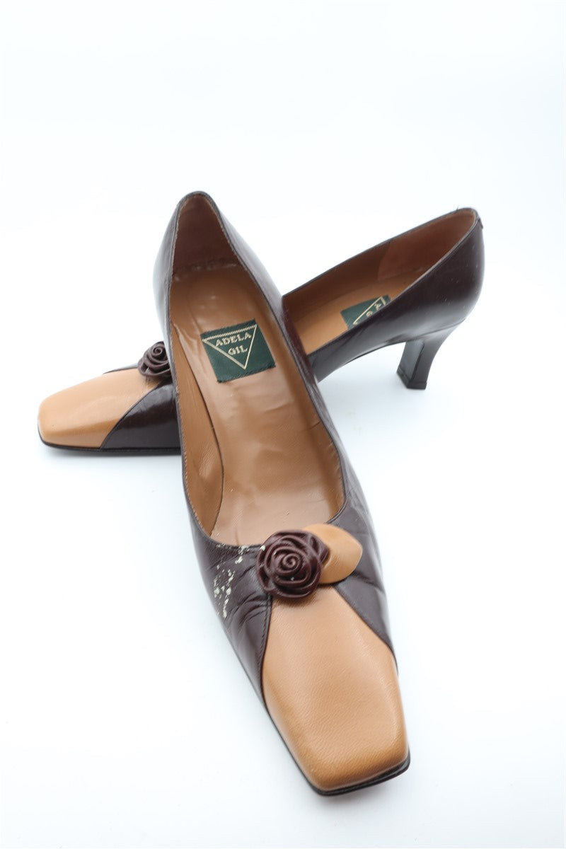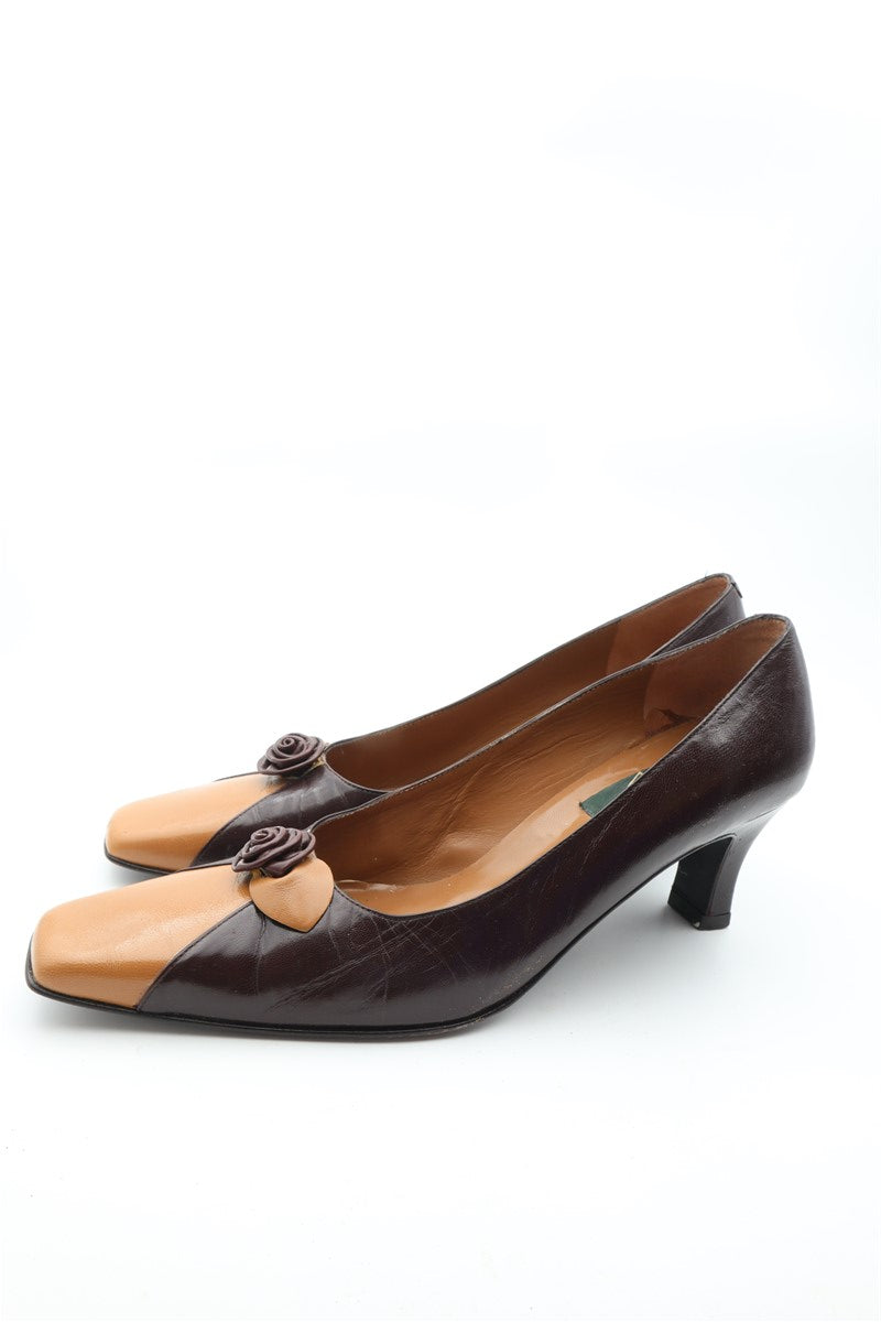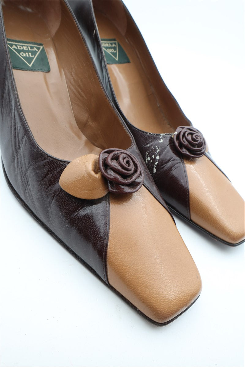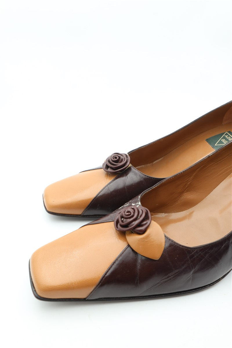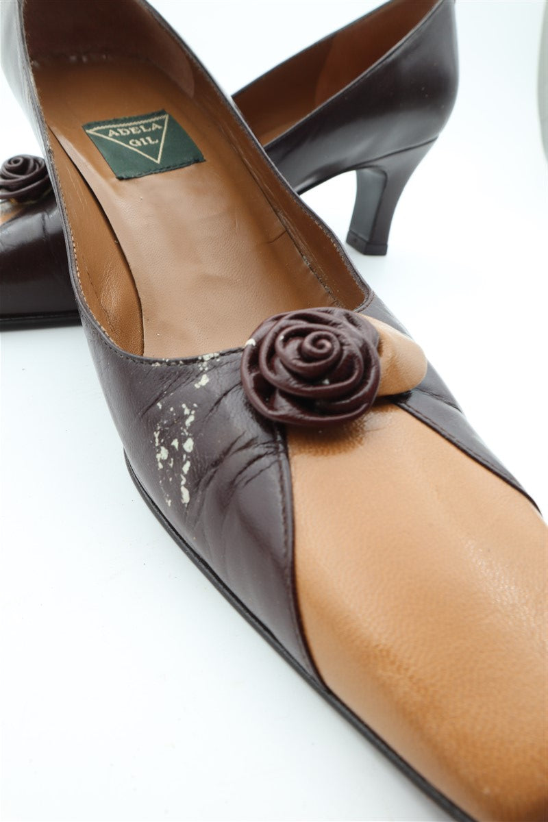 הנעל מעור בצבע חום וקרם עם דוגמת שושנת עור מקדימה