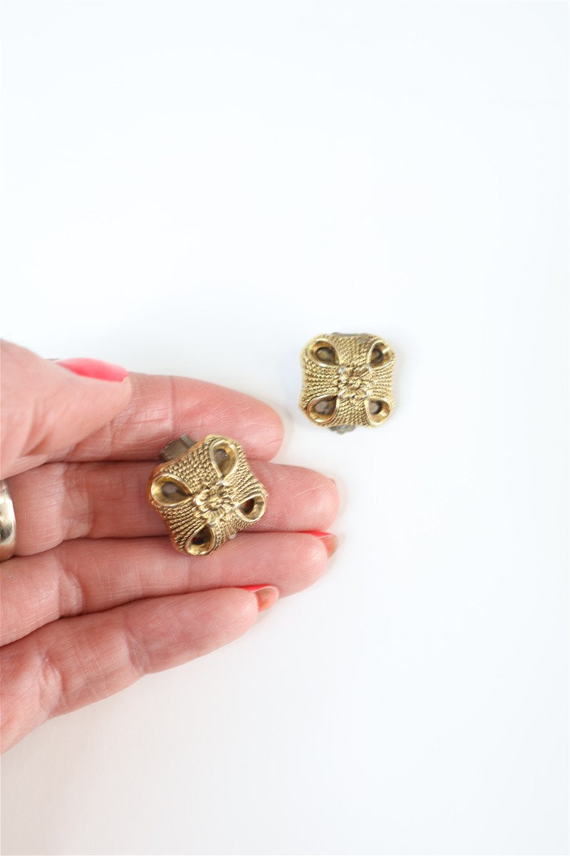 זוג עגילי וינטיג מתכתיים בצורה ריבוע מוזהב ומעוטר