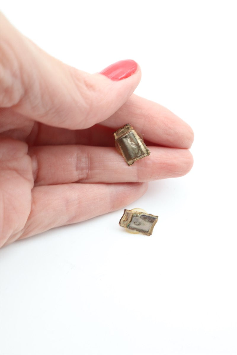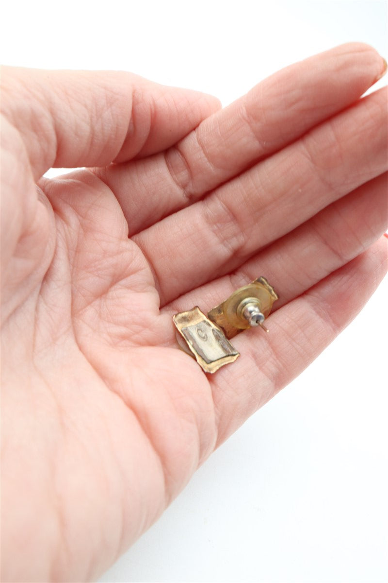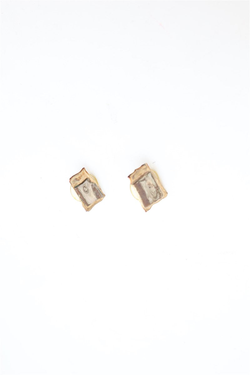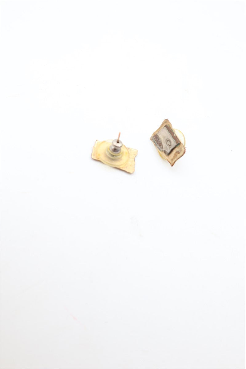 זוג עגילי וינטיג מעוצבים בצורה מלבנית ממתכת בגוון נחושת (מתכת לא ידועה) עם שיבוץ אבן בגימור צדפה מבריקה