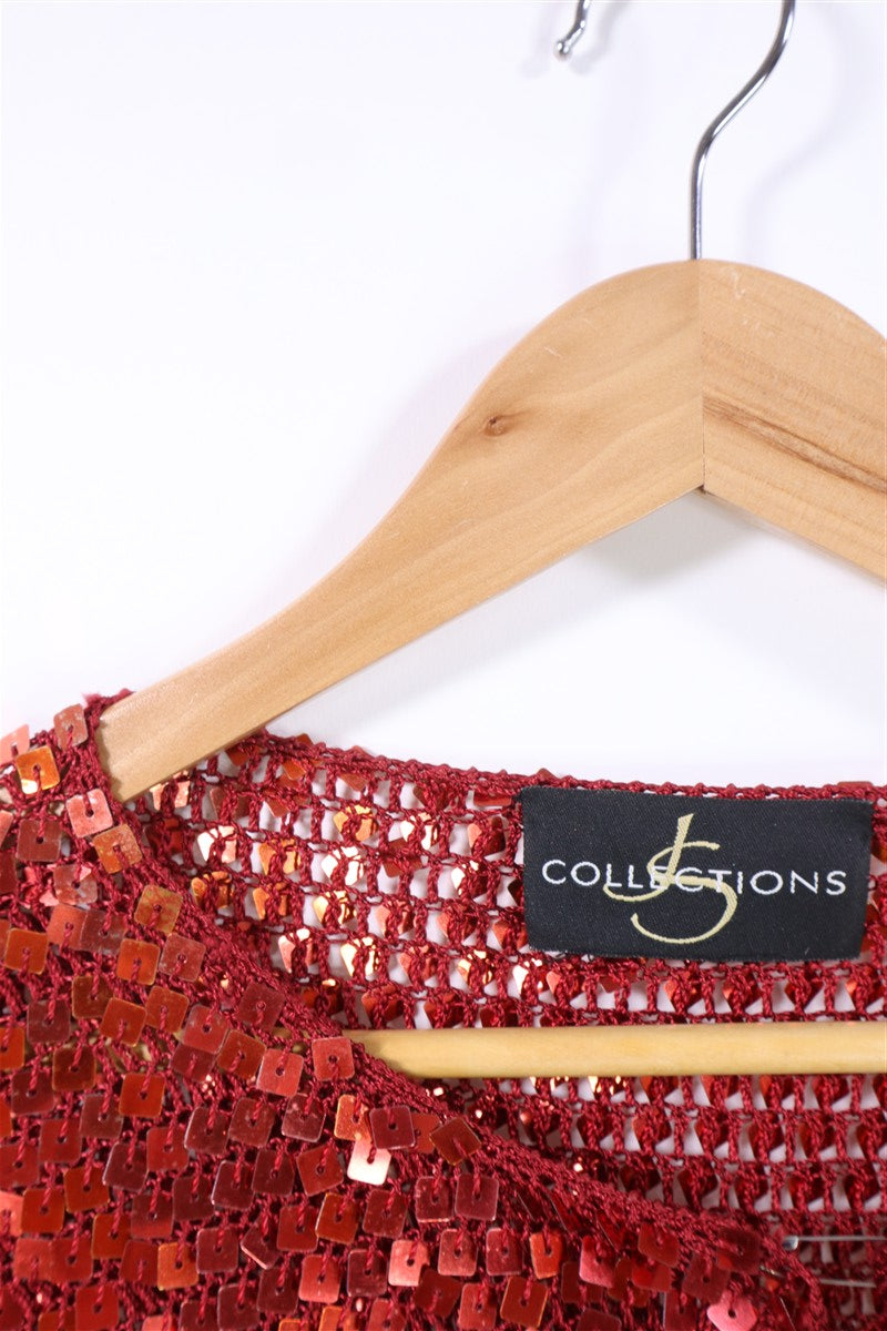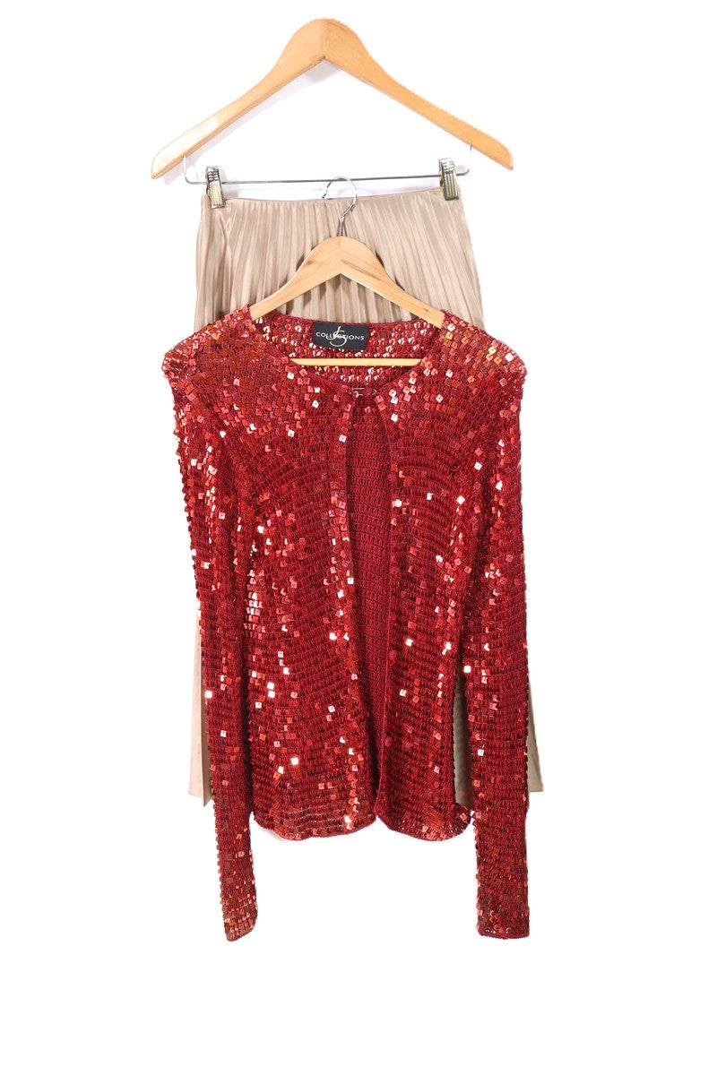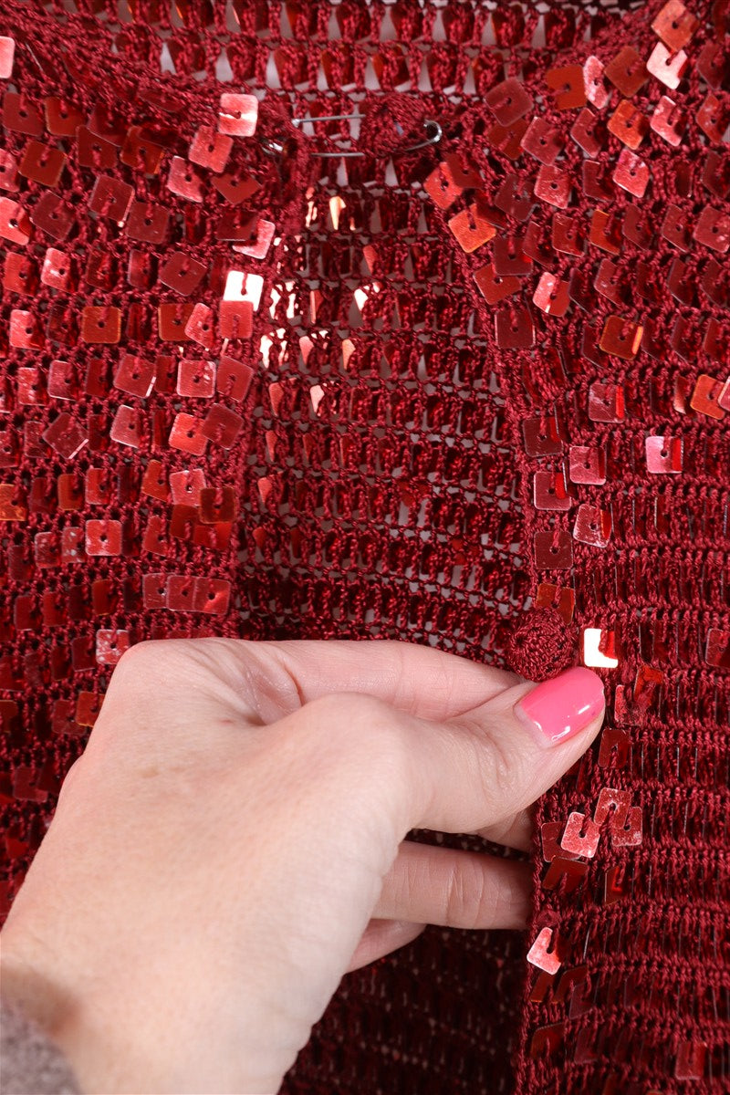 העליונית מרקמת חוט בשילוב פייטים בצבע אדום בורדו עם כפתורי לולאה לסגירה