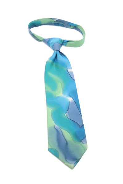 עניבת משי בהדפס סגנון צבעי מים בצבעי כחול,טורקיז וירוק.