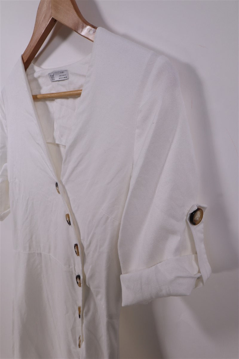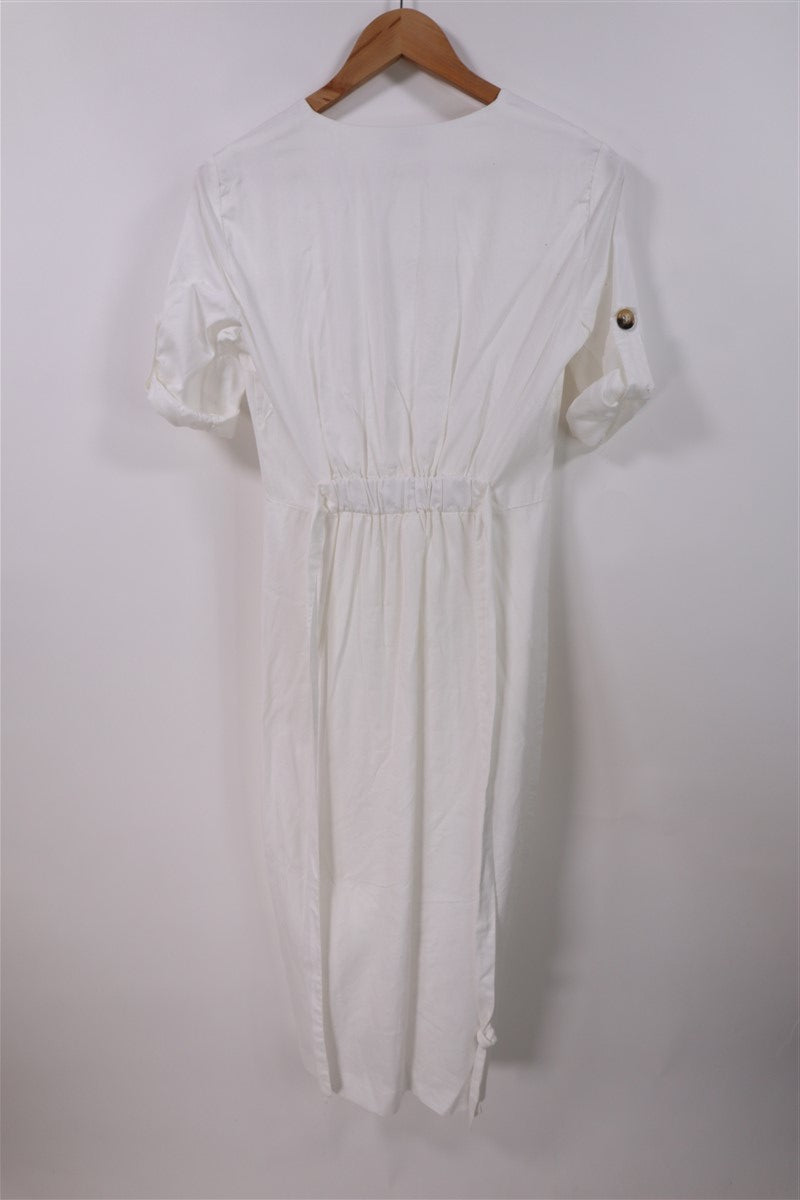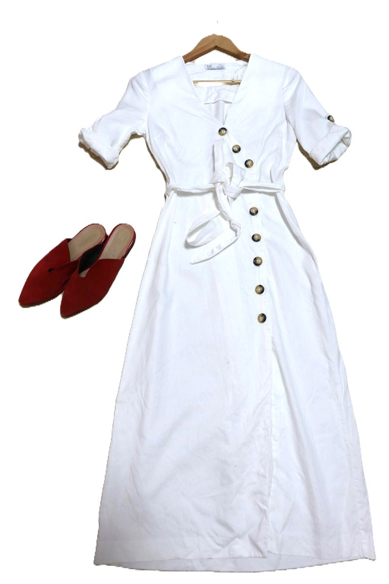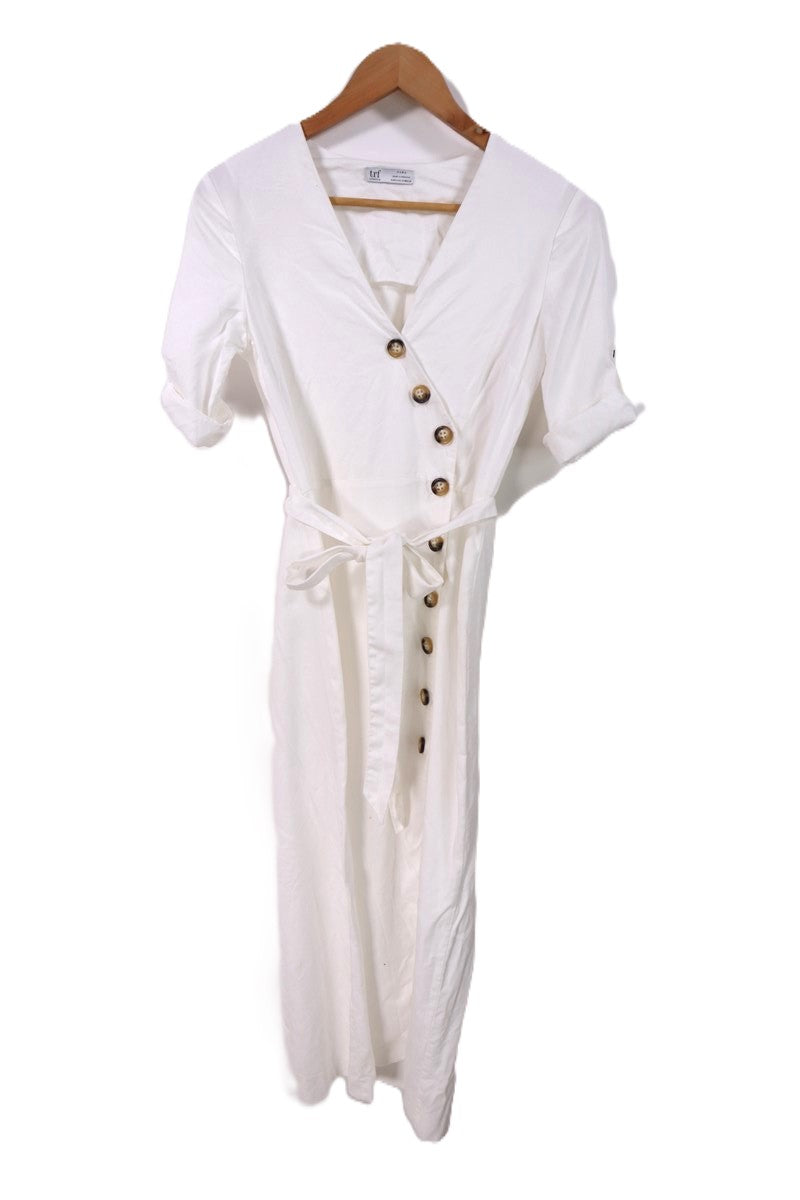 שמלה טרנדית ומעוצבת עם סגירת כפתורים וחגורת קשירה במותן בצבע לבן צח של המותג