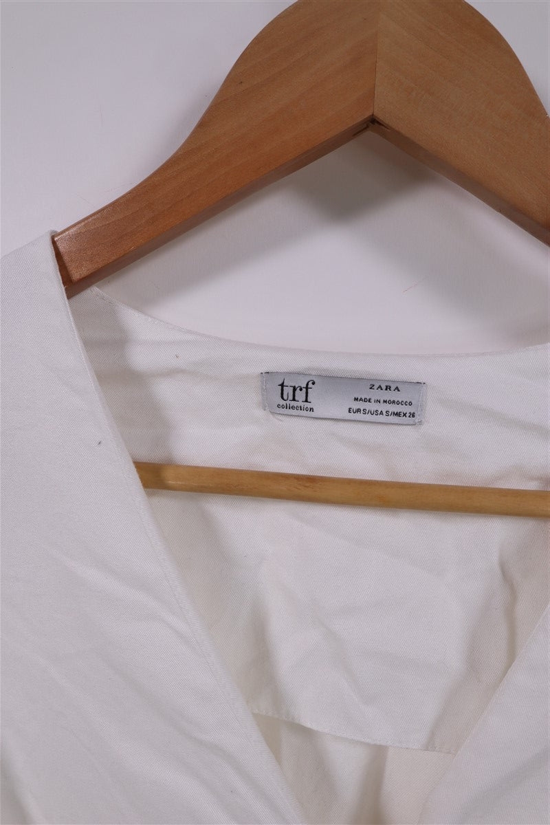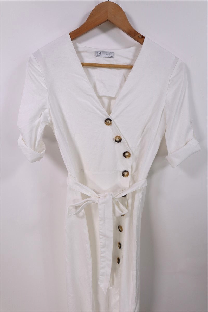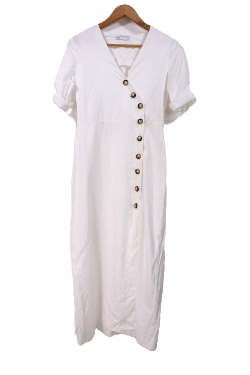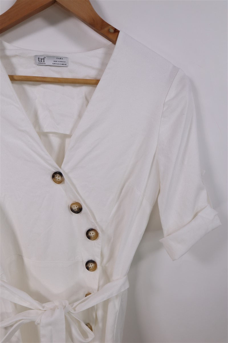 שמלה טרנדית ומעוצבת עם סגירת כפתורים וחגורת קשירה במותן בצבע לבן צח של המותג
