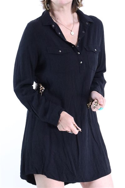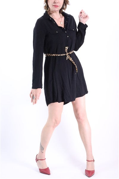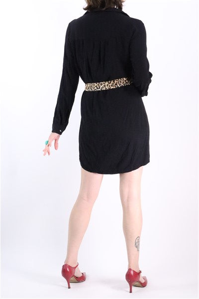 שמלה שחורה בגזרה נשפכת עם חגורת קשירה מנומרת וצווארון עליון. כפתורי תיק תק.