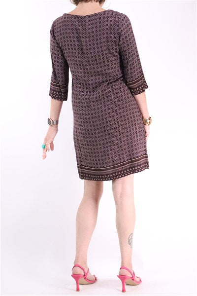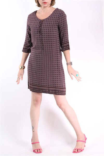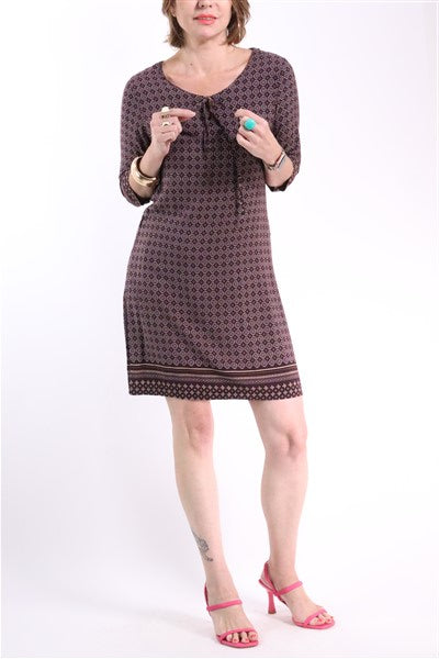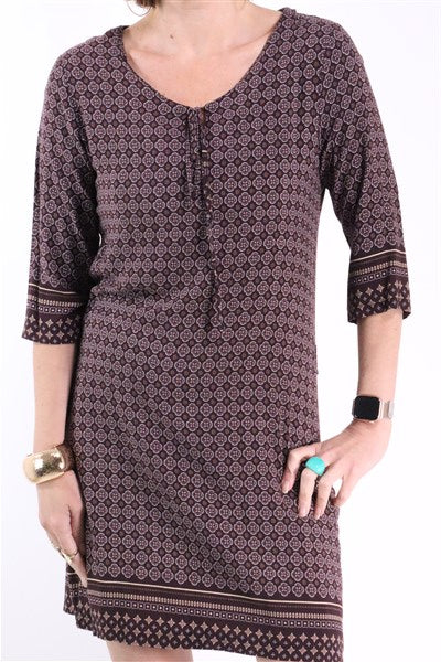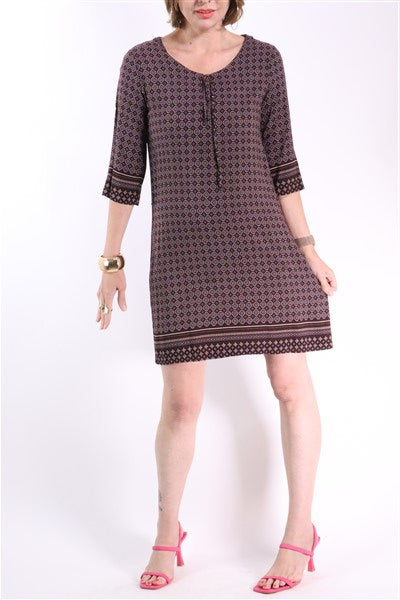 שמלת קזואל נשפכת בסטייל אתני בגווני חום בורדו עם קשירה עליונה וקדמית.