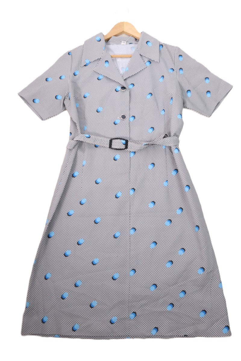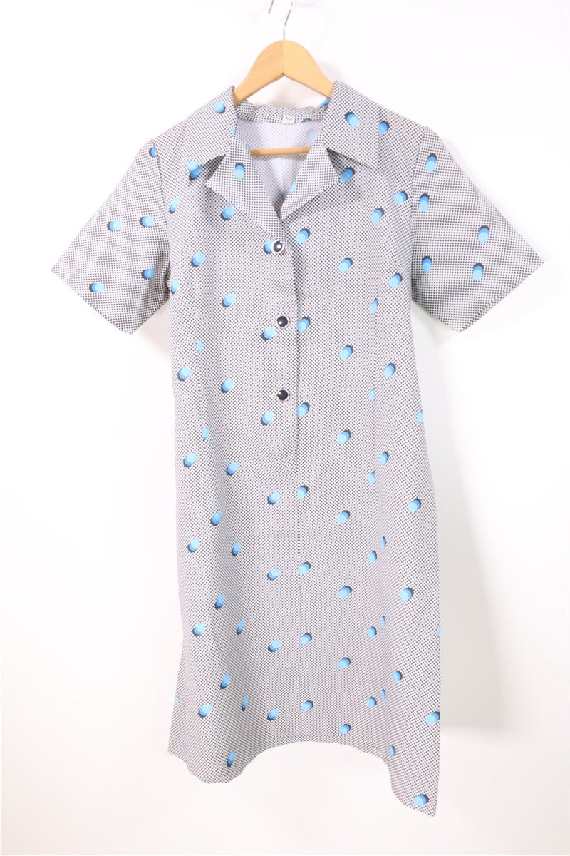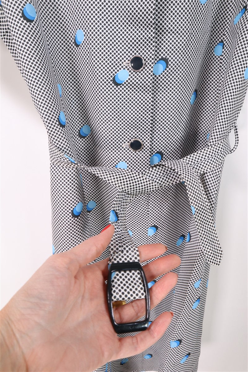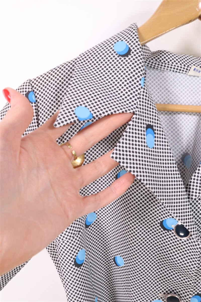 שמלת ויניטג מהפנטת בסגנון מנוקד עם פרינט בגדלים שונים בכחול שחור ולבן שלוקטה באירופה במיוחד ע"י הסטייליסטית שלנו