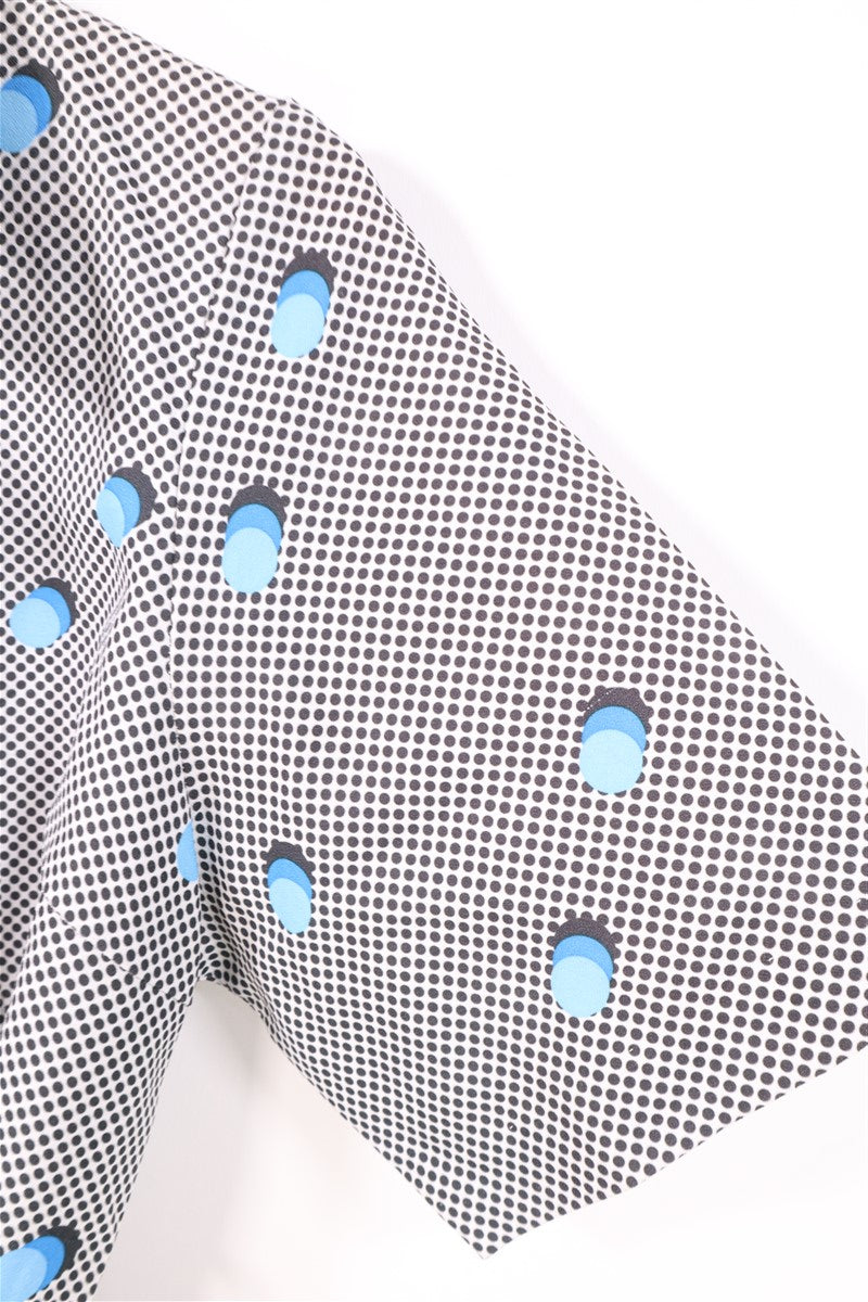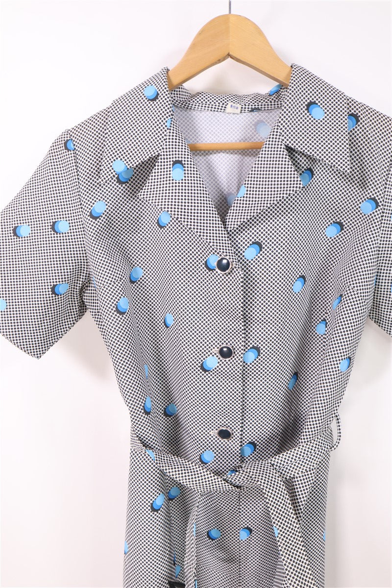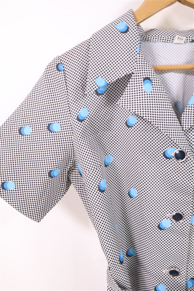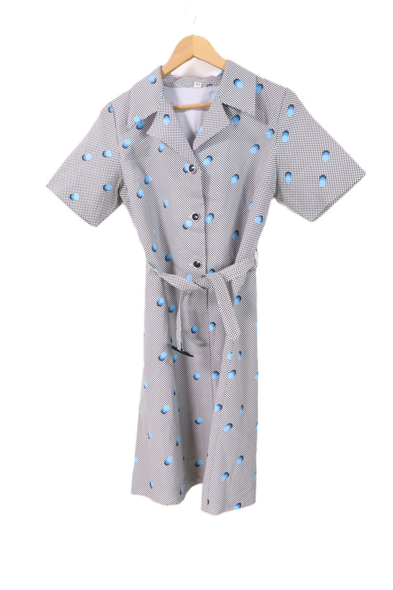 שמלת ויניטג מהפנטת בסגנון מנוקד עם פרינט בגדלים שונים בכחול שחור ולבן שלוקטה באירופה במיוחד ע"י הסטייליסטית שלנו