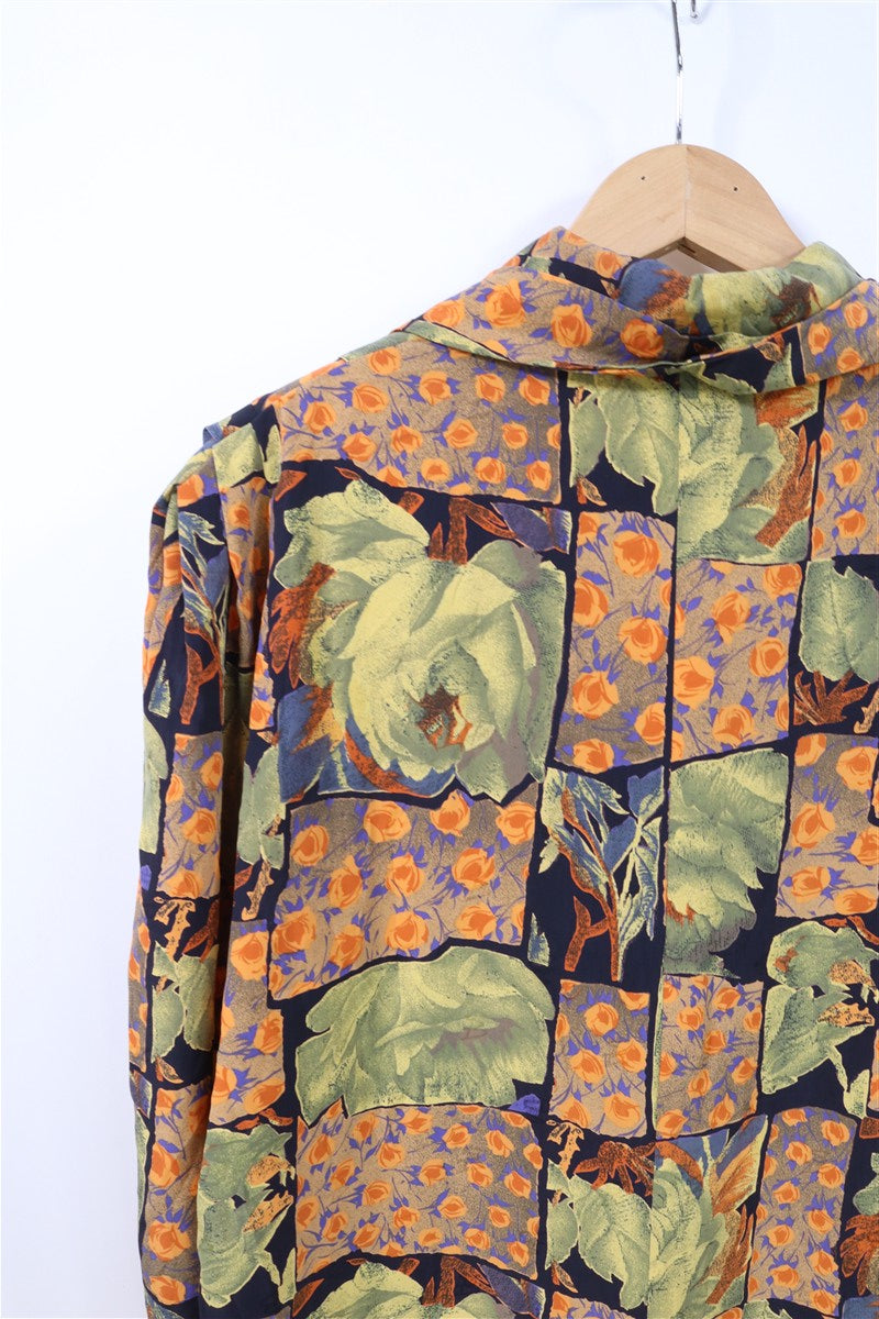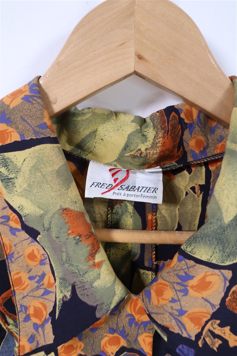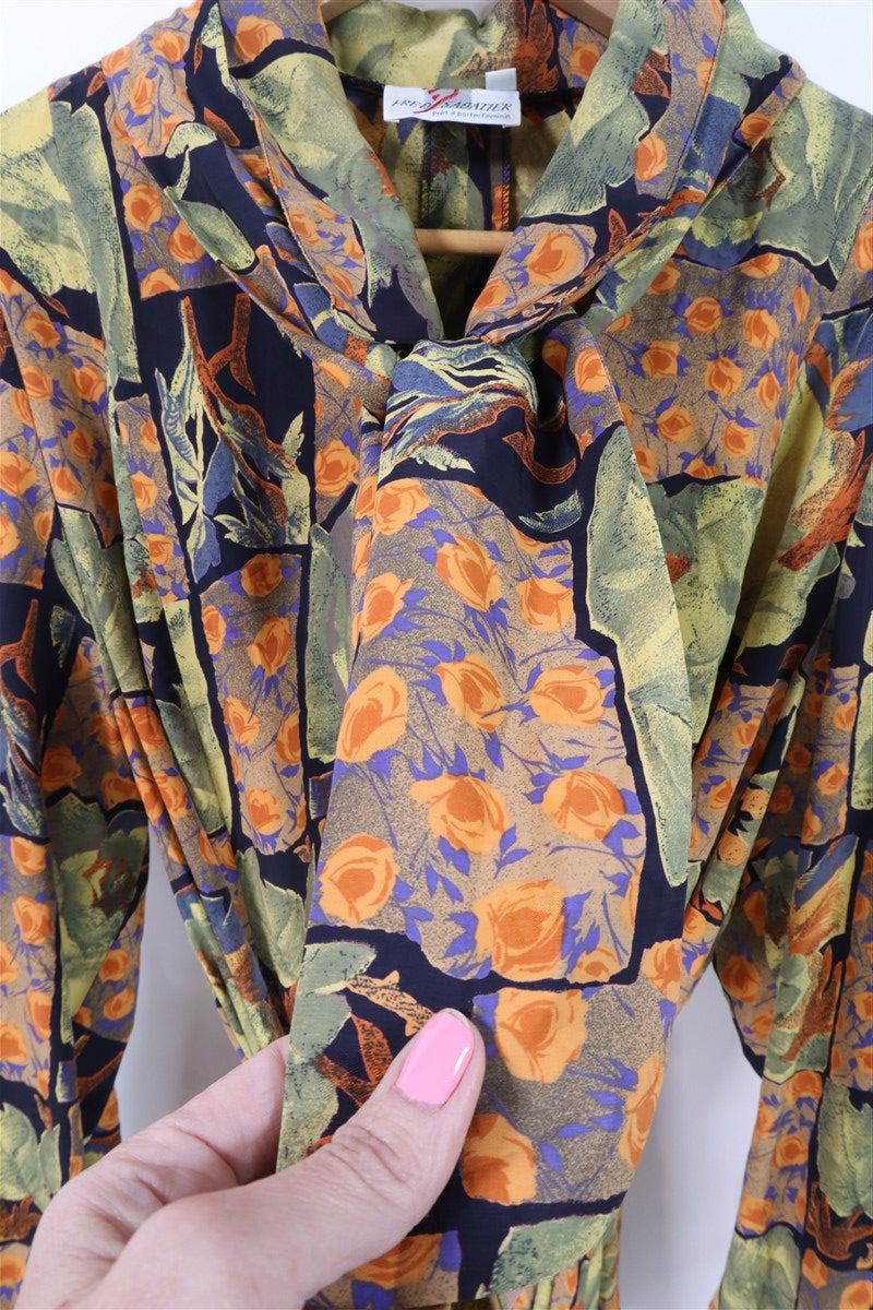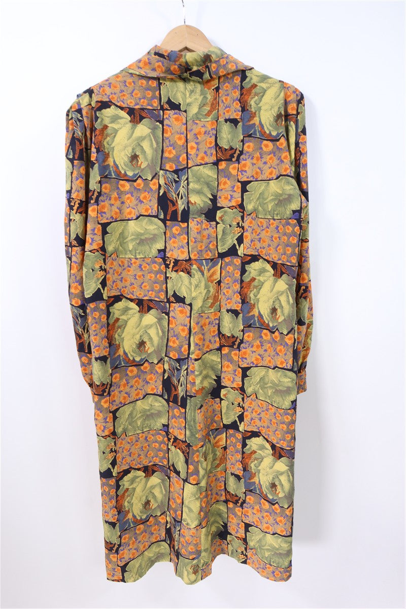 הפרינט בגווני חום ירוק שחור וכחול עם עניבת קשירה בצווארון
