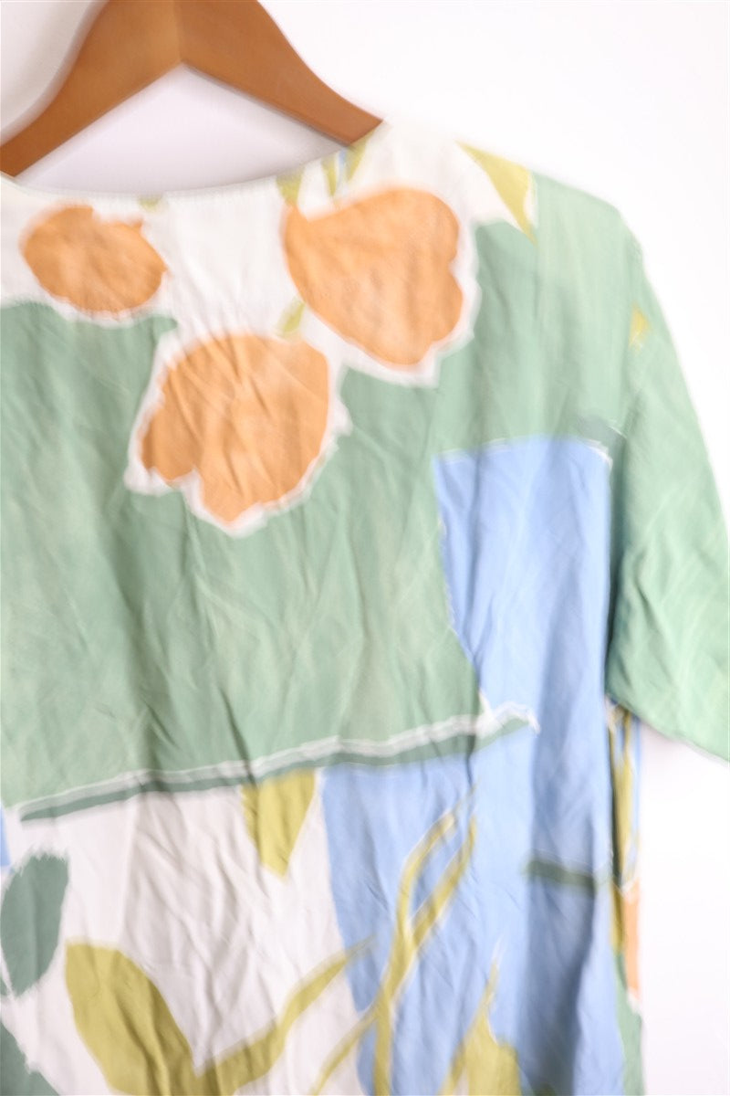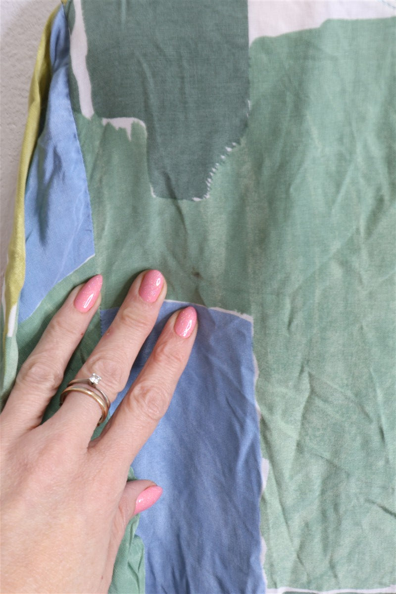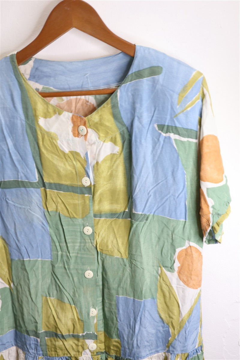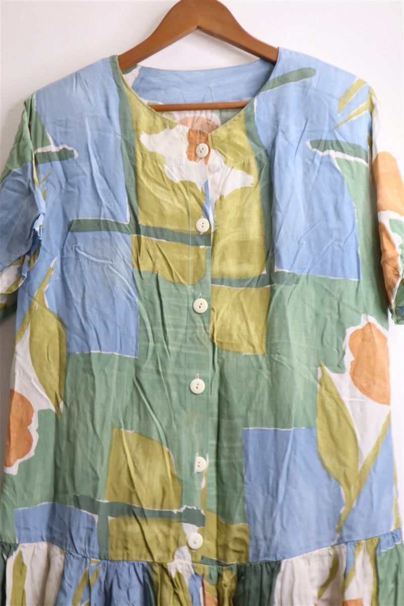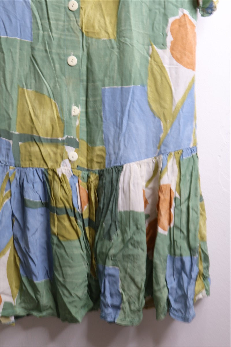 שמלת וינטג' צבעונית בגזרה ישרה עם חלק תחתון בסגנון מלמלה, מבד כותנה טבעי במגע ושילוב כפתורים גדולים בחזית, לוקטה במיוחד על ידי הסטייליסטית של החנות בחו"ל בסגנון וינטג' ספרדי.