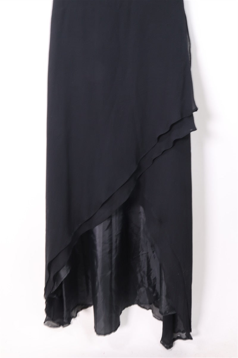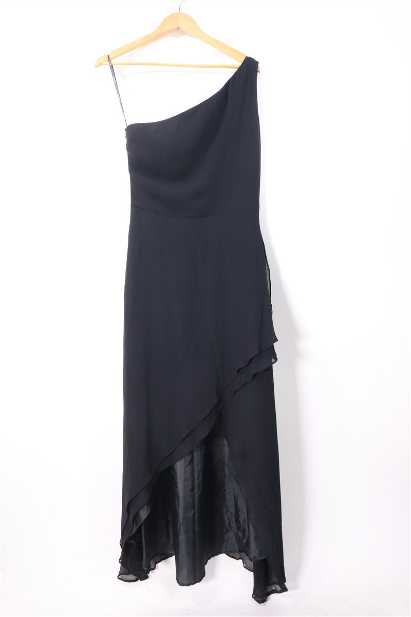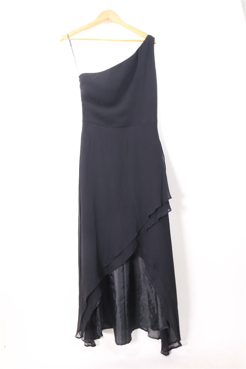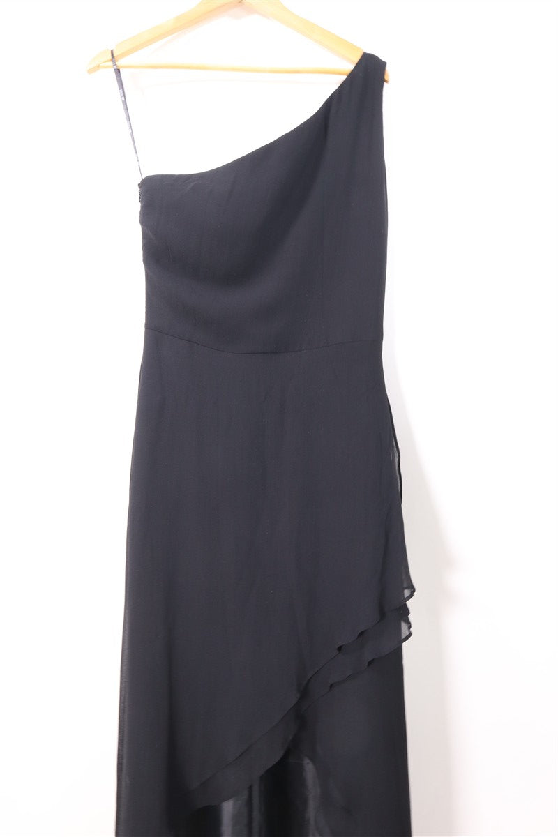 חלק עליון עם כתף אחת וגזרה נשפכת בשכבות שיפון ובד מבריק ומפתח רגליים קדמי בקומות בחלק התחתון