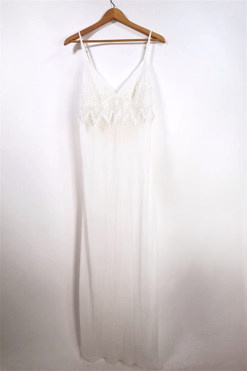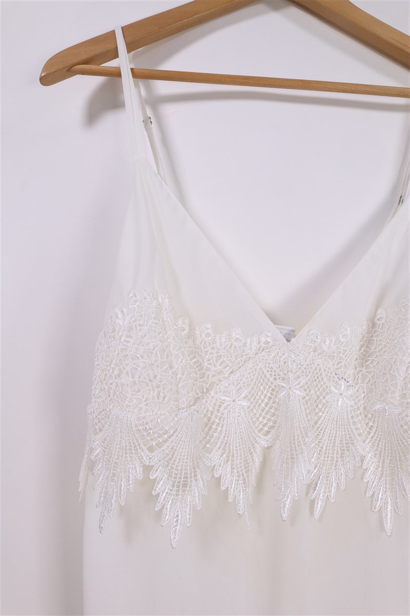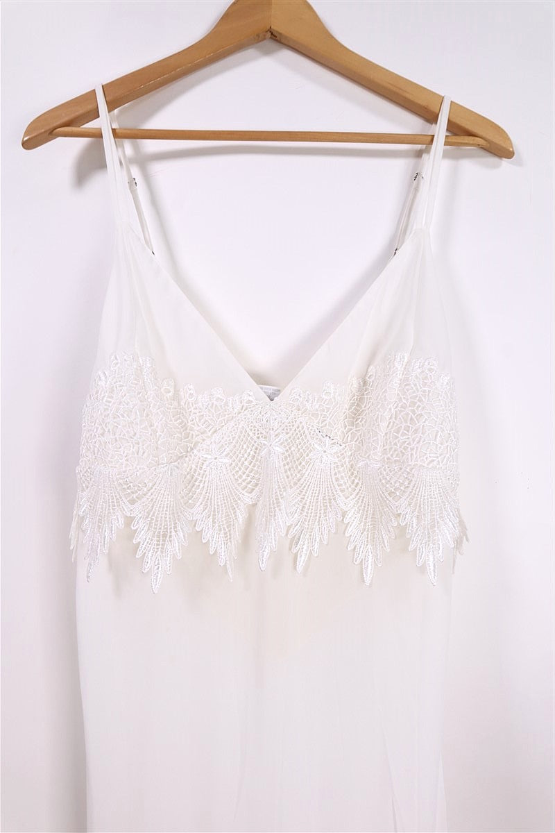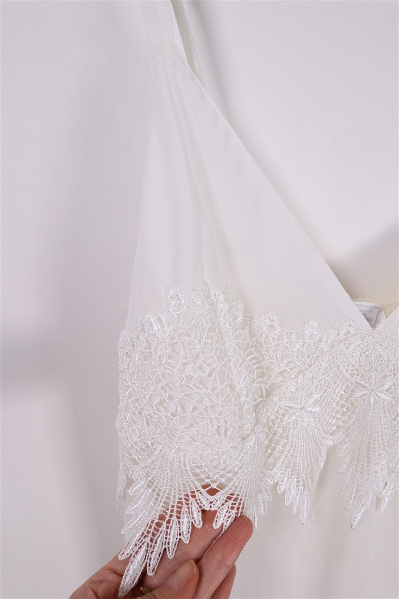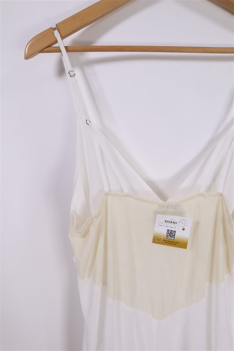 שמלת קומבינזון בצבע שמנת לבן במרקם שיפון עם סיומת קרושה תחרה למעלה ומפתח אחורי מעוצב.