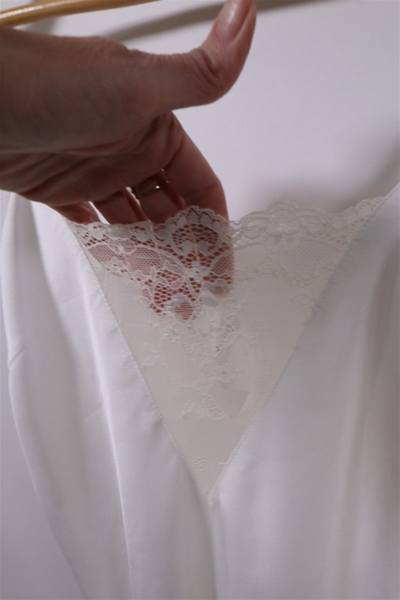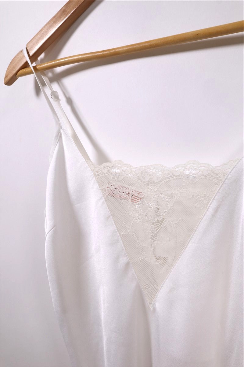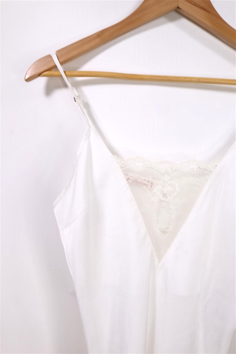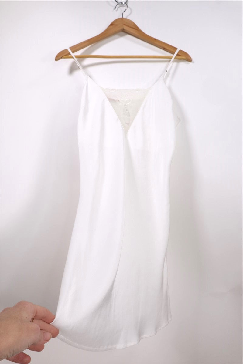 שמלת קומבינזון בצבע שמנת לבן במרקם סטאן עם סיומת תחרה למעלה ומפתח אחורי מעוצב.