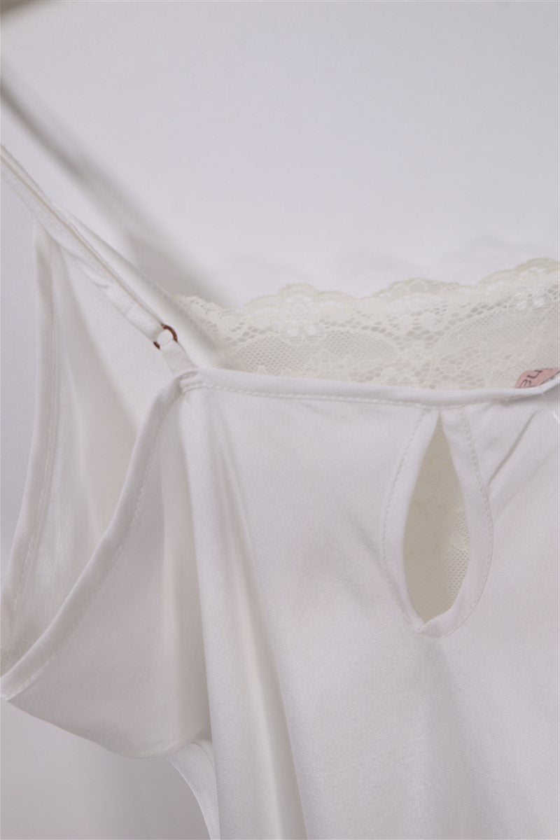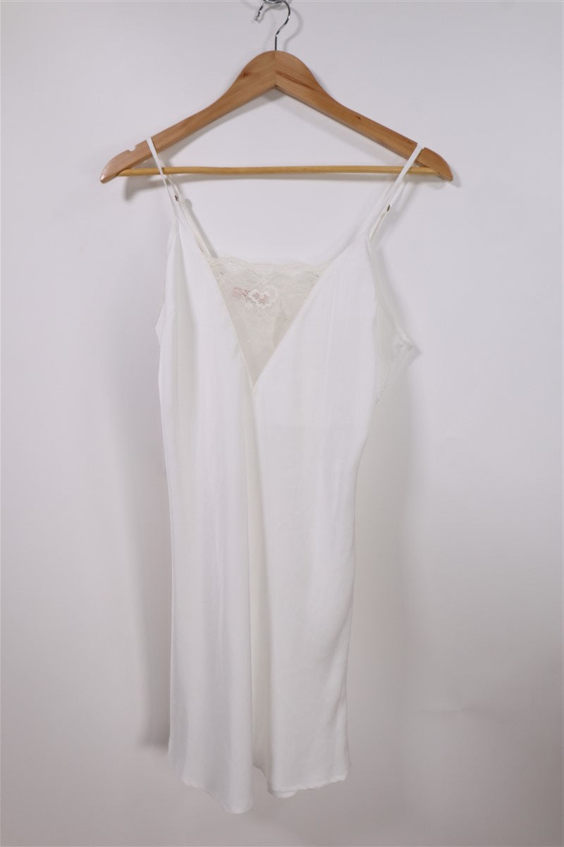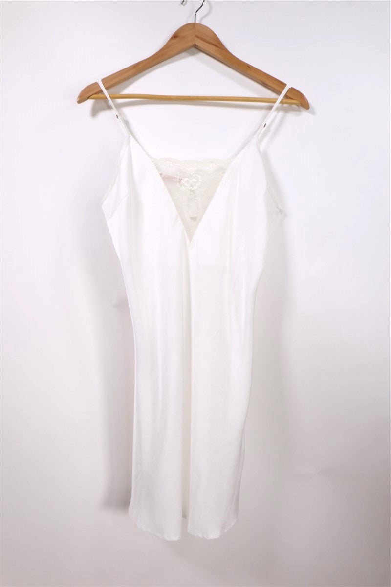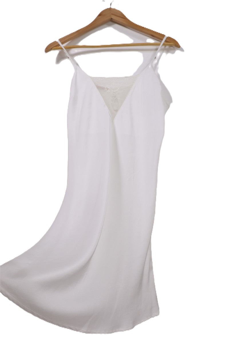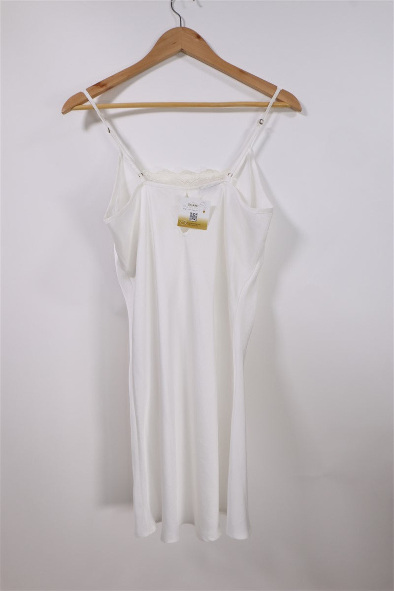 שמלת קומבינזון בצבע שמנת לבן במרקם סטאן עם סיומת תחרה למעלה ומפתח אחורי מעוצב.